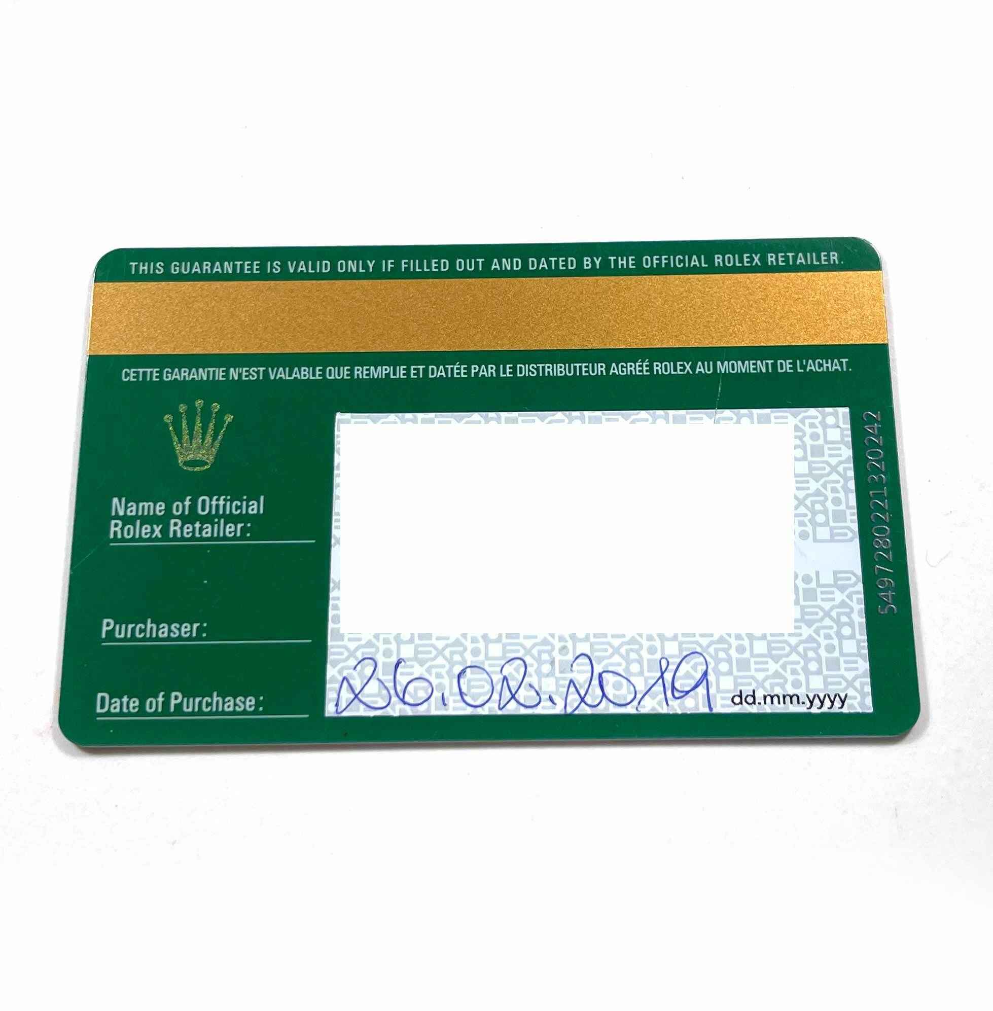 THIS ROLEX IS IN SUPER CONDITION AND COMES WITH ITS BOX, BOOKLETS, GREEN HANG TAG, AND WARRANTY CARD DATED FEBRUARY 26TH, 2019 AS SHOWN IN THE PICTURES ATTACHED. THIS WATCH IS IN STOCK AND AVAILABLE TO SHIP IMMEDIATELY!
