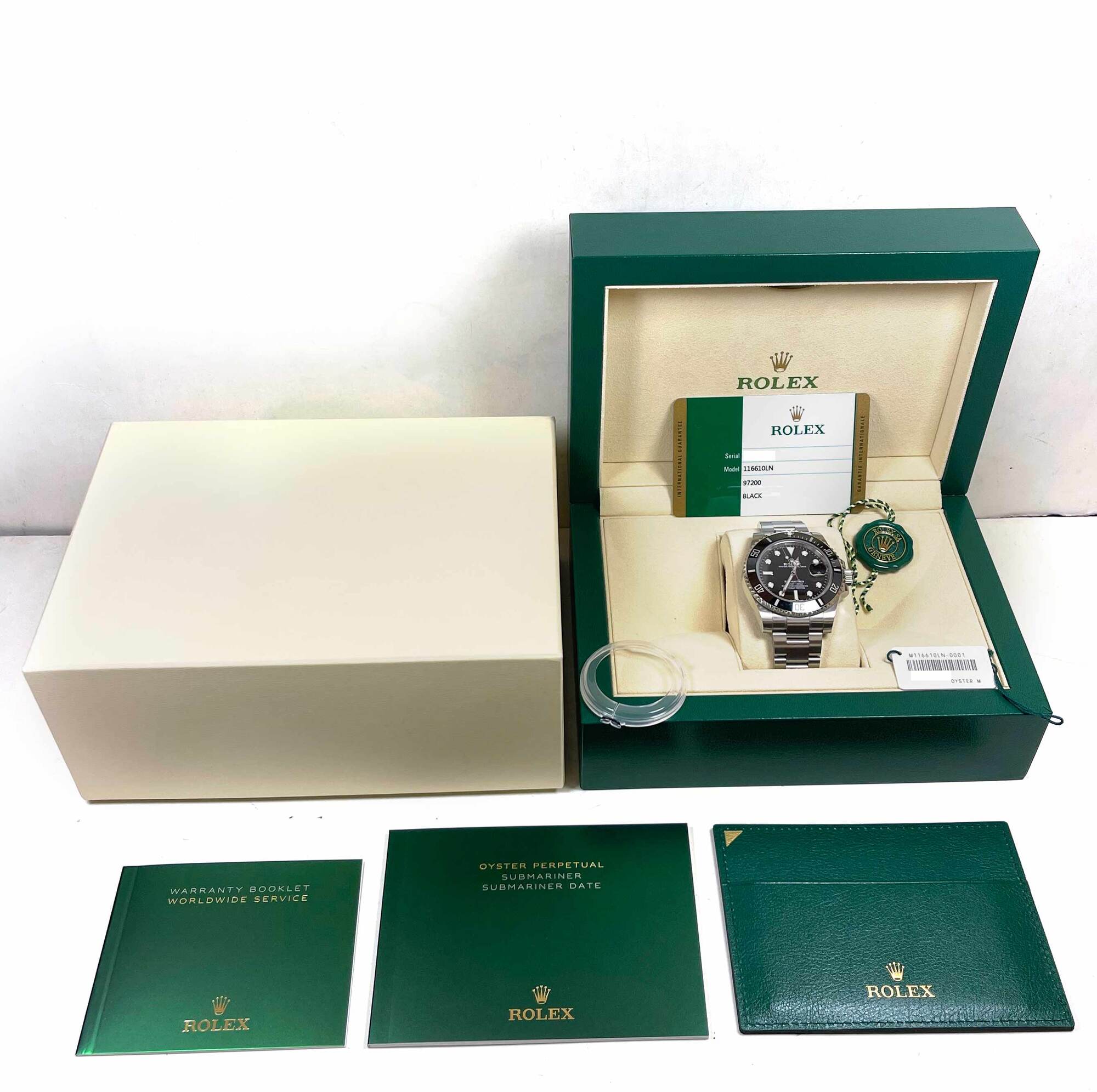 this rolex is in great overall condition and comes with its box, booklets, bezel protector, both hang tags, and warranty card dated march 21st, 2019 as shown in the pictures attached. This watch is in stock and available to ship immediately!