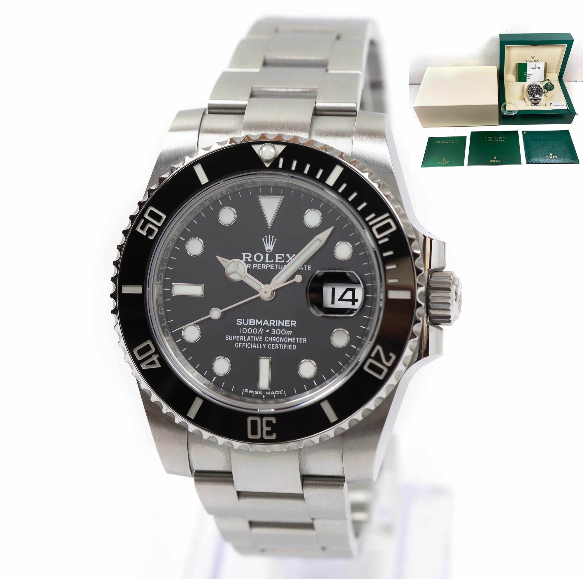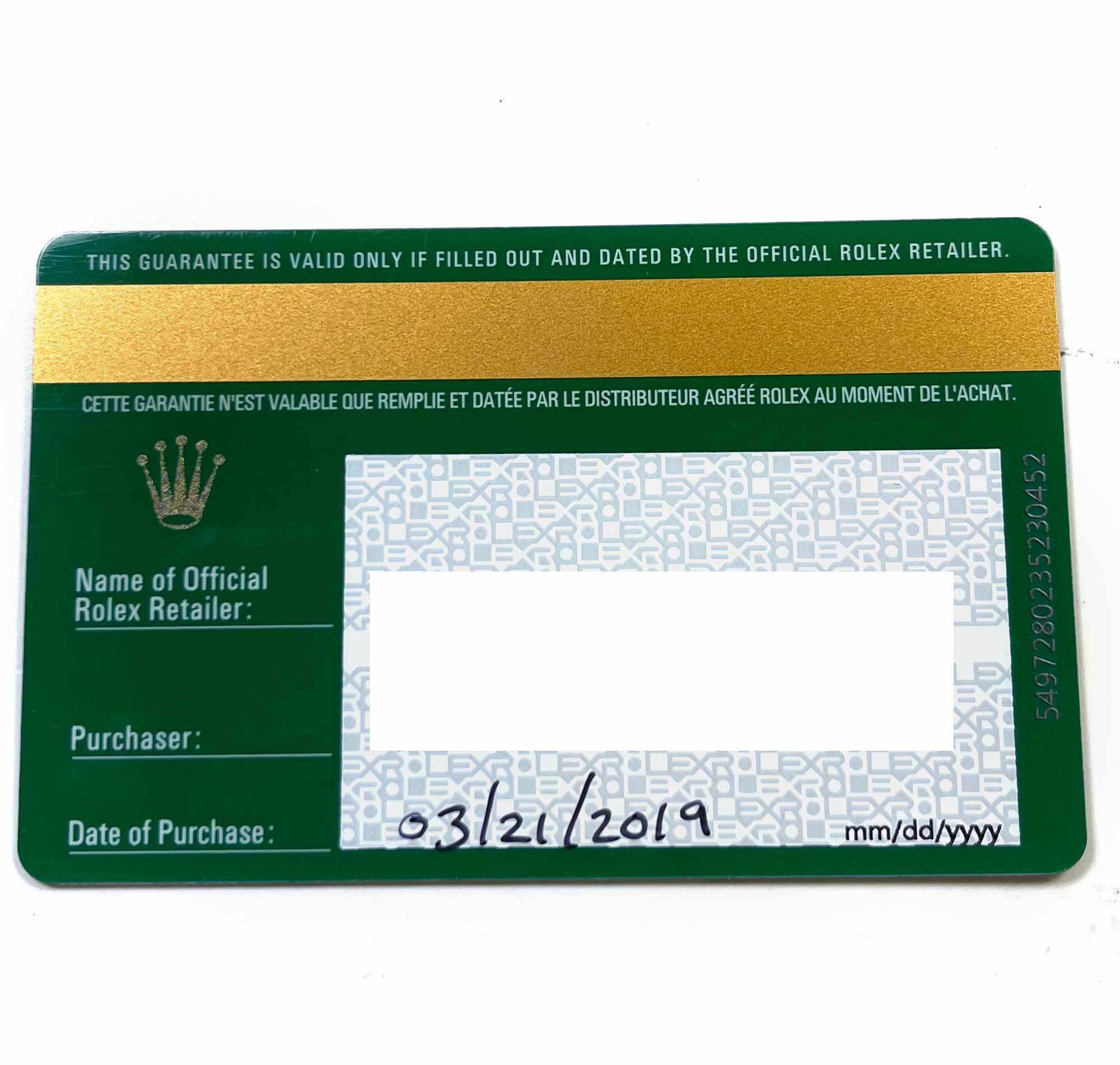 THIS ROLEX IS IN GREAT OVERALL CONDITION AND COMES WITH ITS BOX, BOOKLETS, BEZEL PROTECTOR, BOTH HANG TAGS, AND WARRANTY CARD DATED MARCH 21ST, 2019 AS SHOWN IN THE PICTURES ATTACHED. THIS WATCH IS IN STOCK AND AVAILABLE TO SHIP IMMEDIATELY!