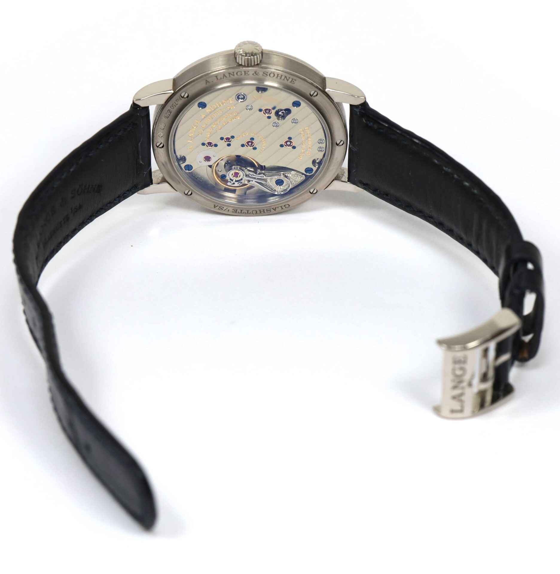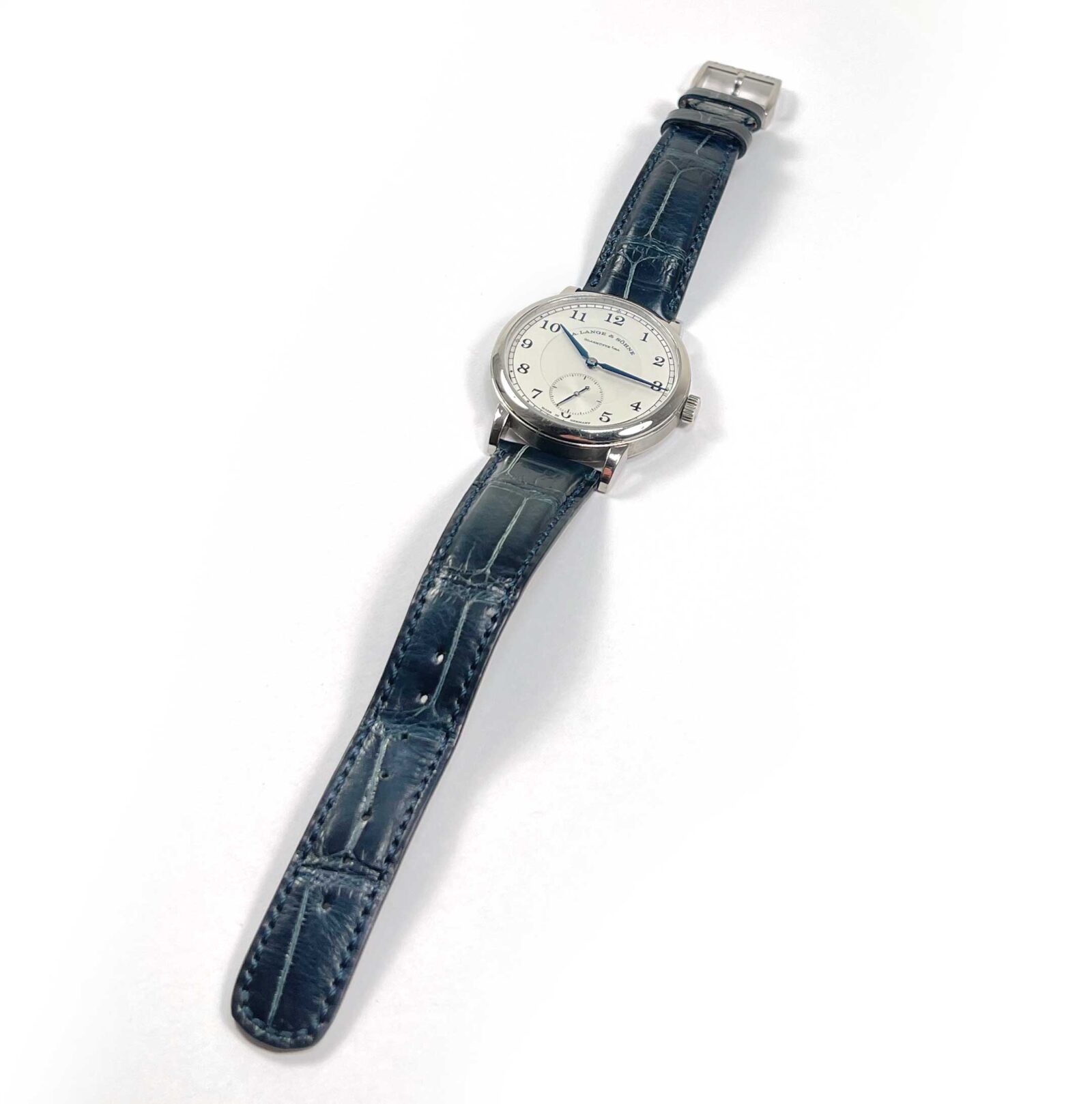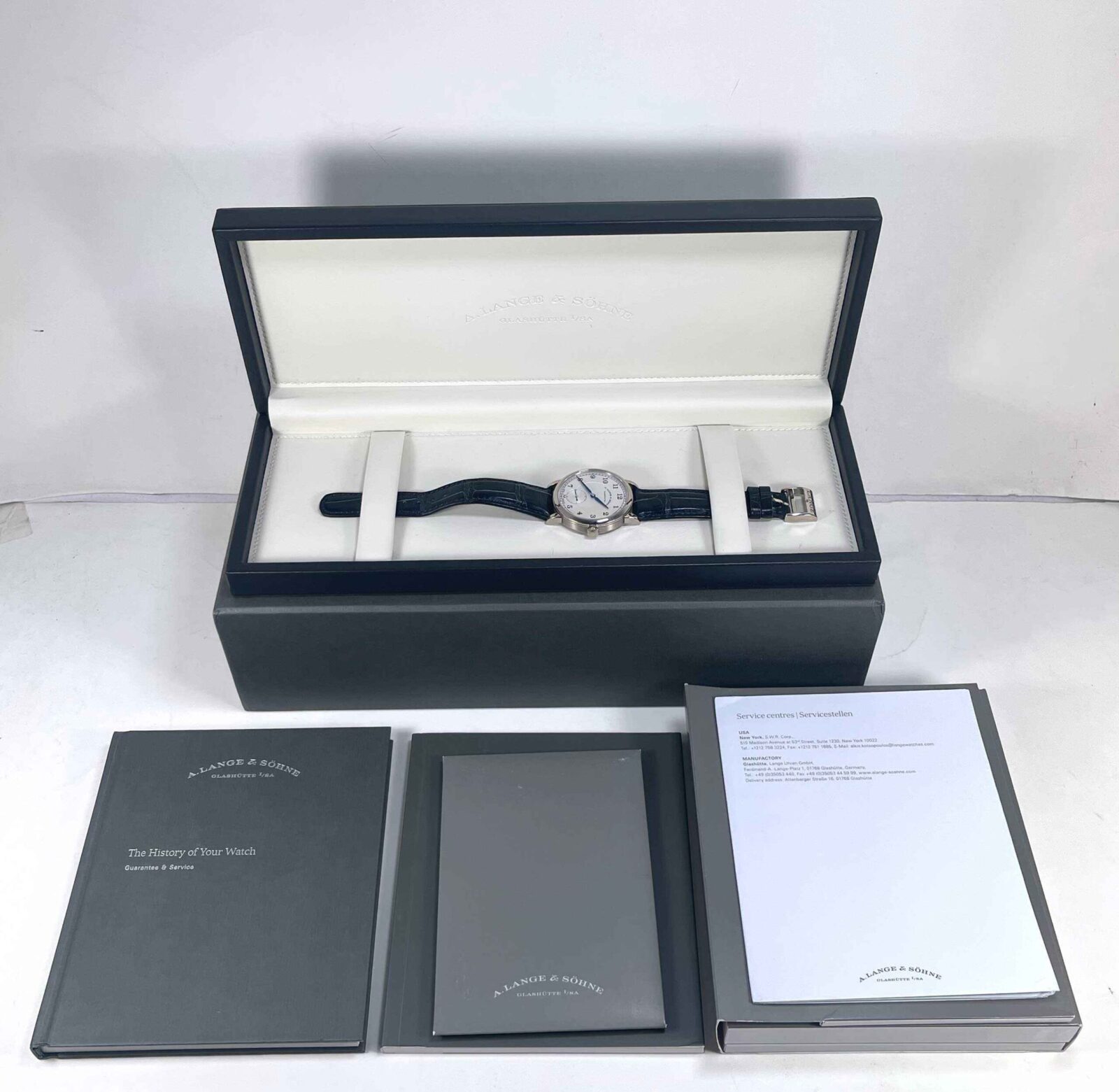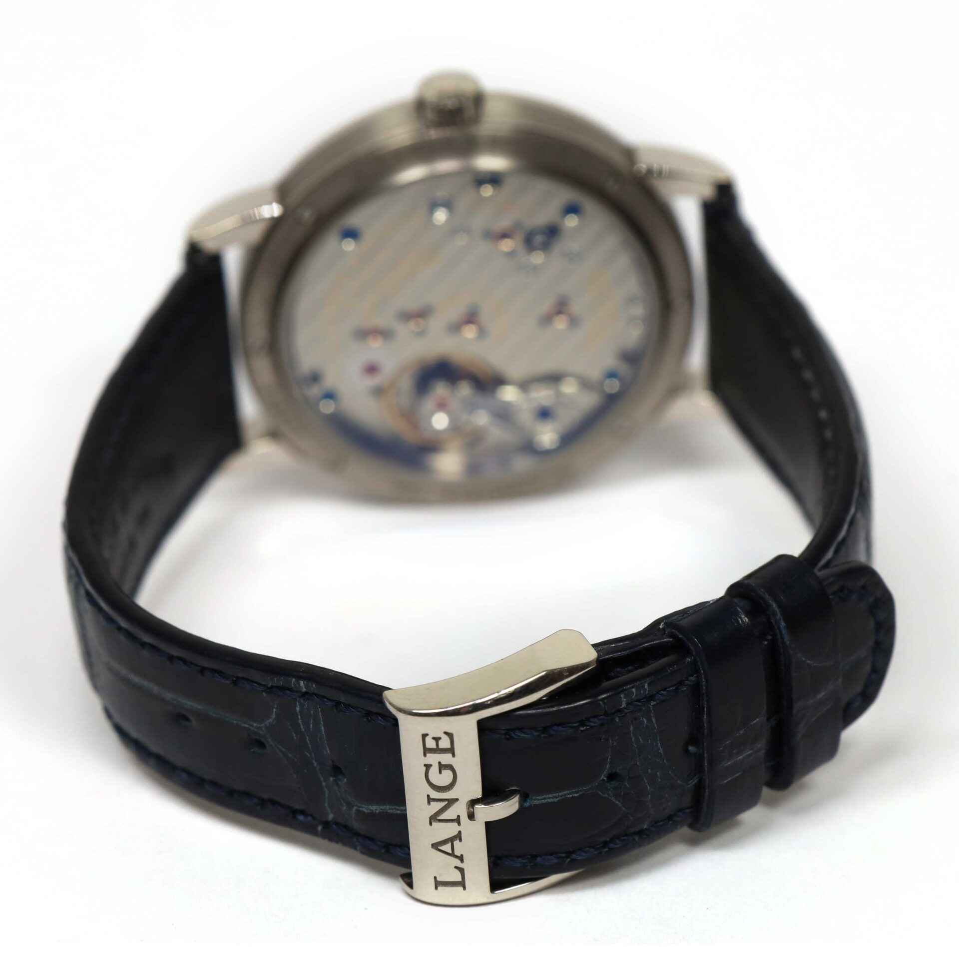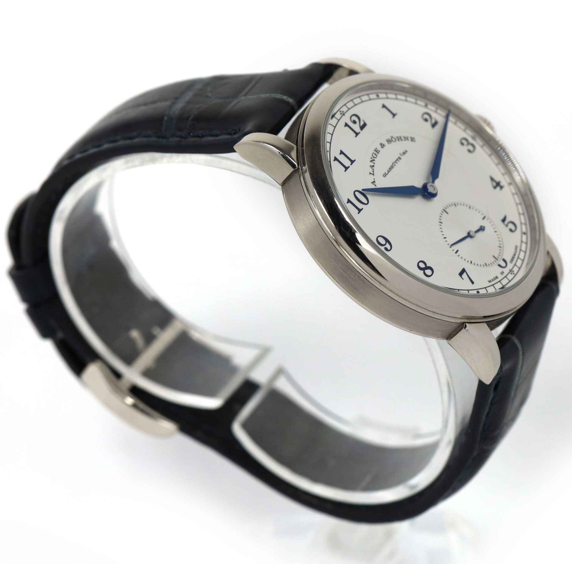 Read Morethis a. Lange & söhne is in excellent condition and comes with its box, papers, microfiber cloth, and warranty booklet dated october 11th, 2020. This watch features a white gold case that surrounds a silver dial with blue hour/minute/second hands and comes on a blue leather strap as shown in the photos attached. This watch is in stock and available to ship immediately!