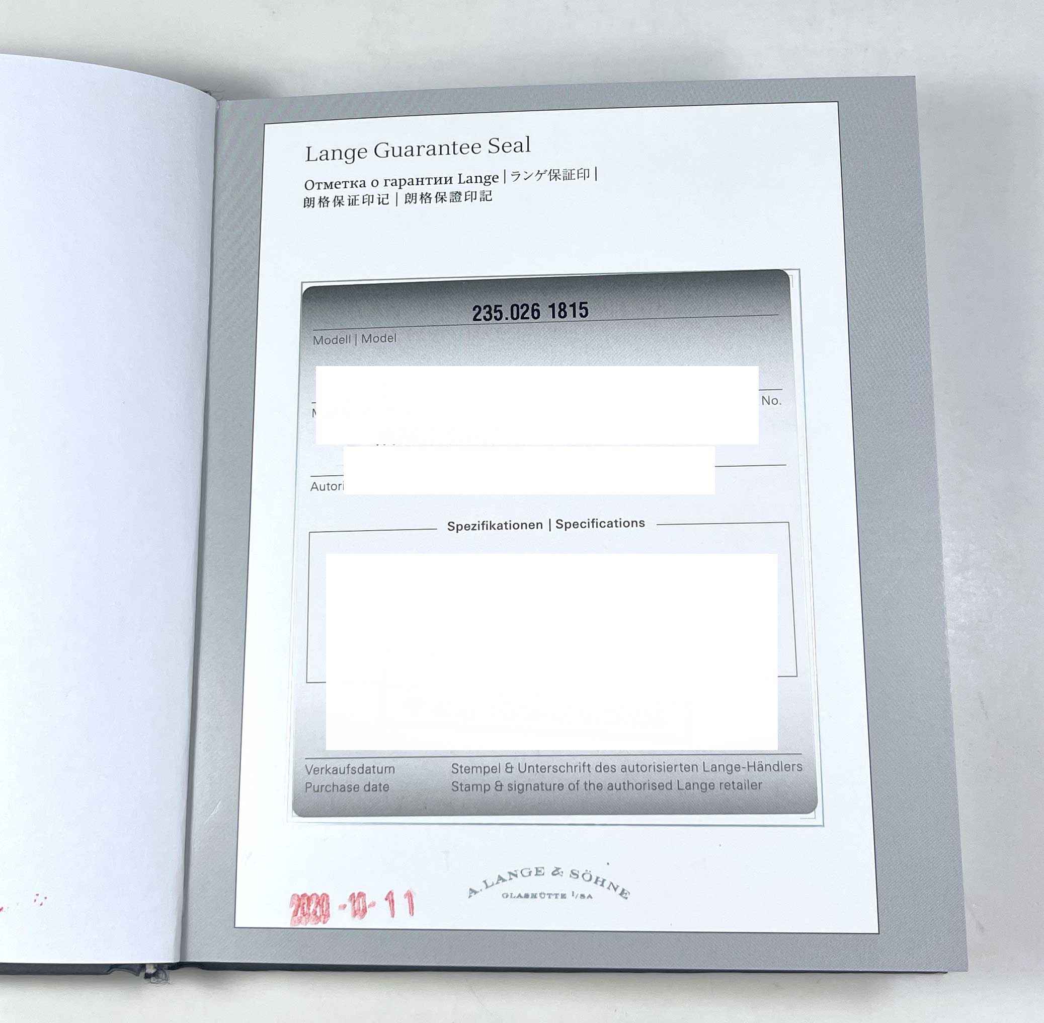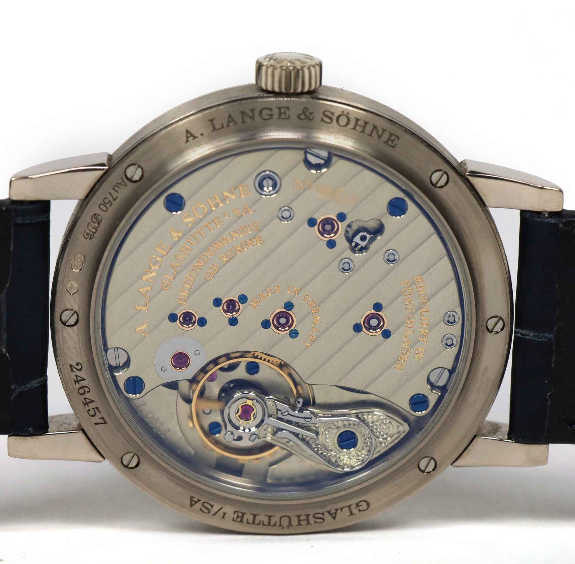 This A. Lange & Söhne is in excellent condition and comes with its box, papers, microfiber cloth, and warranty booklet dated October 11th, 2020. This watch features a white gold case that surrounds a silver dial with...