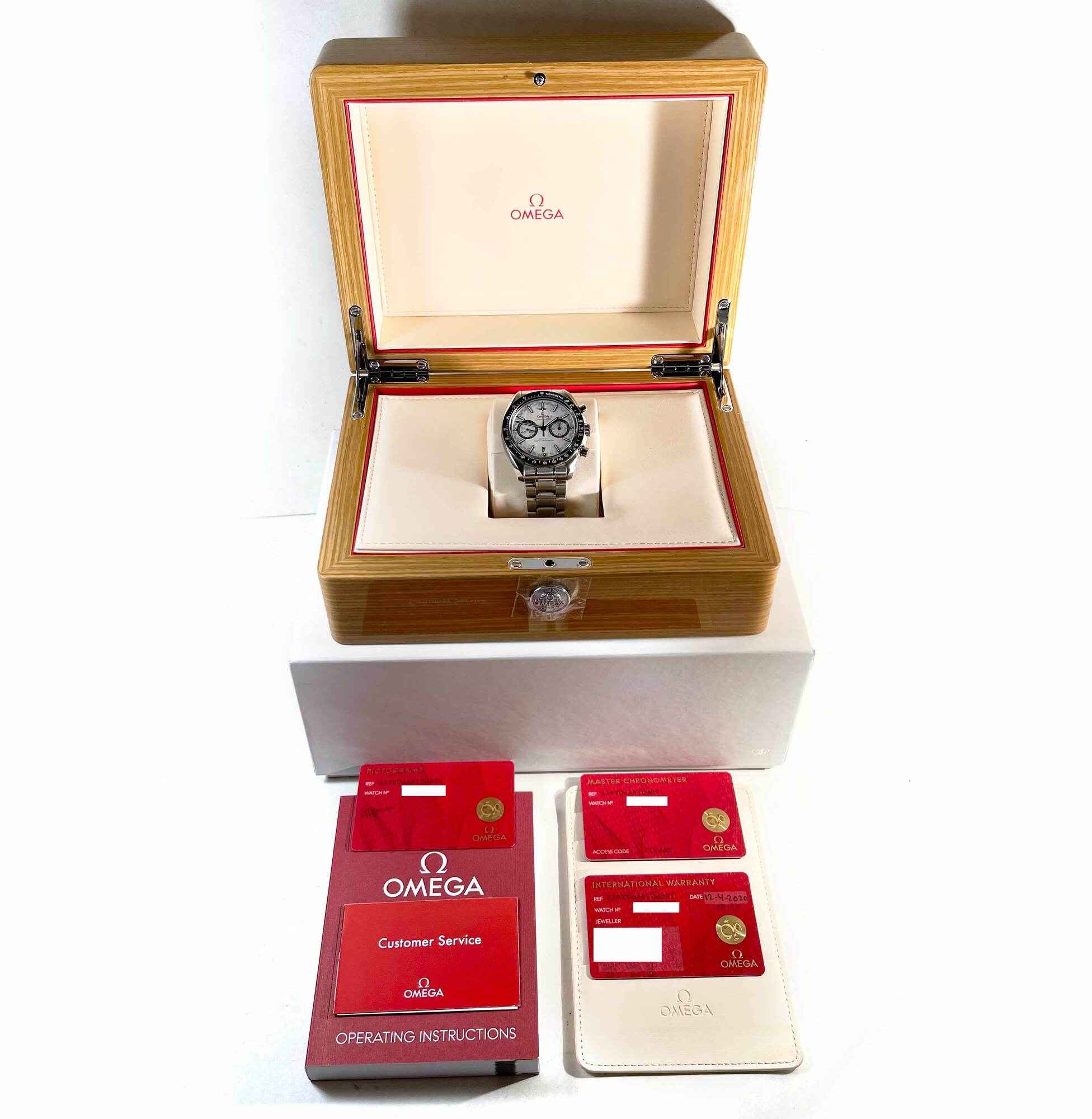 THIS OMEGA IS IN EXCELLENT OVERALL CONDITION AND COMES WITH ITS BOX, BOOKLETS, AND WARRANTY CARDS DATED DECEMBER 4TH, 2020 AS SHOWN IN THE PICTURES ATTACHED. THIS WATCH FEATURES A 44MM STAINLESS STEEL CASE THAT SURROUNDS A WHITE DIAL WITH A BLACK CERAMIC BE...