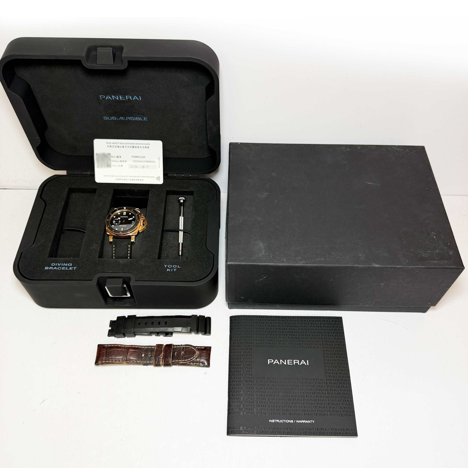 this panerai submersible watch comes with its box, booklets, two extra straps, panerai tool, and warranty card dated october 7th, 2020. The photos shown are of the exact watch being sold and accurately represent its condition. This watch is in stock and ready to ship immediately!