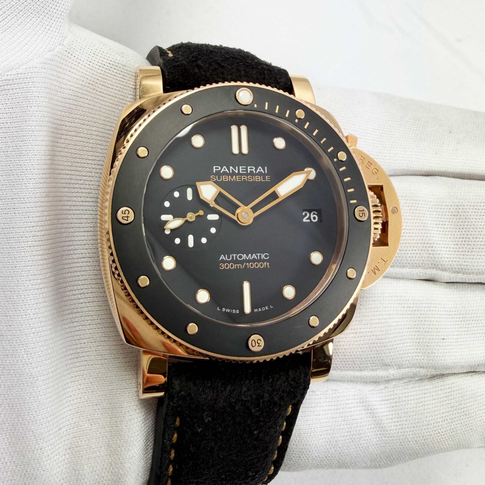 This Panerai Submersible watch comes with its box, booklets, two extra straps, Panerai tool, and warranty card dated October 7th, 2020. The photos shown are of the exact watch being sold and accurately represent its condition. This watch is in stock and rea...