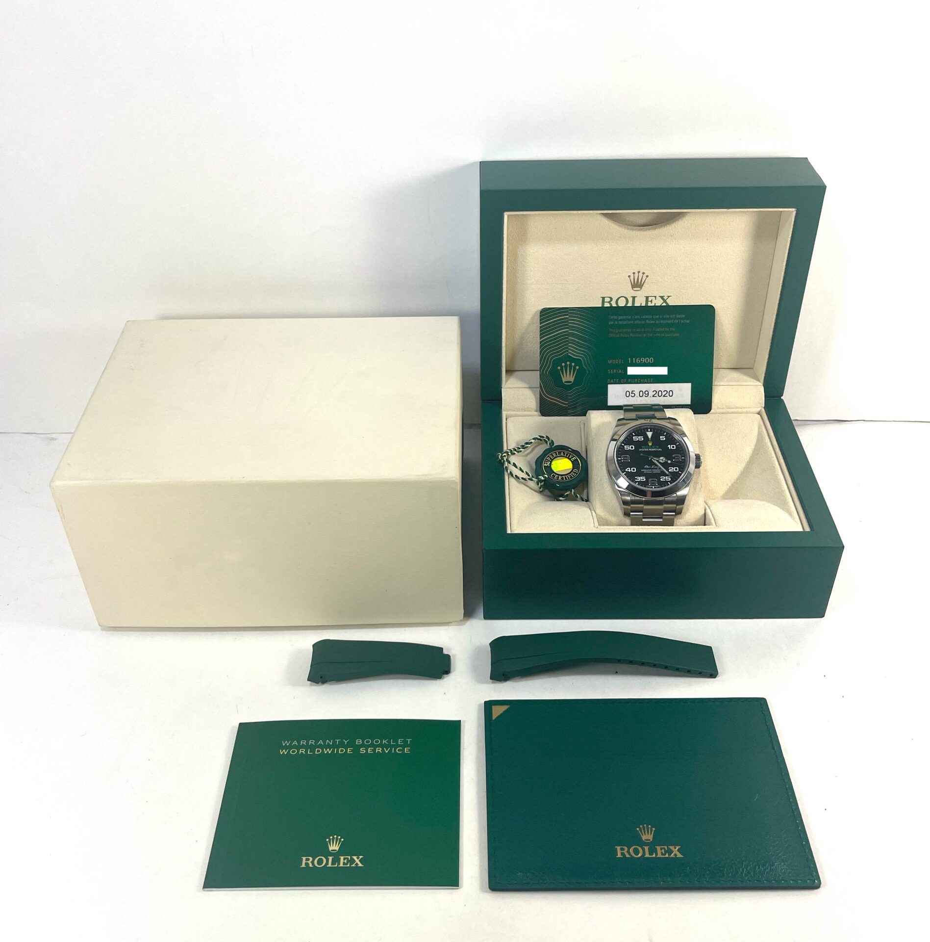 this rolex is in excellent condition and comes with box, papers, hang tag, one spare green rubber strap, and warranty card dated may 9th, 2020. This watch is in stock and available to ship immediately!