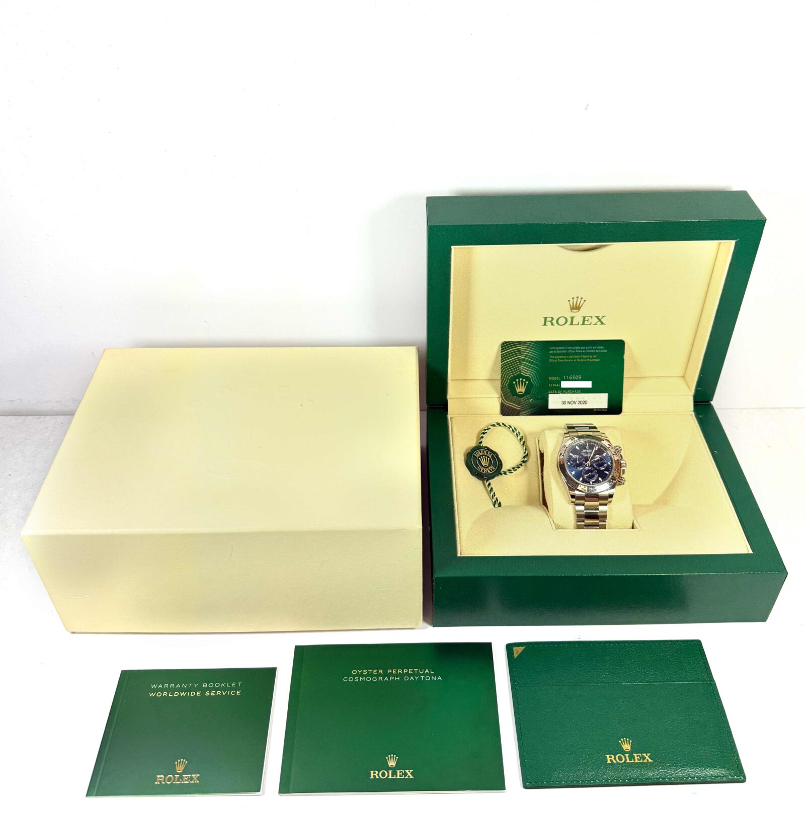 THIS ROLEX DAYTONA IS IN EXCELLENT CONDITION AND COMES WITH ITS BOX, BOOKLETS, GREEN HANG TAG, AND WARRANTY CARD DATED NOVEMBER 30TH, 2020 AS SHOWN IN THE PICTURES ATTACHED. THIS WATCH IS IN STOCK AND AVAILABLE TO SHIP IMMEDIATELY!