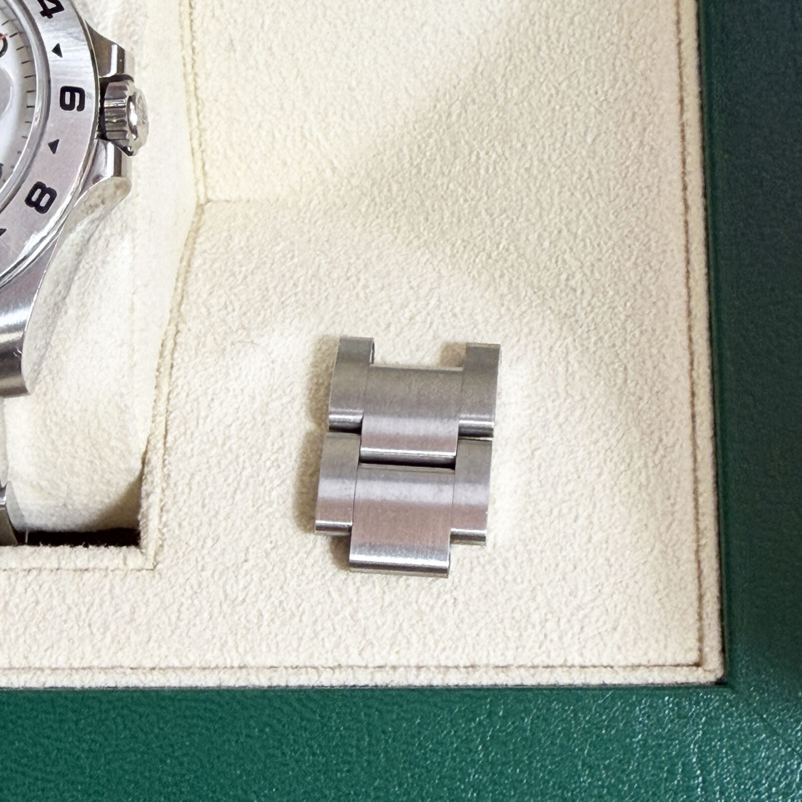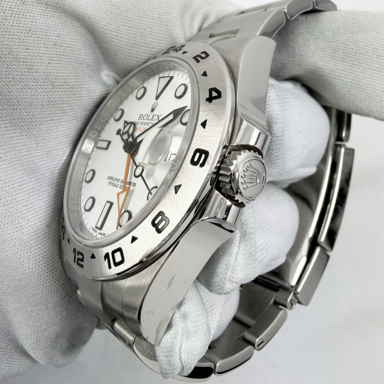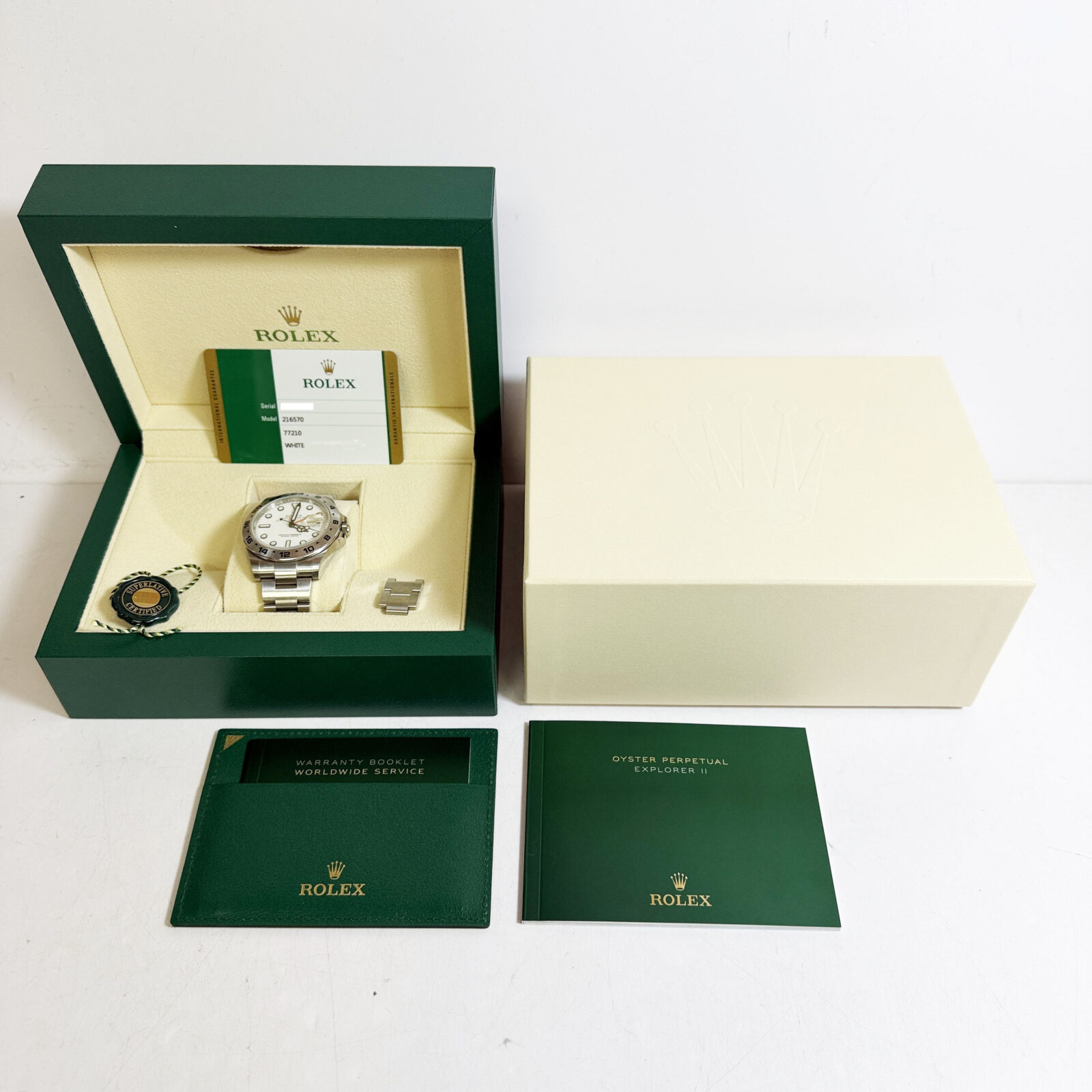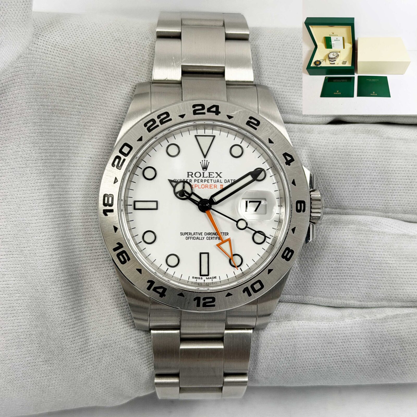 this rolex explorer ii watch comes with its box, hangtag, extra links, booklets, and warranty card dated february, 2020. The photos shown are of the exact watch being sold and accurately represent its condition. This watch is in stock and ready to ship immediately!