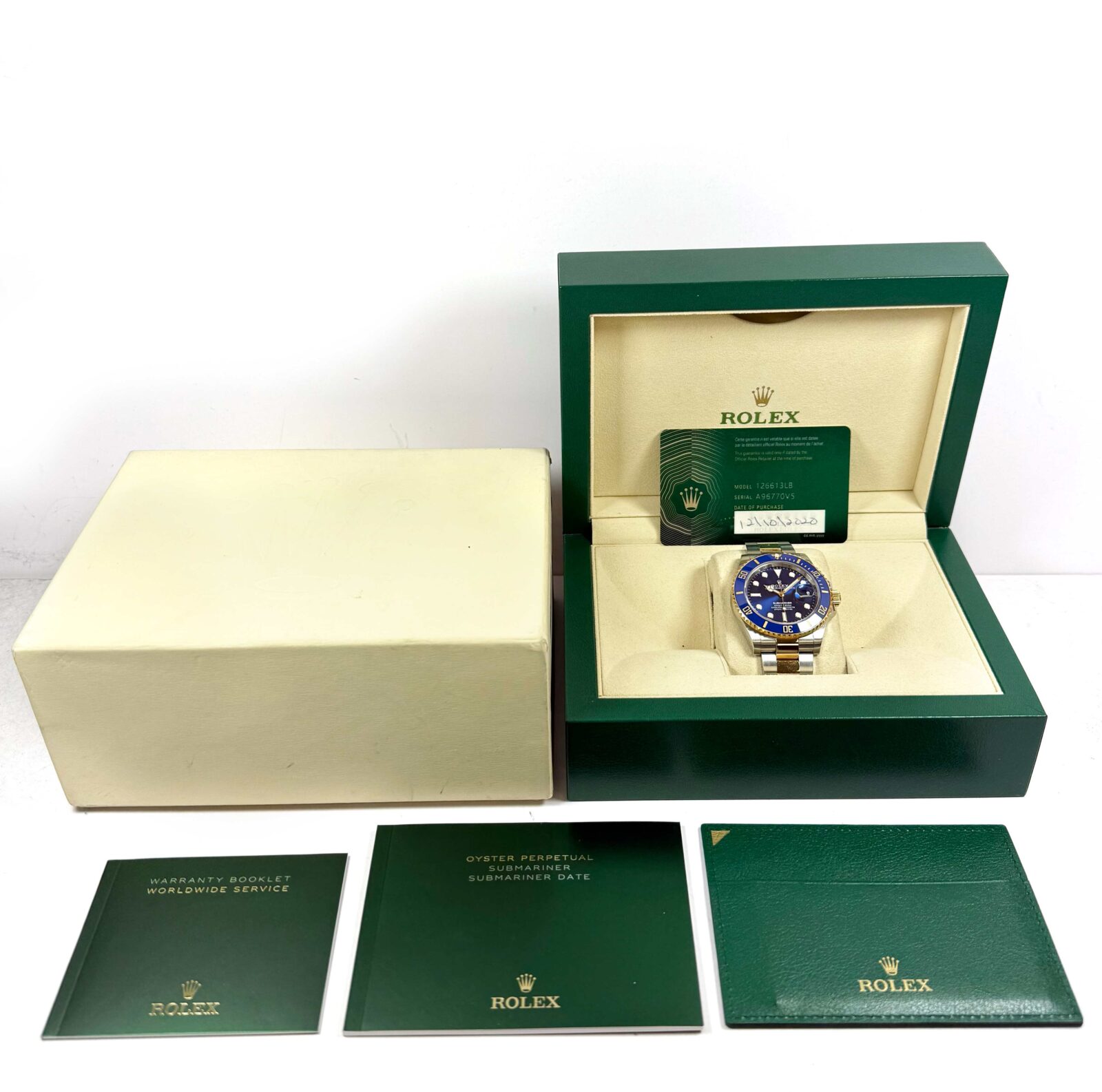 this rolex watch is in excellent overall condition showing some signs of surface wear consistent with preowned watches. This comes with its box, booklets, and warranty card dated october 12th, 2020 as shown in the pictures attached. Please note there is a small scratch on the cyclops. This watch is in stock and available to ship immediately!