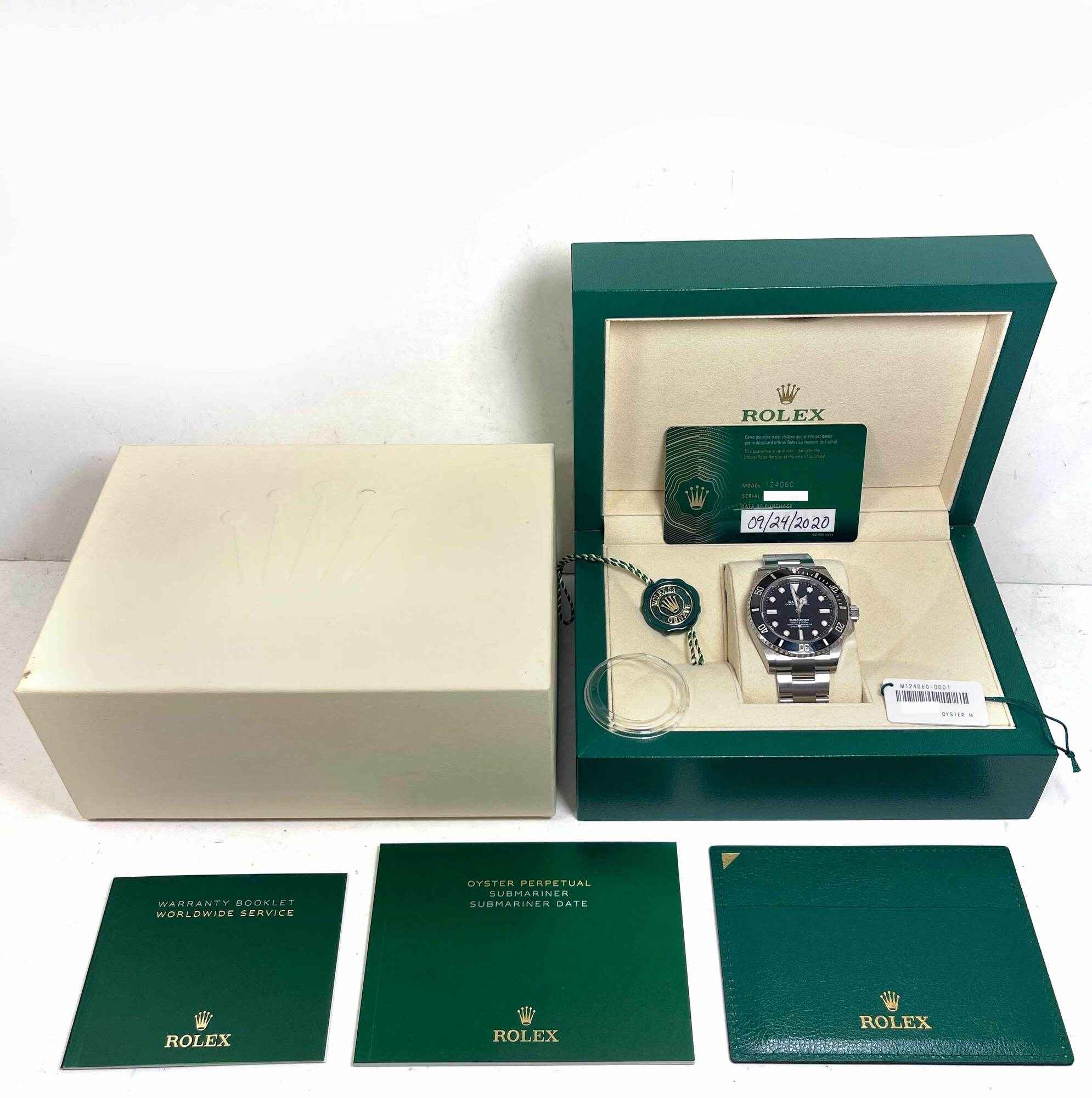 this rolex is in excellent condition and comes with its box, booklets, both hang tags, bezel protector, and warranty card dated september 24th, 2020 as shown in the pictures attached. This watch is in stock and available to ship immediately!