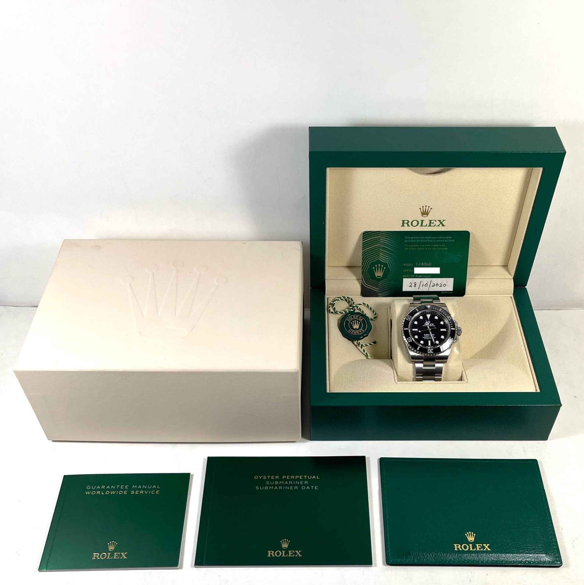 this rolex submariner is in excellent condition and comes with its original box, papers, hang tag, and warranty card dated october 28th, 2020. This watch is in stock and ready to ship immediately.