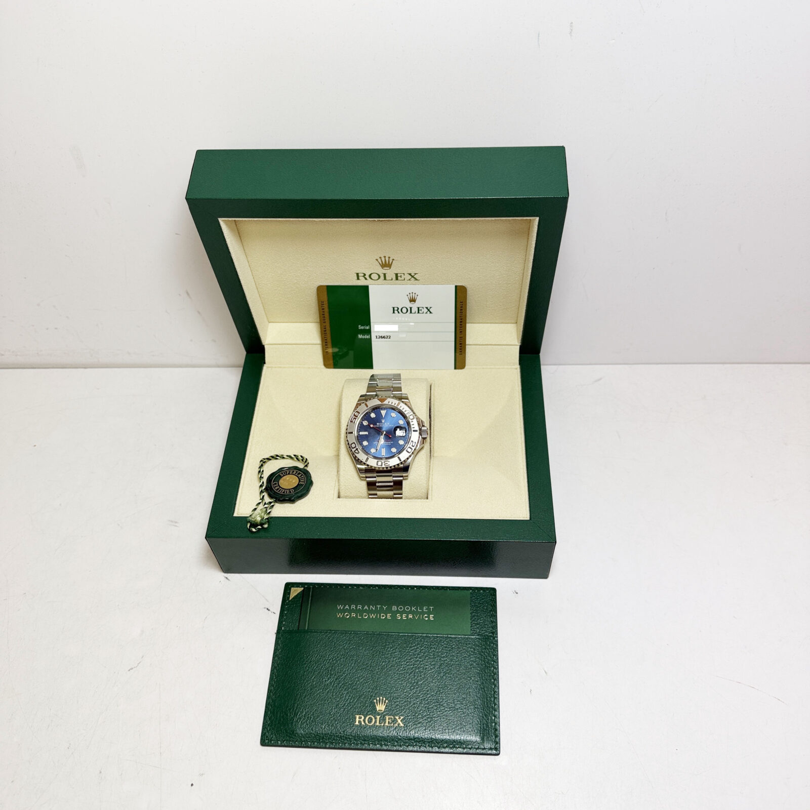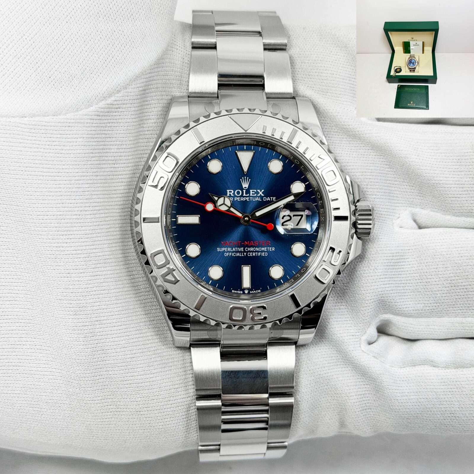 This Rolex Yacht-Master watch comes with its box, booklet, hangtag, and warranty card dated February, 2020. The photos shown are of the exact watch being sold and accurately represent its condition. This watch is in stock and ready to ship immediately!
