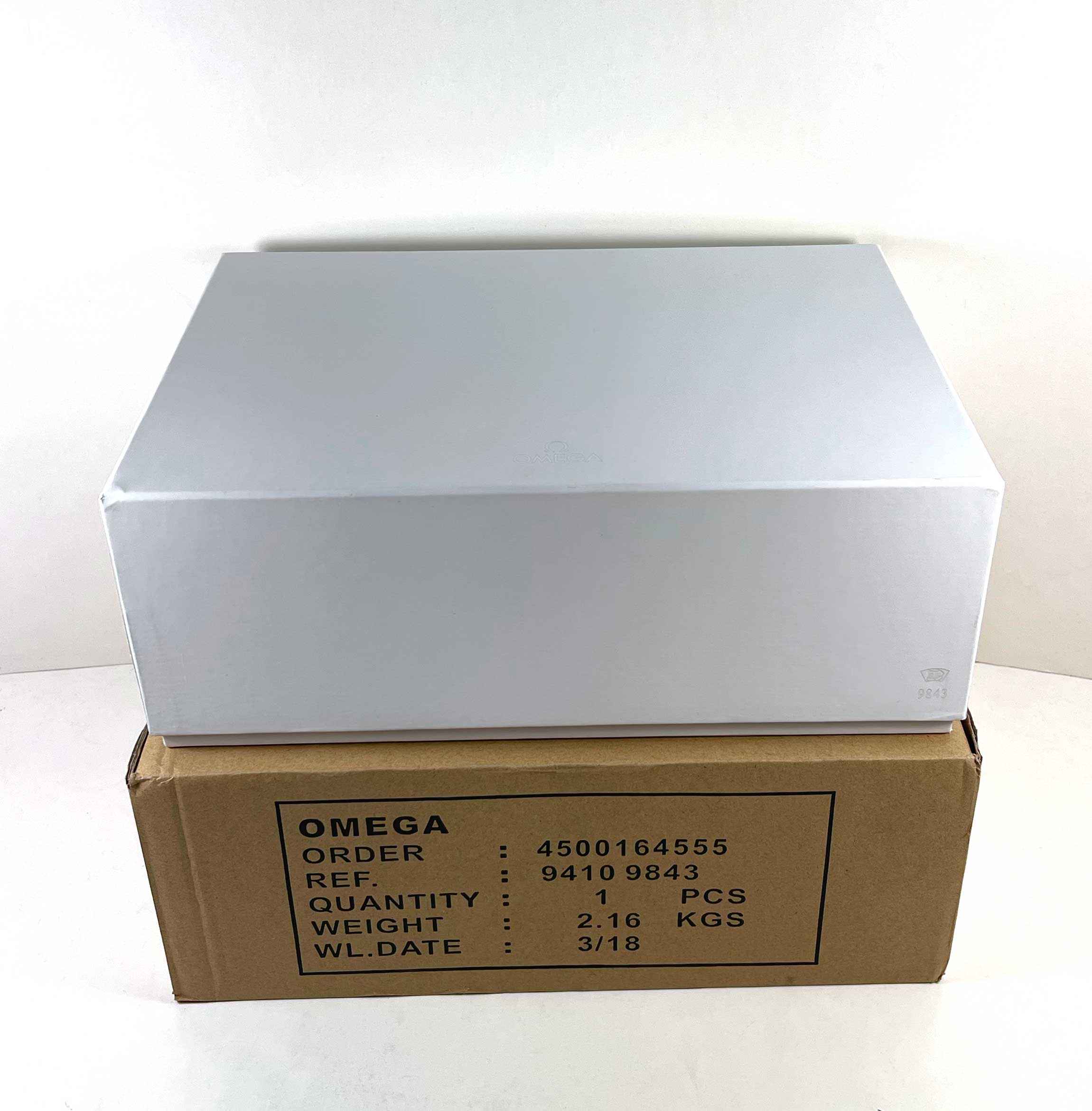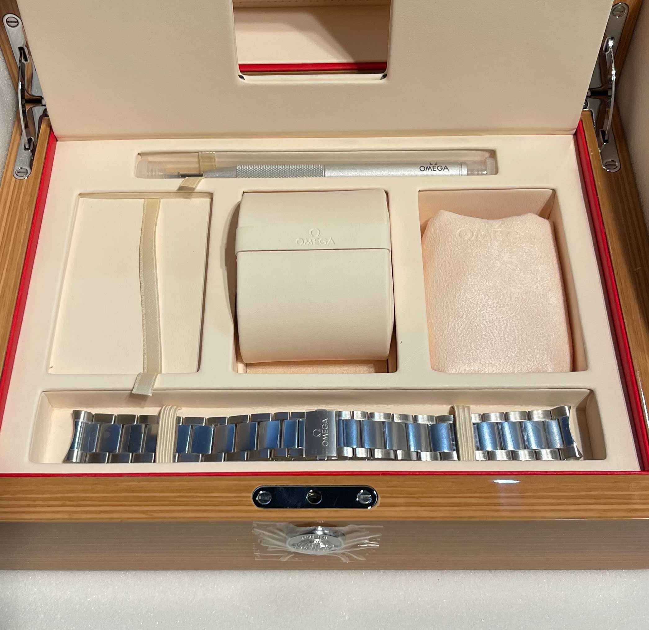 this omega seamaster is unworn and comes with its box, papers, one additional steel bracelet, omega tool, and warranty cards dated september 30th, 2020. The box for this watch was made specifically for the ryder cup edition and comes with the additional steel bracelet that is fully stickered as shown in photo #4. The case on this omega has never been polished and still holds the original lines on the case and sharp edges on the lugs! this watch sat in the original owners safe after purchased and has never been worn. This watch is in stock and available to ship immediately!