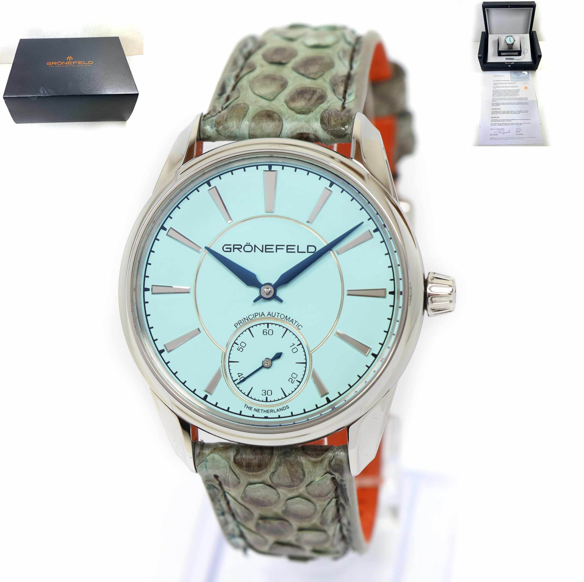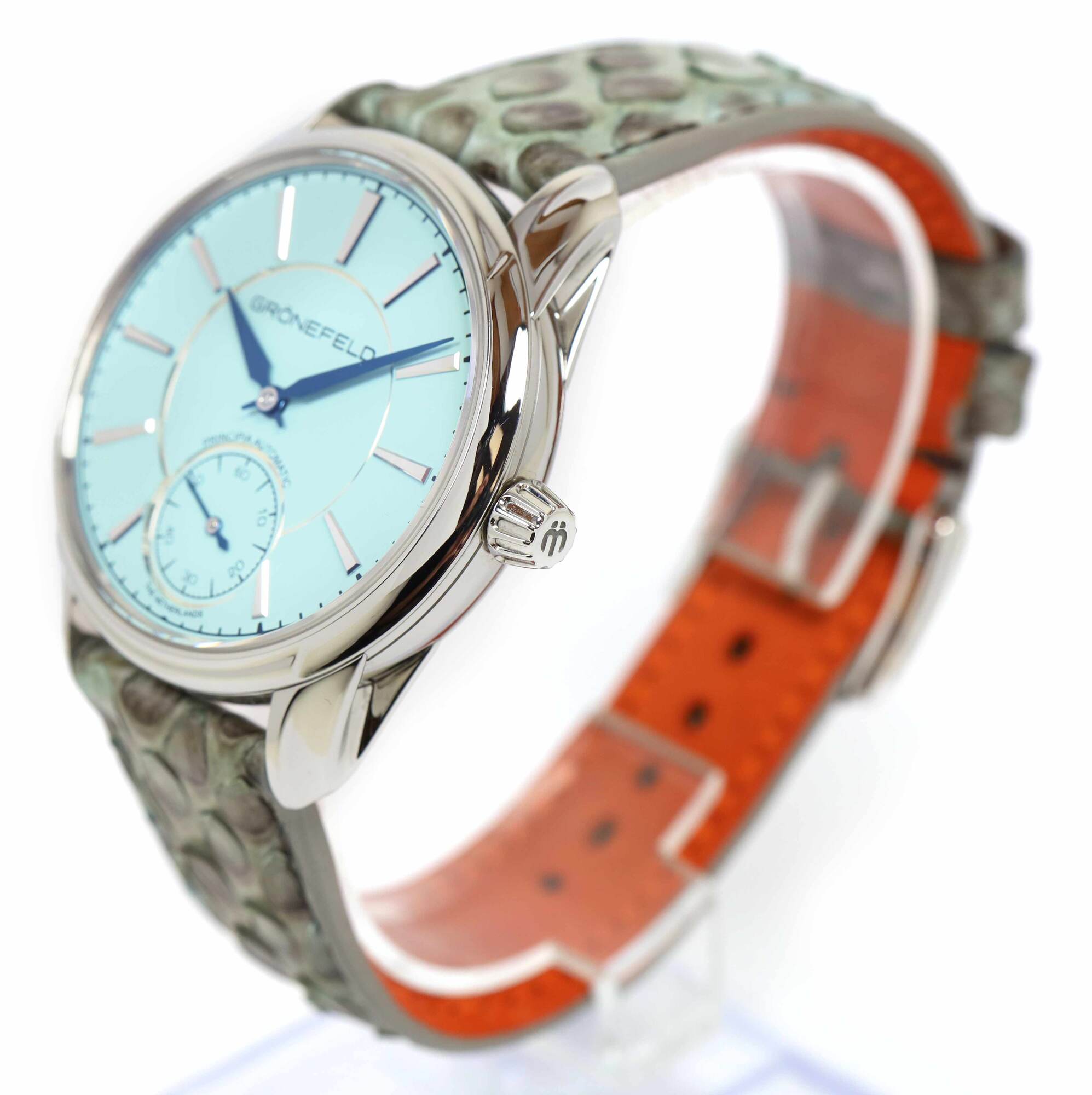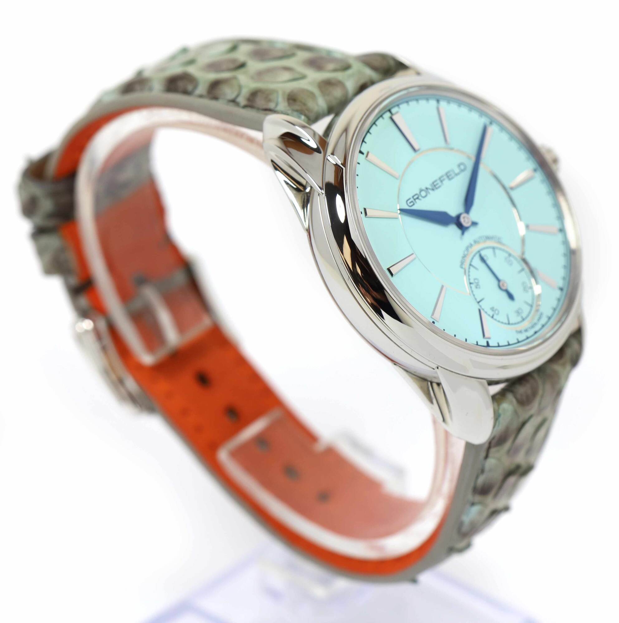 Read Morethis gronefeld watch is in superb condition and comes with its box and warranty card dated may, 2021 as shown in the pictures attached. This watch features a 39.5mm stainless steel case that surrounds a tiffany blue dial with blue hands and comes on a green-blue python strap. This watch is in stock and available to ship immediately!