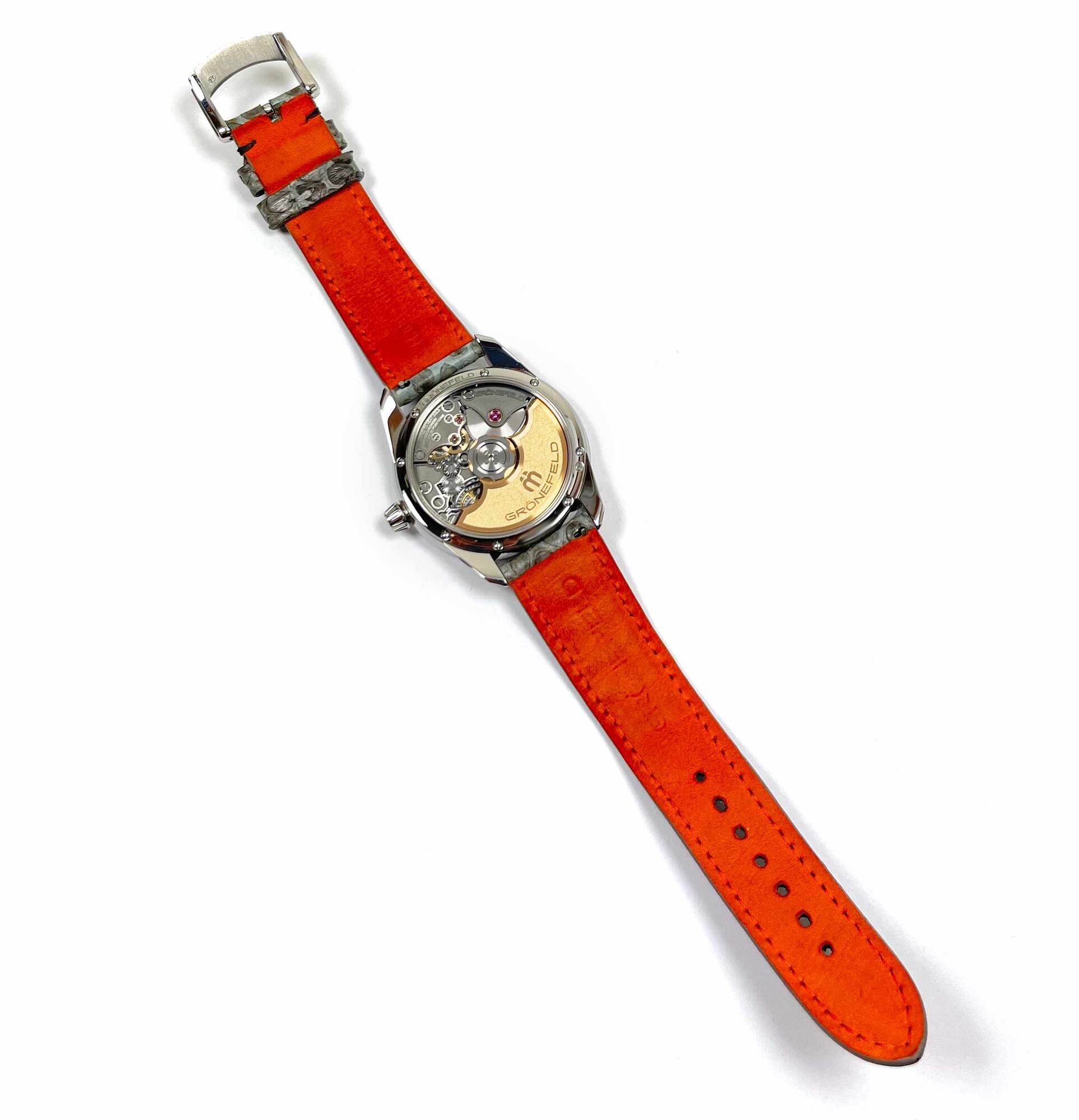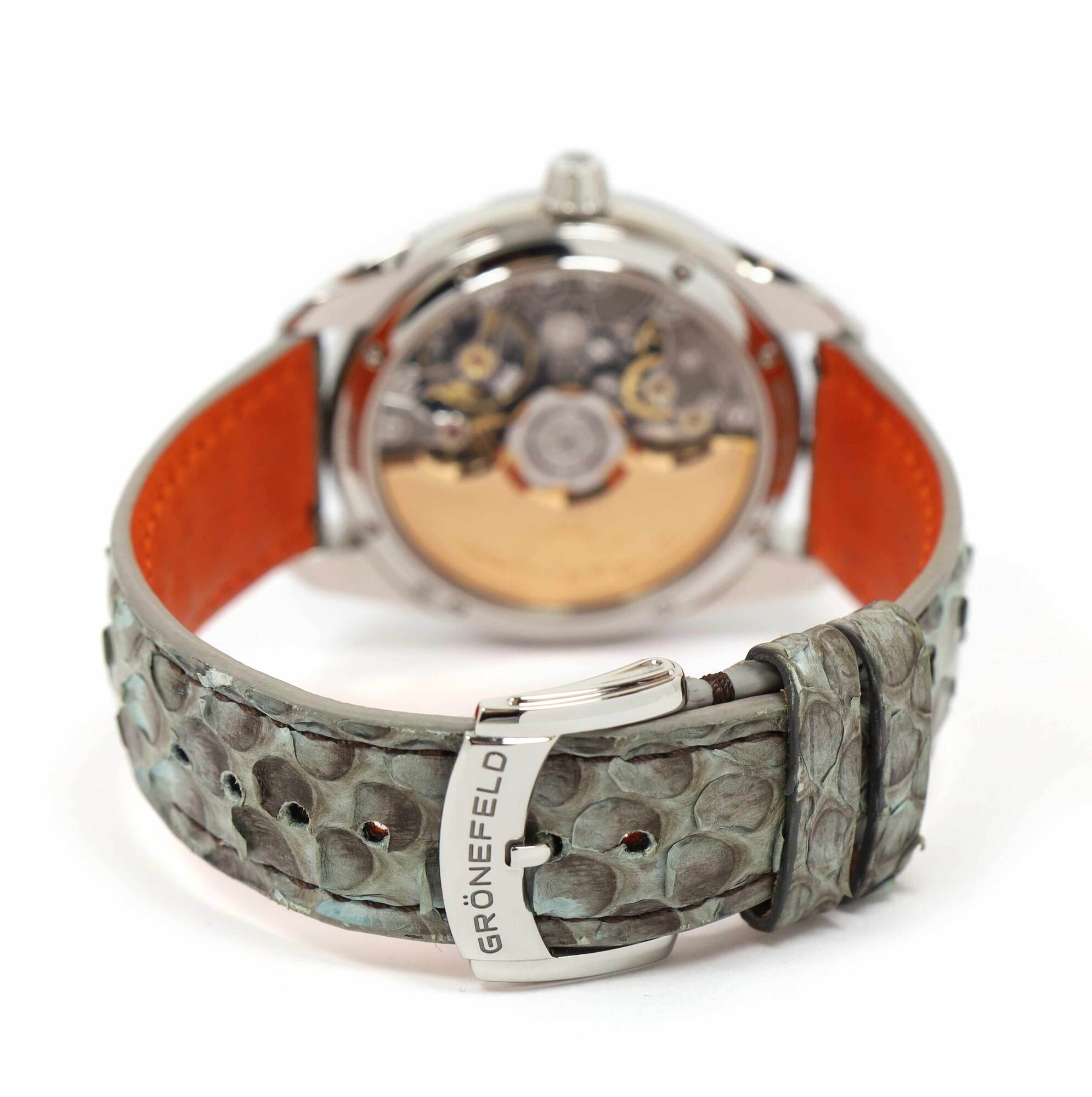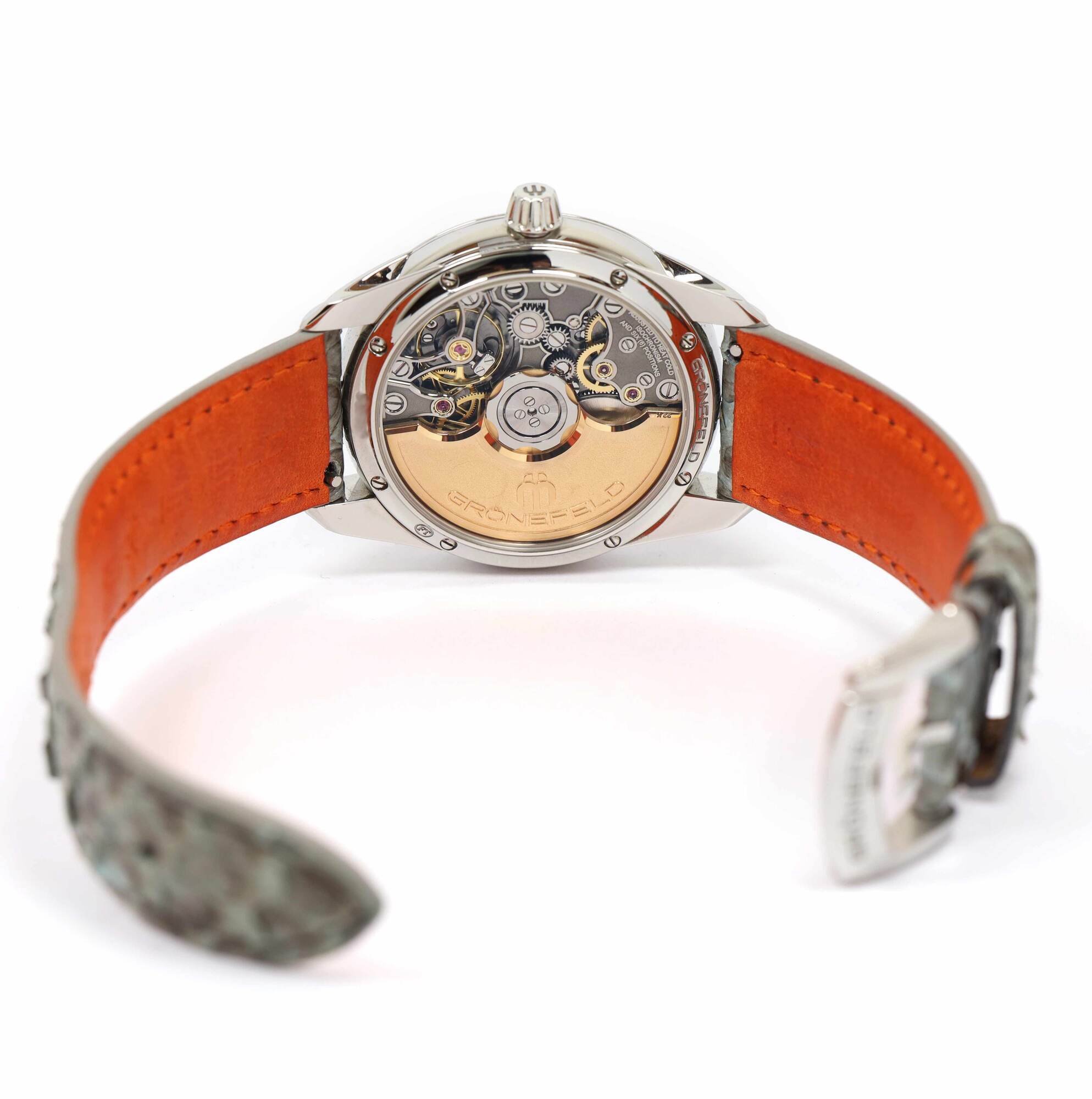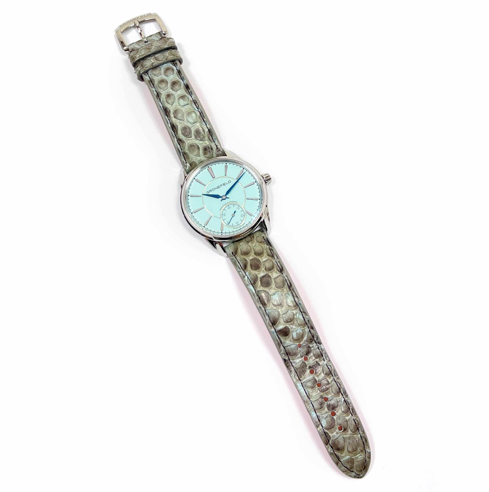Read Morethis gronefeld watch is in superb condition and comes with its box and warranty card dated may, 2021 as shown in the pictures attached. This watch features a 39.5mm stainless steel case that surrounds a tiffany blue dial with blue hands and comes on a green-blue python strap. This watch is in stock and available to ship immediately!