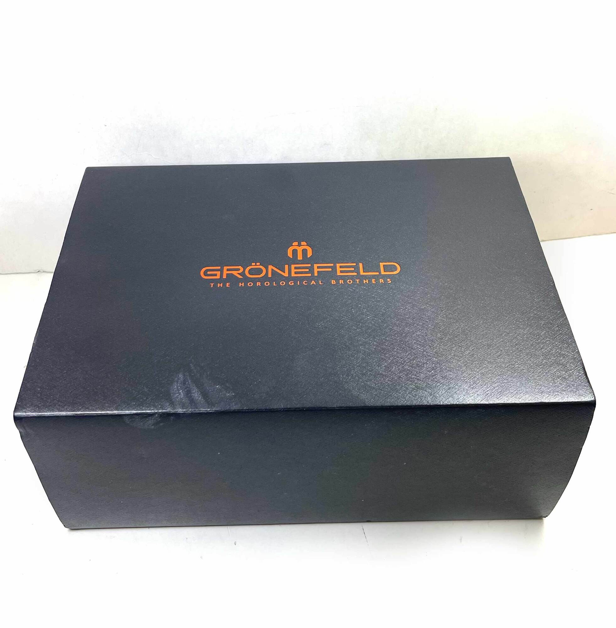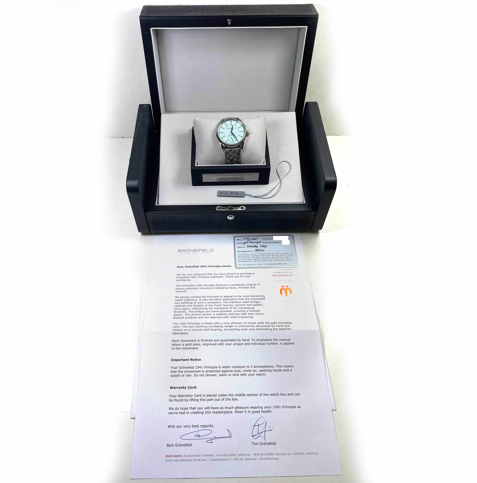 This gronefeld watch is in superb condition and comes with its box and warranty card dated may, 2021 as shown in the pictures attached. This watch features a 39.5mm stainless steel case that surrounds a tiffany blue dial with blue hands and comes on a green-bl...