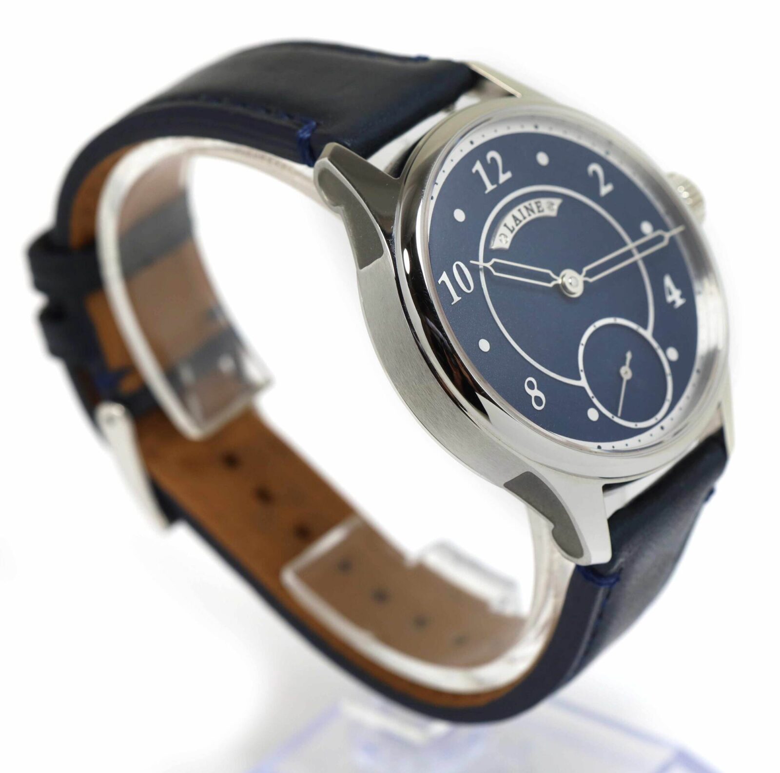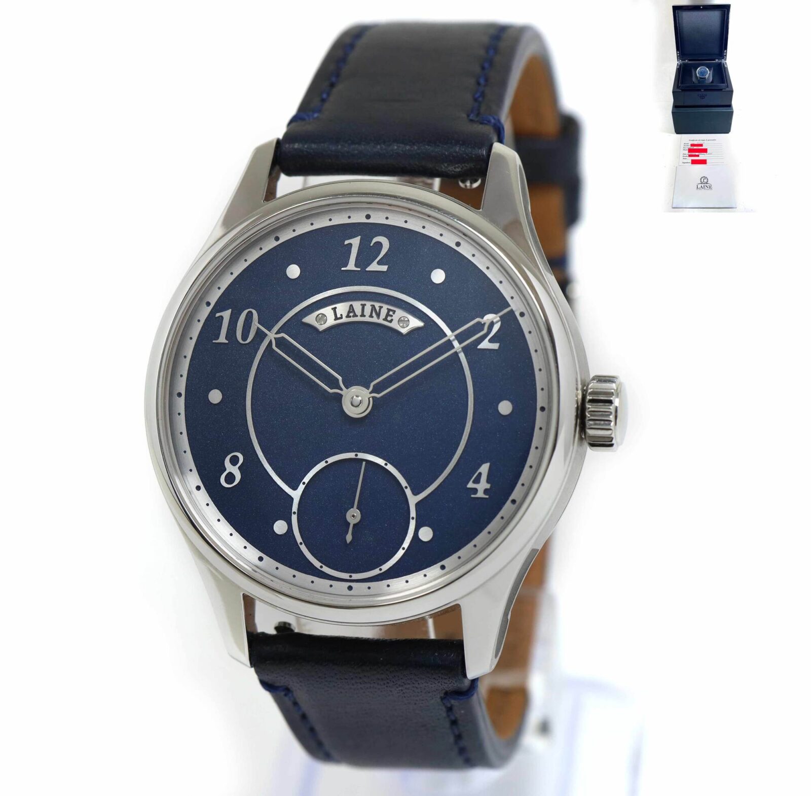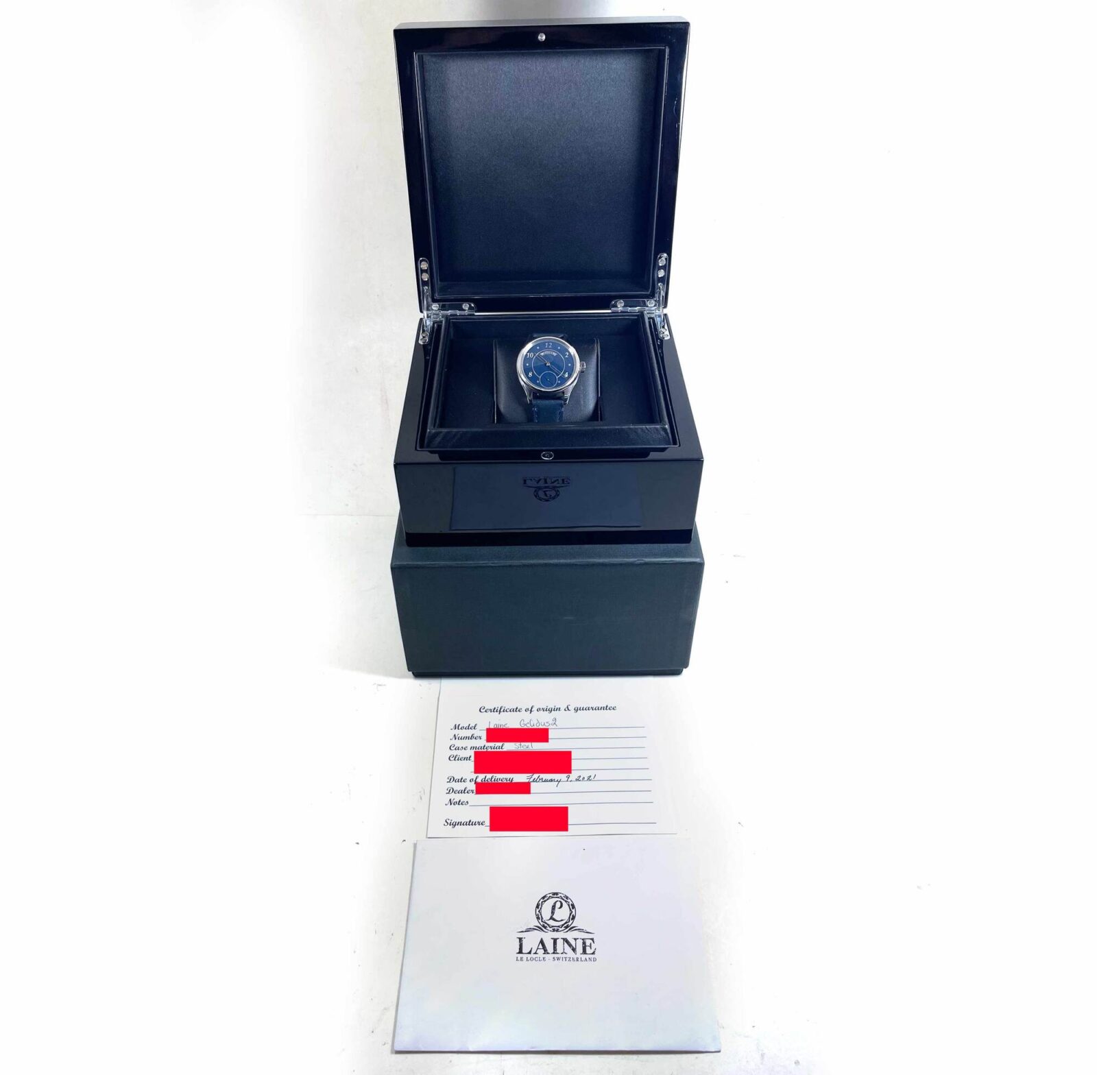 this laine watch is in excellent overall condition and comes with its box and warranty paper dated february 9th, 2021. The blue leather strap/buckle and box shown in the pictures attached are not original and was sold to us this way. This laine watch is in stock and available to ship immediately!