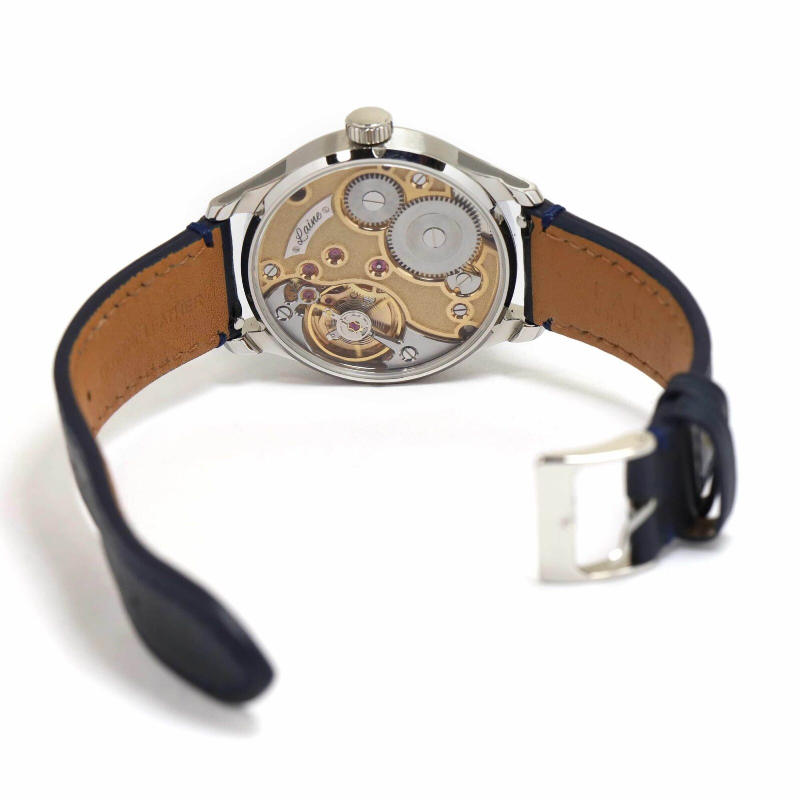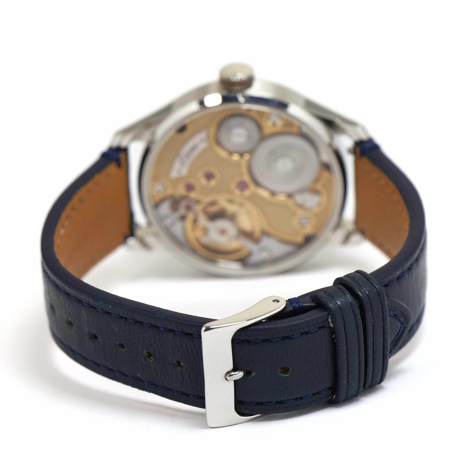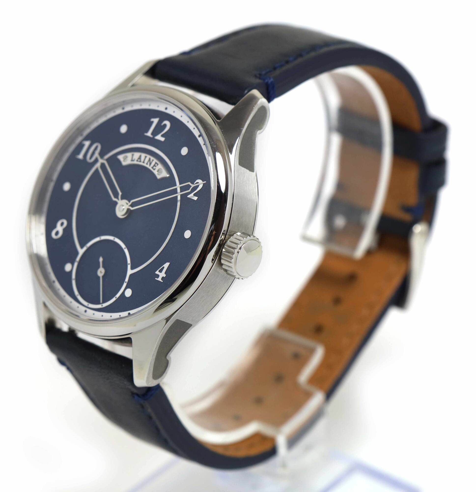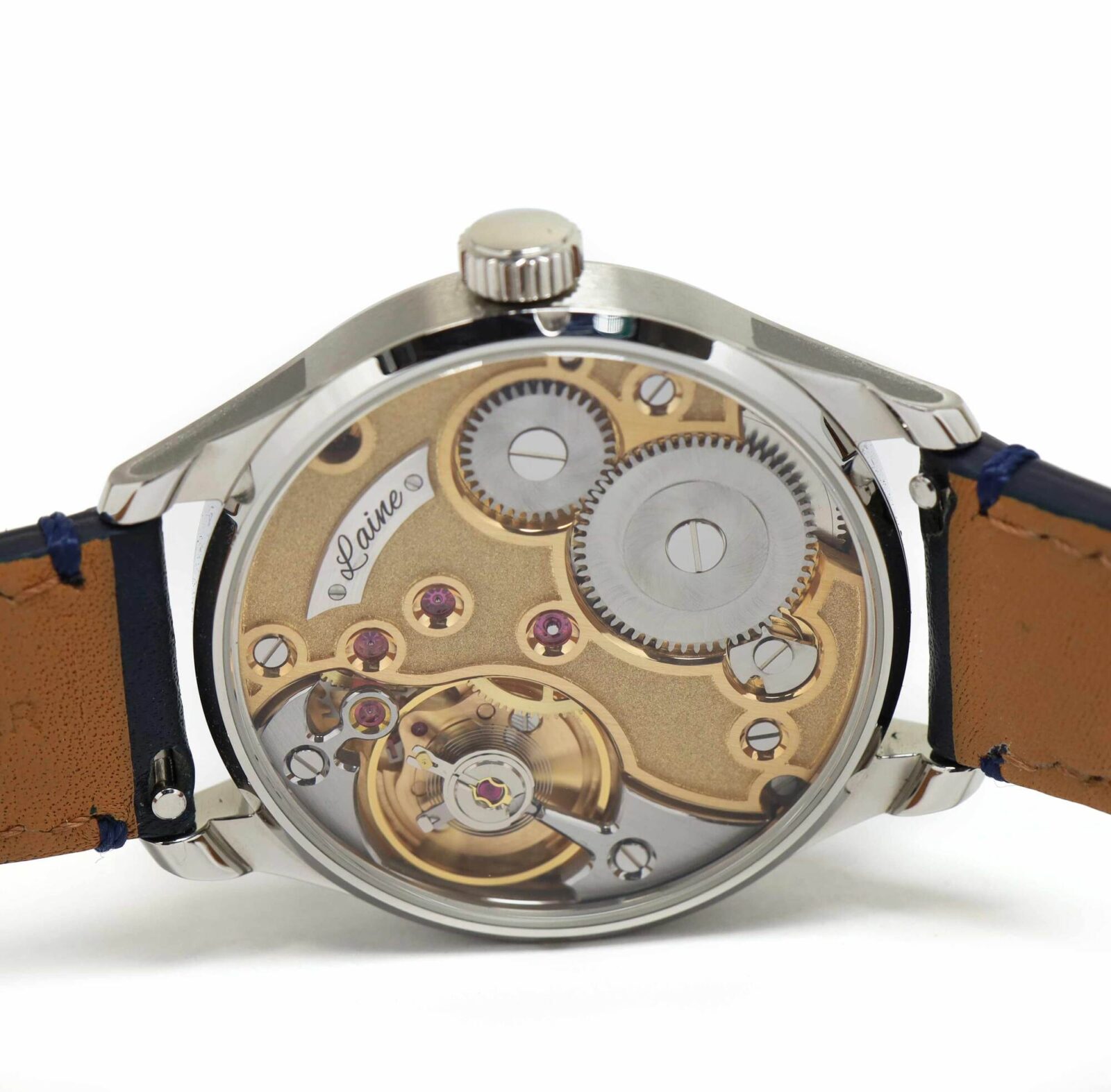 this laine watch is in excellent overall condition and comes with its box and warranty paper dated february 9th, 2021. The blue leather strap/buckle and box shown in the pictures attached are not original and was sold to us this way. This laine watch is in stock and available to ship immediately!