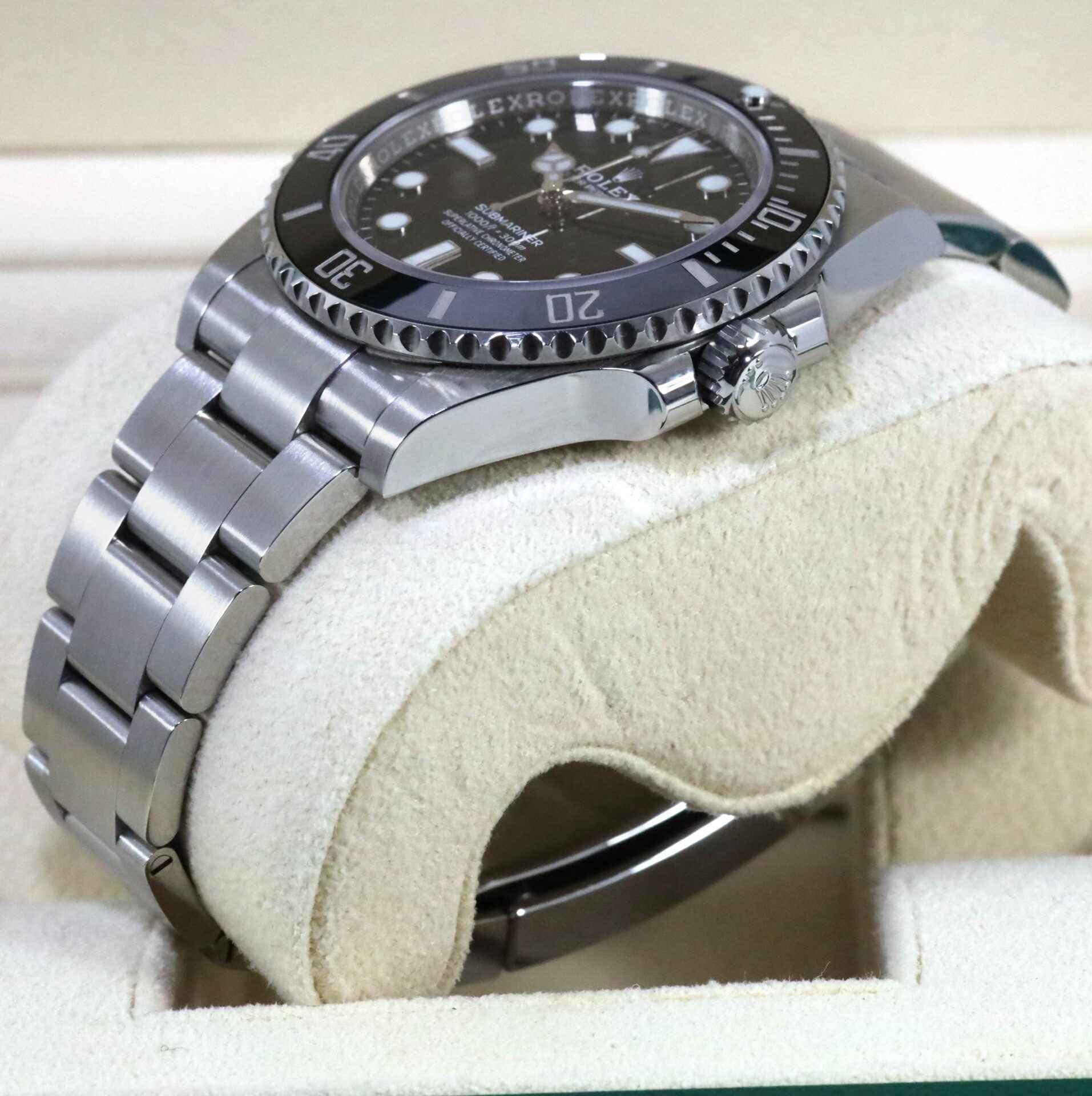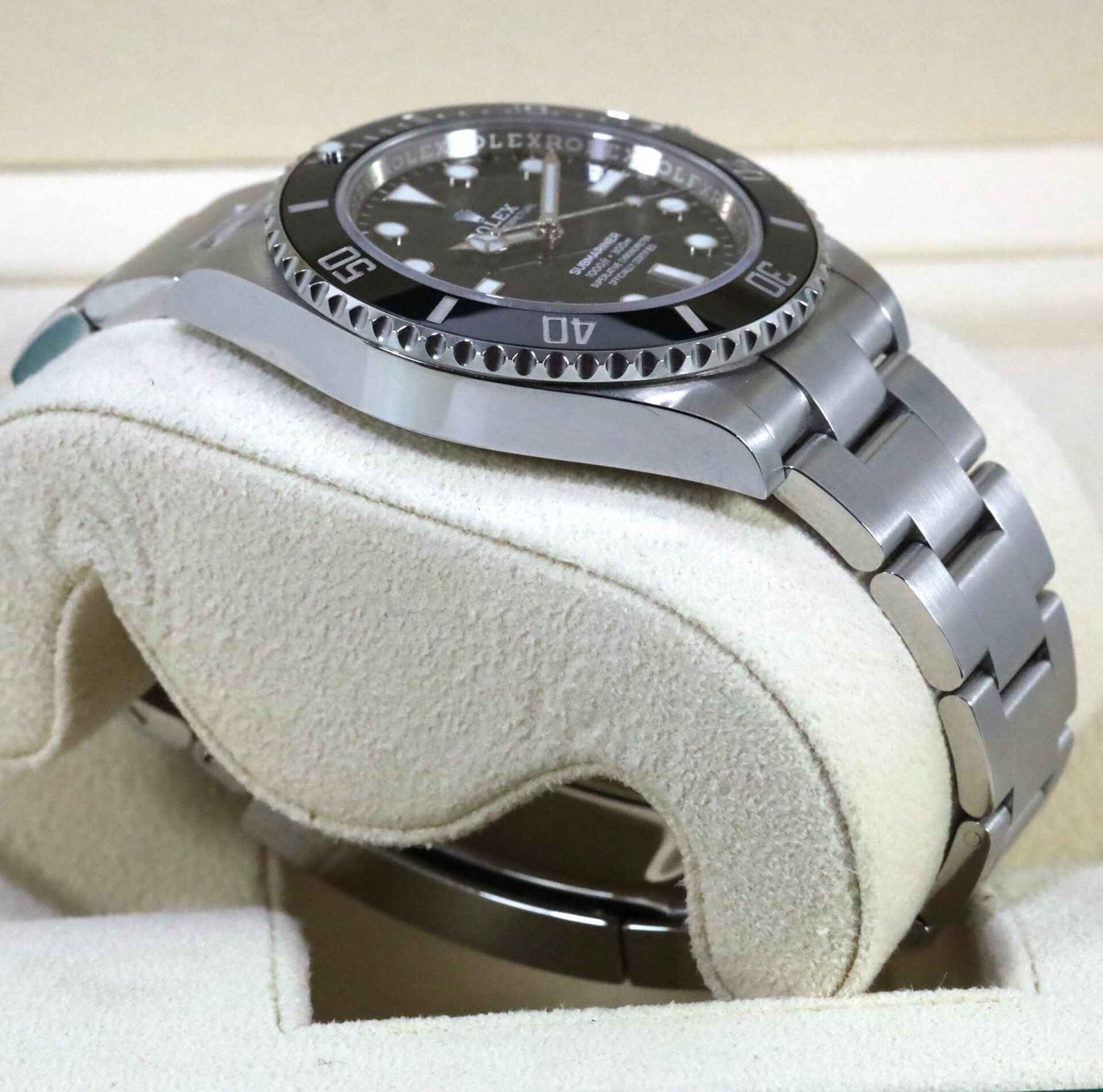 This Rolex Submariner is in mint condition and comes with its original box, papers, hang tags, bezel protector, and warranty card dated for 2021. This watch is in stock and ready to ship immediately.