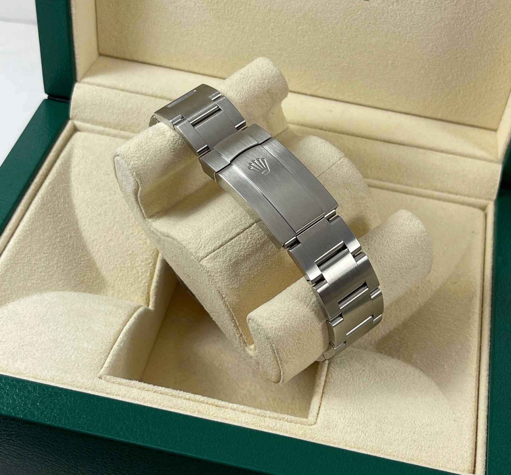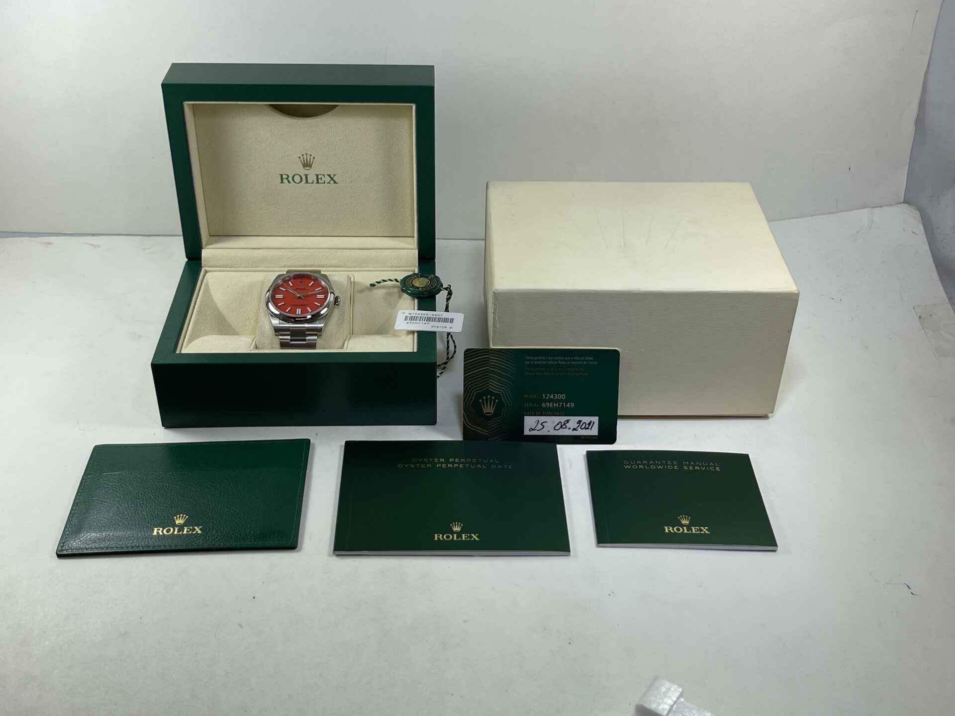 This watch is new and comes with its original box, papers, hang tags, and warranty card dated August 25th, 2021. This watch is in stock and available to ship immediately.