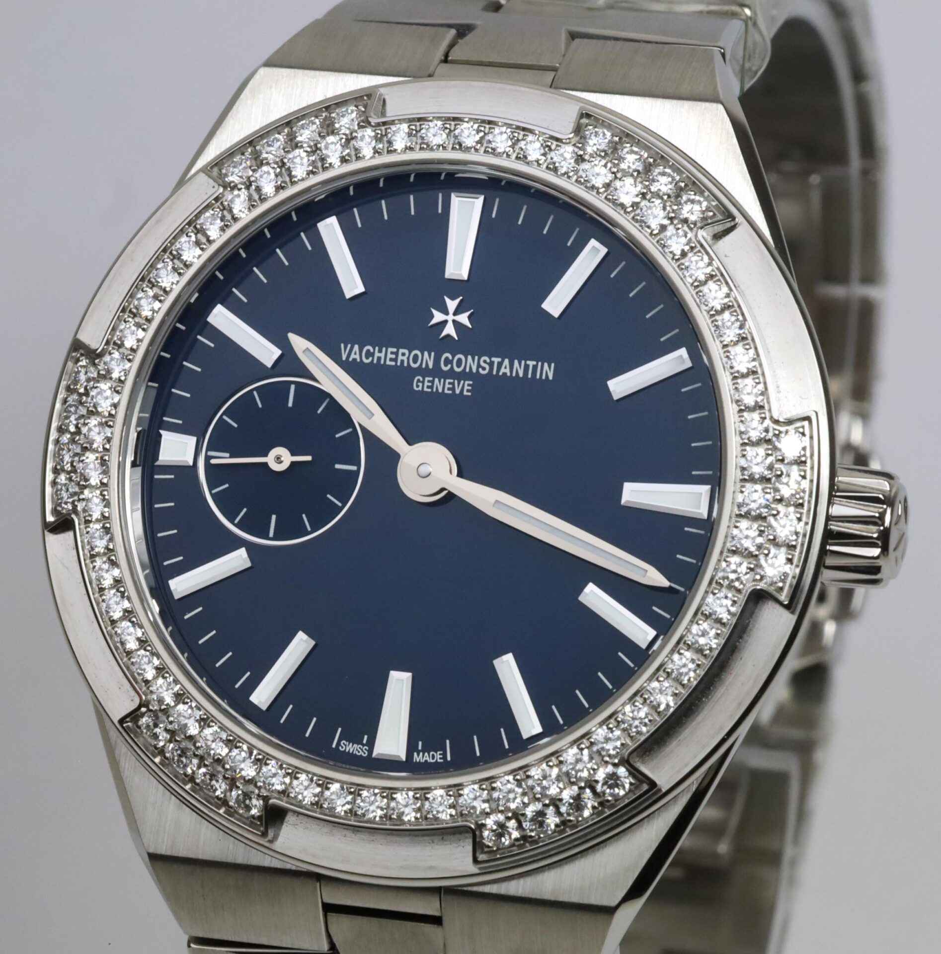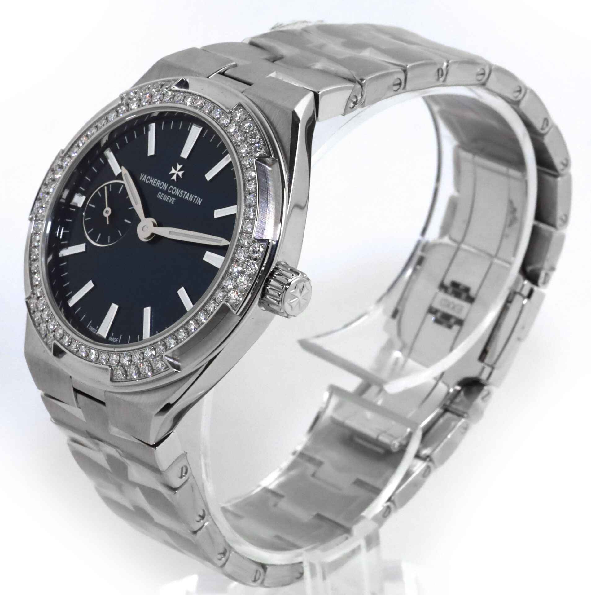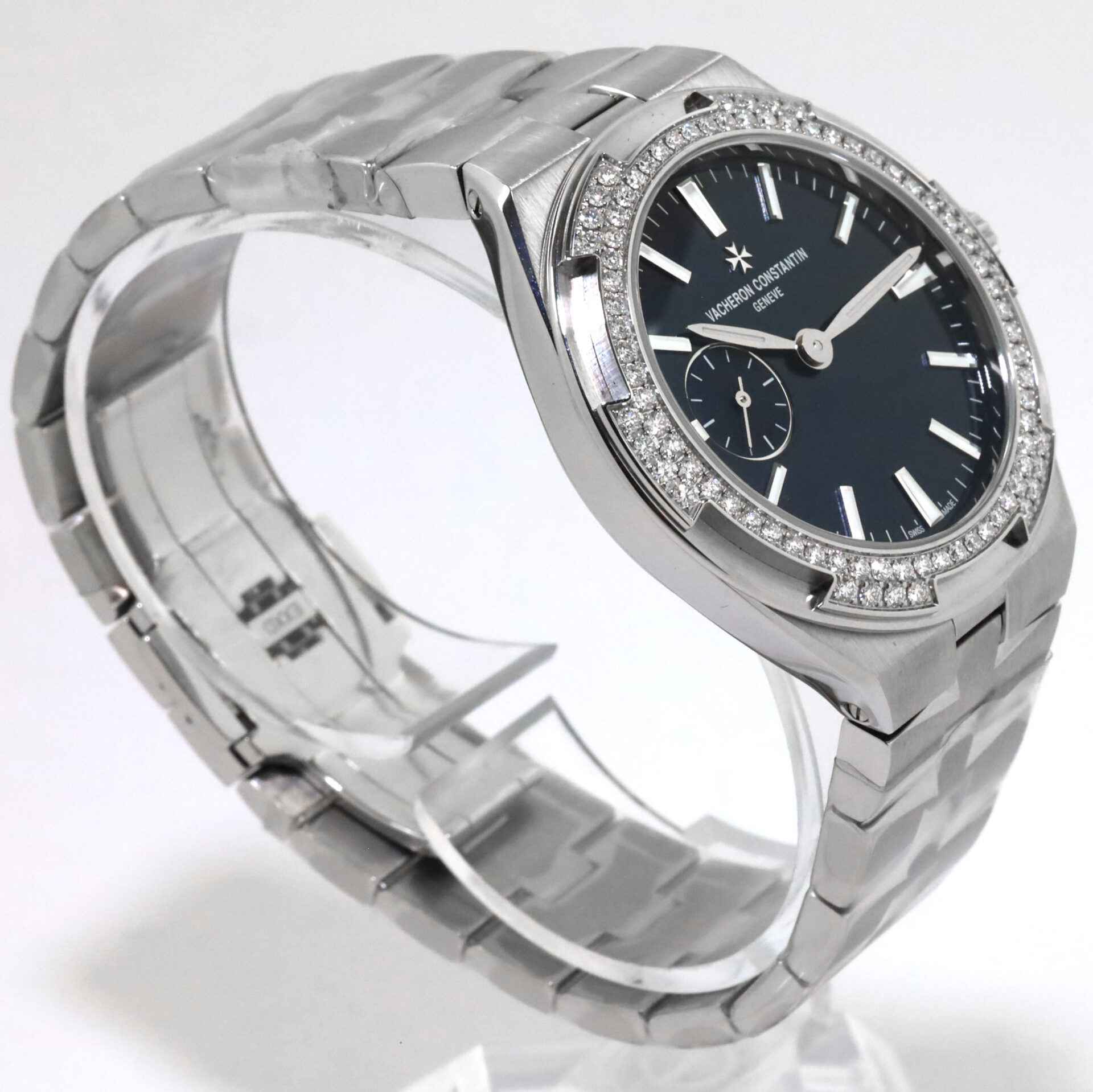 Read Morethis vacheron constantin is new and has stickers still on the steel bracelet as shown in the photos attached. This watch comes with its box, papers, hang tag, 2 spare straps, 1 spare vc butterfly clasp, and warranty card. This watch features 84 round-cut factory diamonds on the bezel with a beautiful blue dial on a stainless steel case and bracelet. This watch is in stock and available to ship immediately!