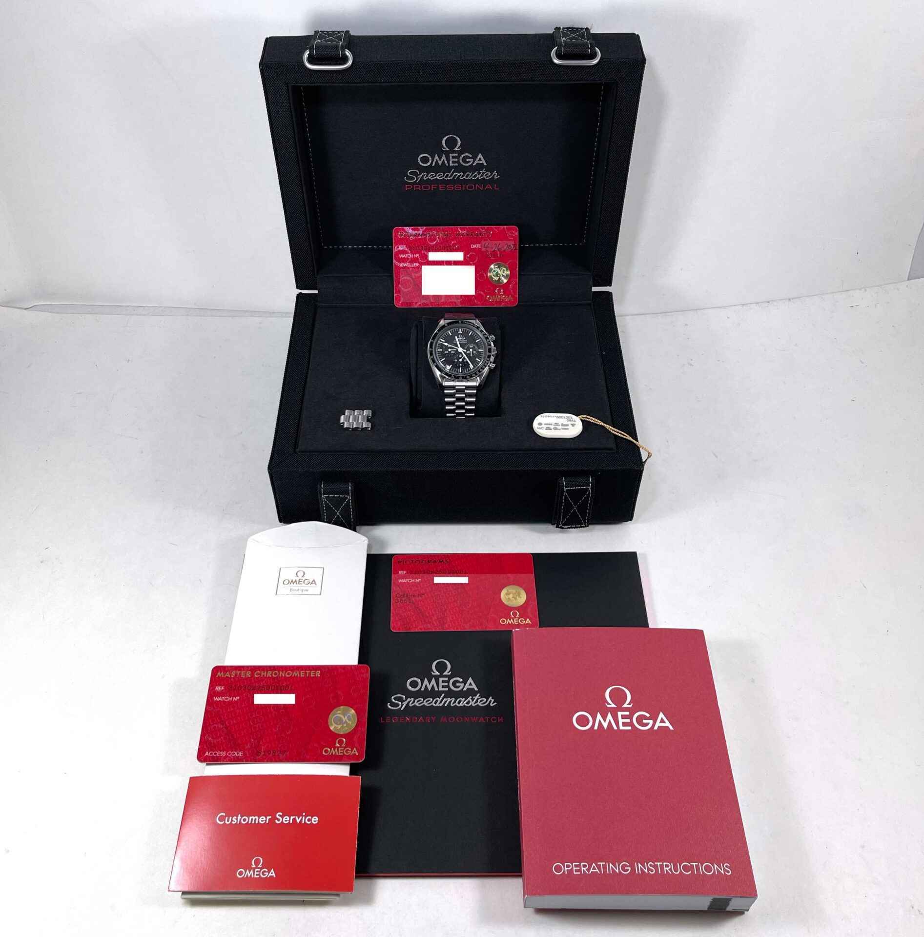 this omega watch is in excellent condition and comes with its box, papers, hang tag, spare links, and warranty card dated april 26th, 2021. This watch is in stock and available to ship immediately!