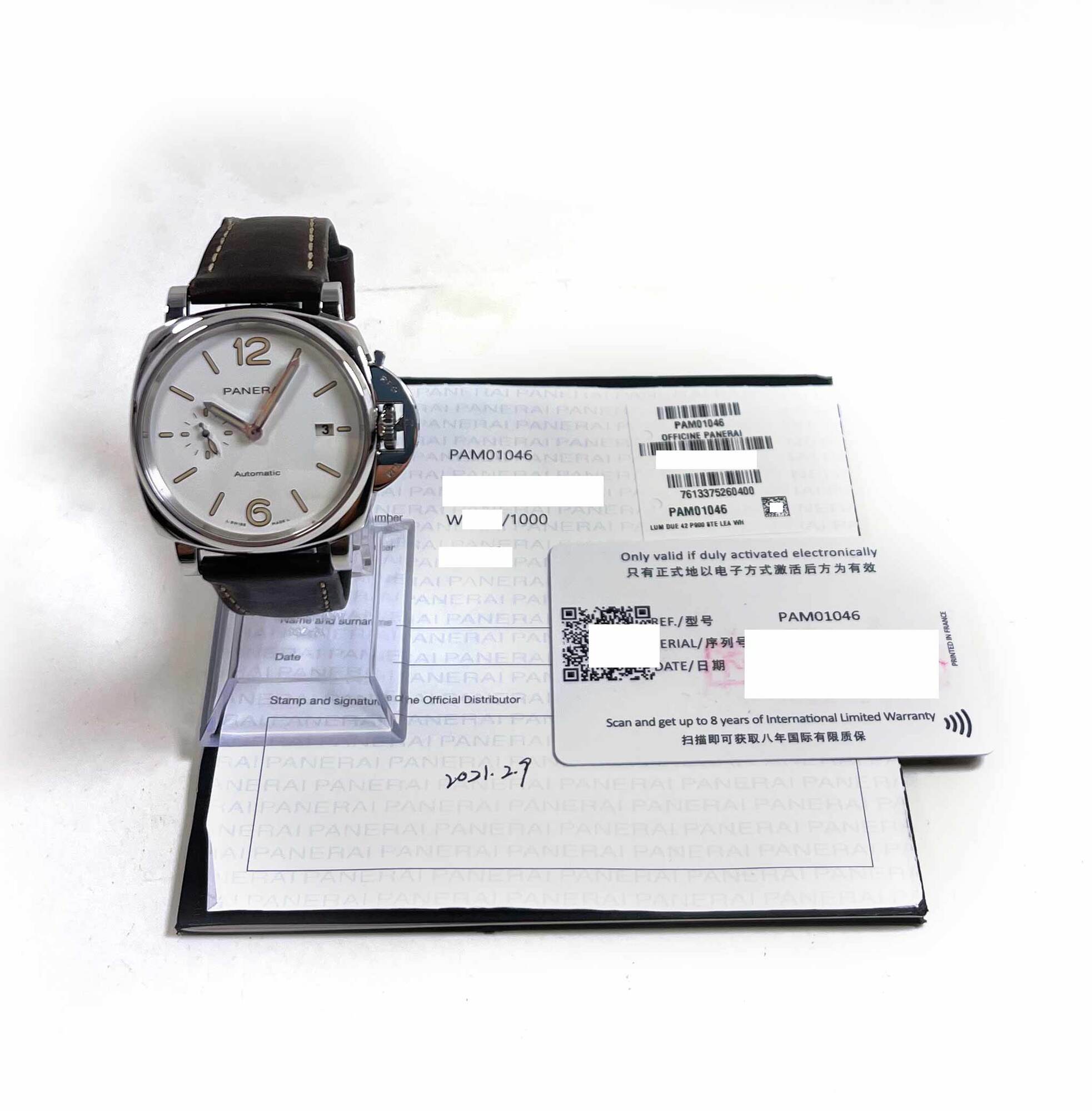 this panerai is in excellent condition and comes with its booklet and warranty card dated february 9th, 2021 as shown in the pictures attached. This watch is in stock and available to ship immediately!