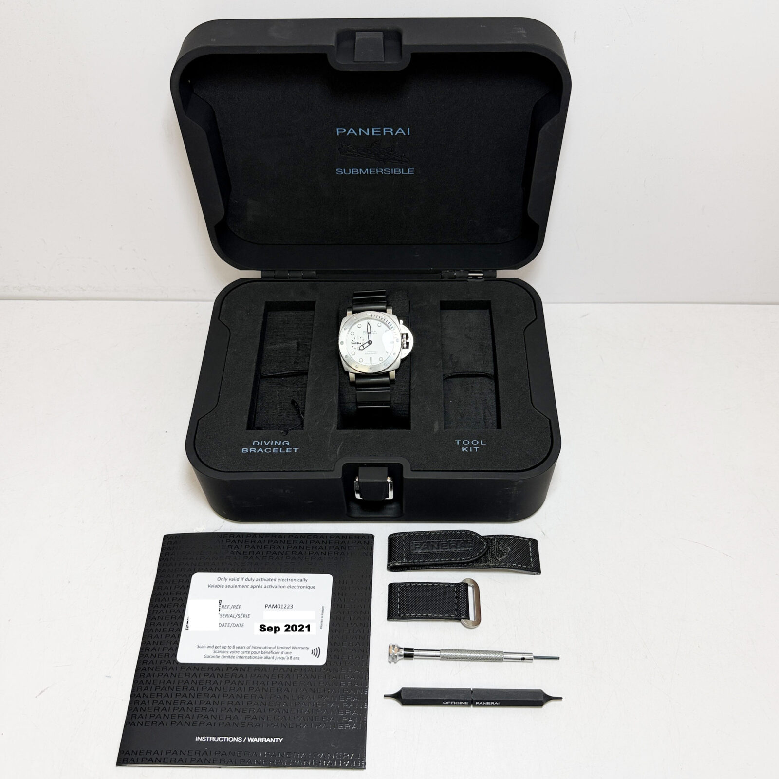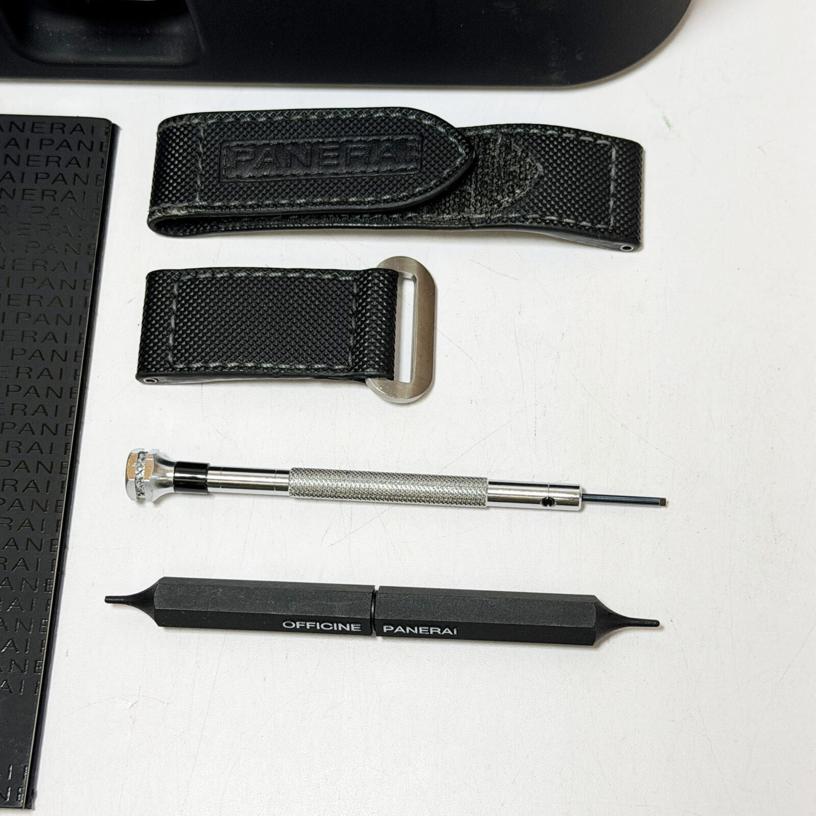 this panerai submersible watch comes with its box, booklet, extra straps, brand accessories, and warranty card dated january, 2021. The photos shown are of the exact watch being sold and accurately represent its condition. This watch is in stock and ready to ship immediately!