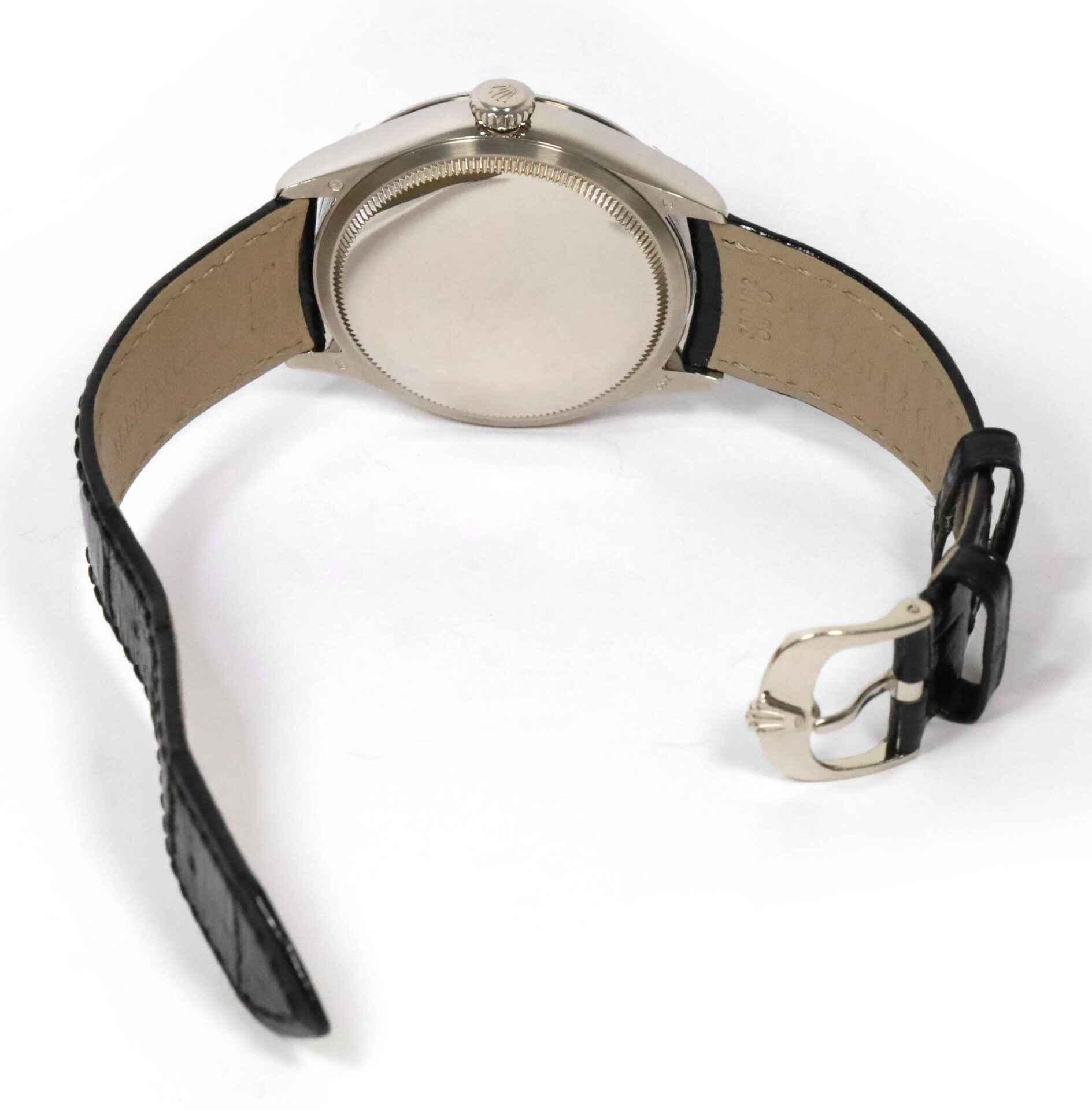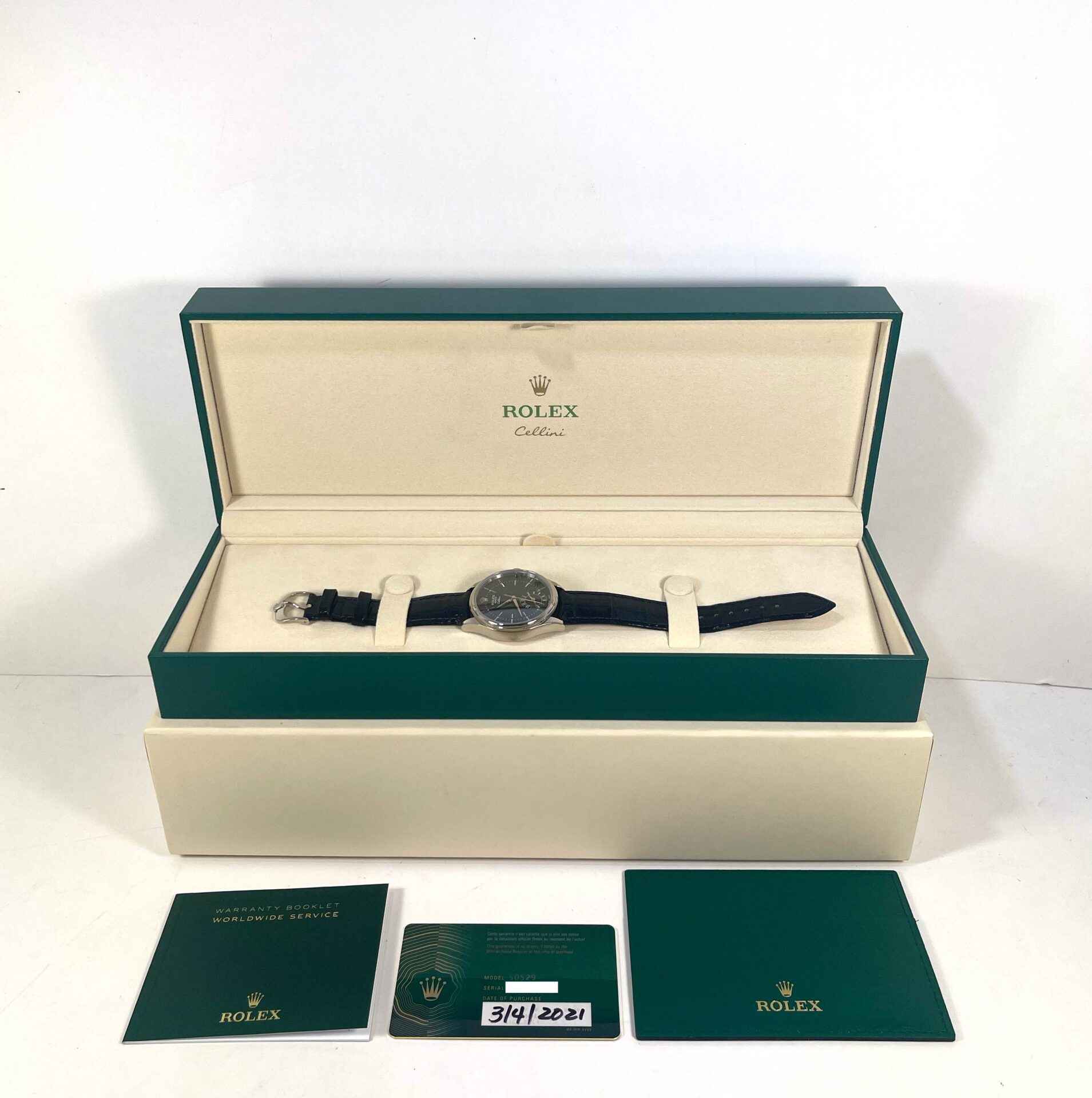 This Rolex Cellini is in MINT condition and comes with its box, papers, and warranty card dated April 3rd, 2021. This watch comes on its original black Crocodile Strap showing little to no wear, features an 18k white go...