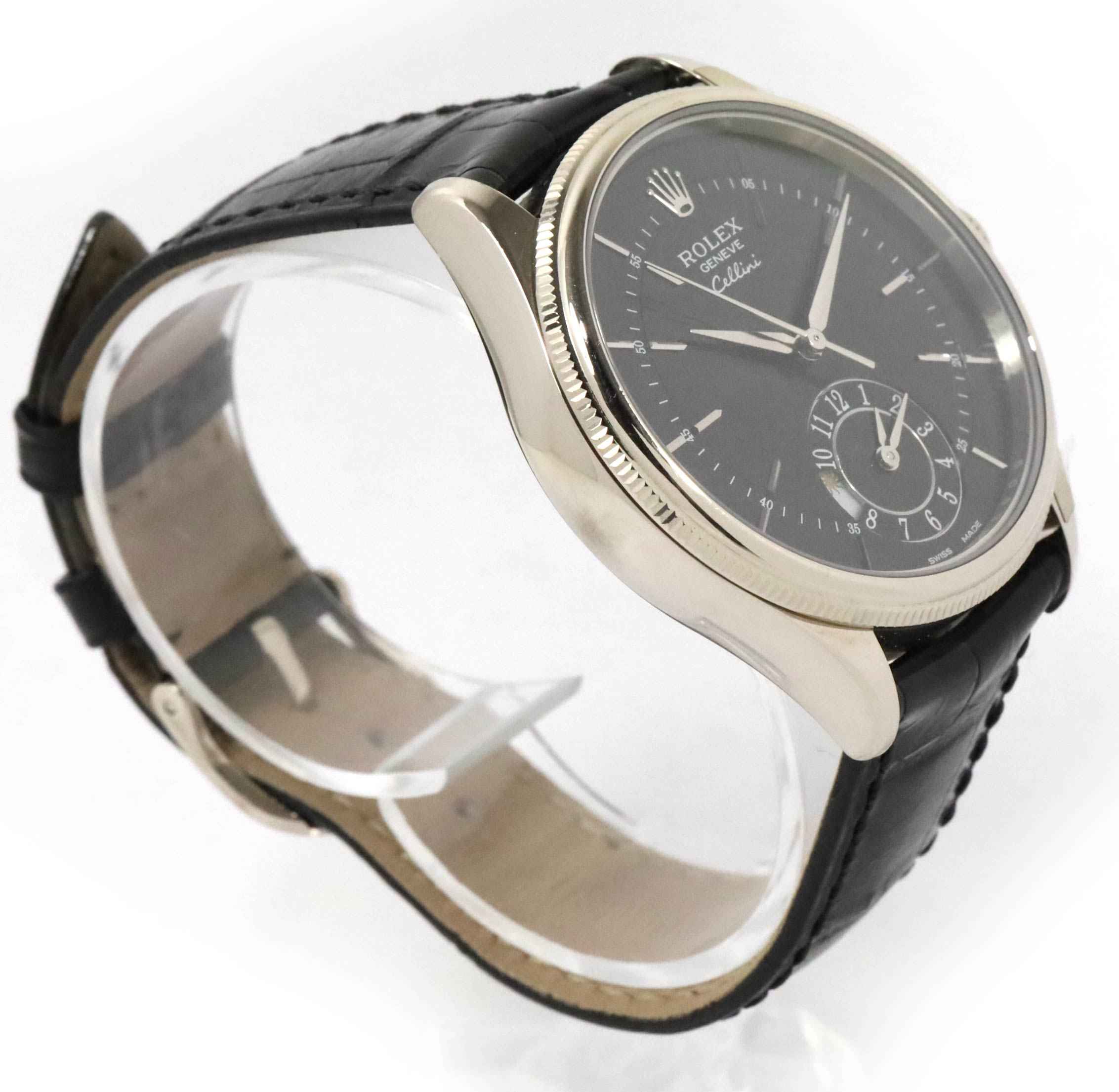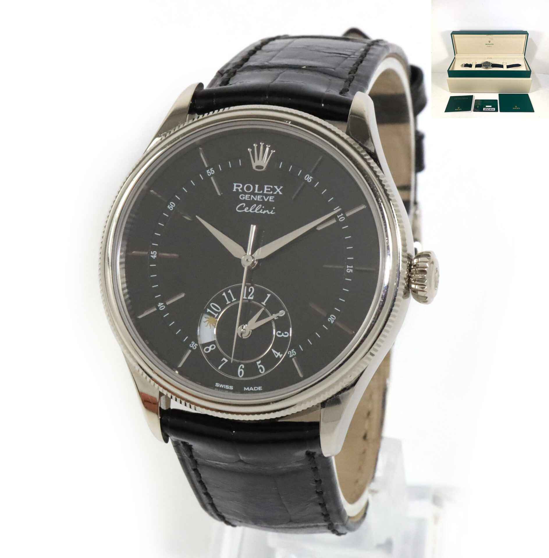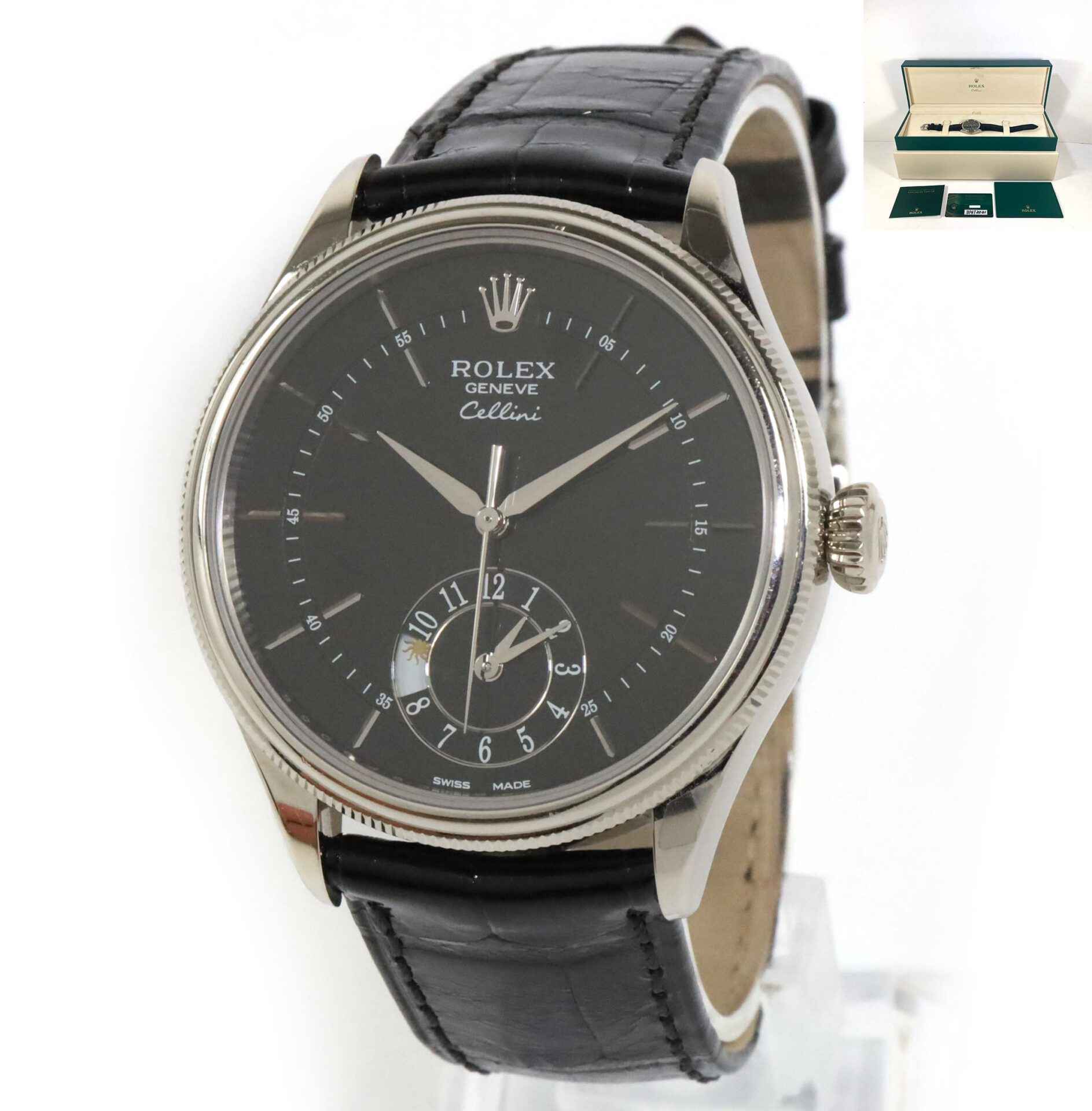 Read Morethis rolex cellini is in mint condition and comes with its box, papers, and warranty card dated april 3rd, 2021. This watch comes on its original black crocodile strap showing little to no wear, features an 18k white gold case, a black dial, display of second time zone on the sub-dial with a day/night indicator as shown in the photos attached. This watch is in stock and available to ship immediately!