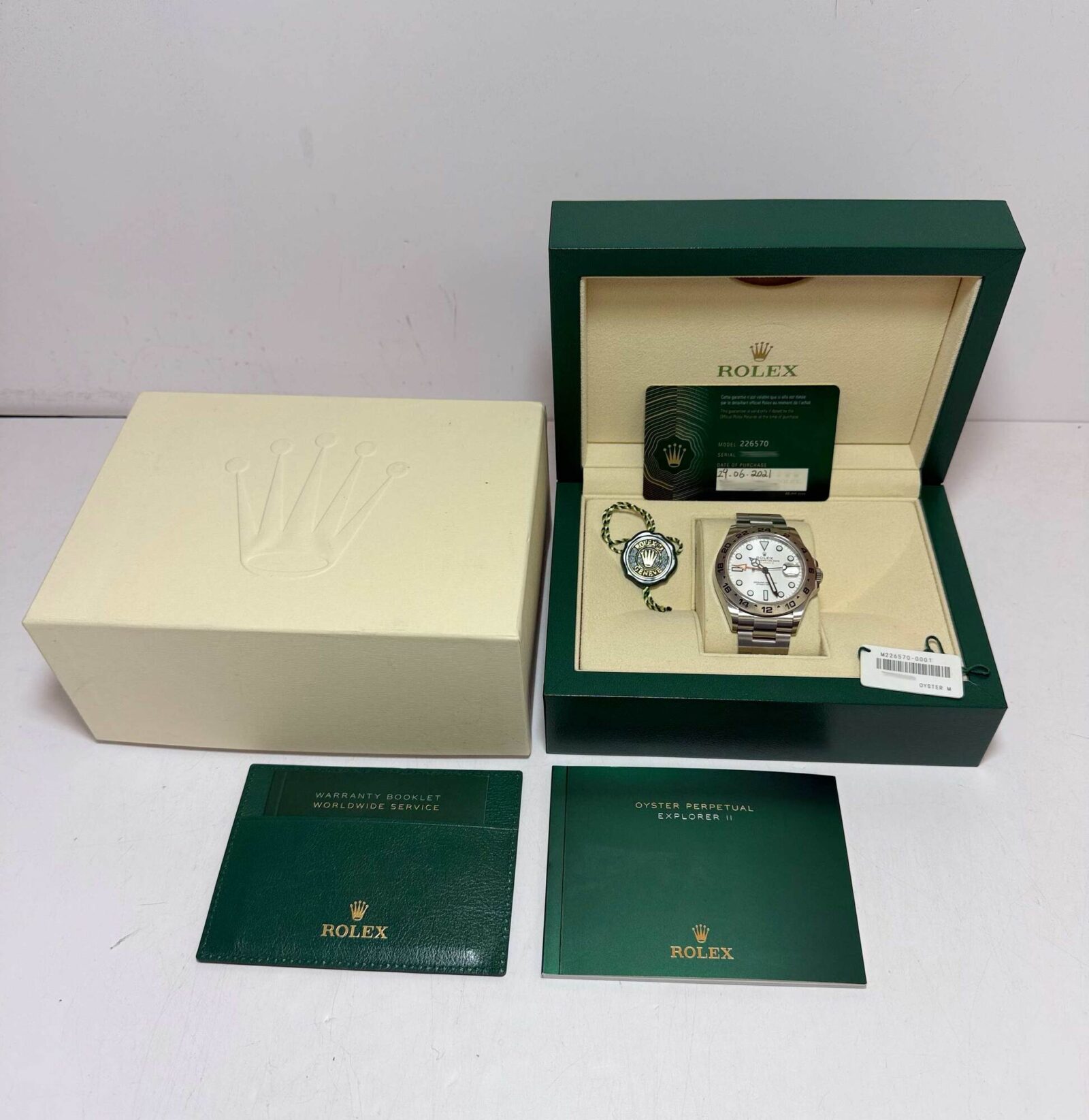 this rolex watch is in excellent overall condition and comes with its box, booklets, hang tags and warranty card dated june 29th, 2021 as shown in the pictures attached. This watch is in stock and available to ship immediately!