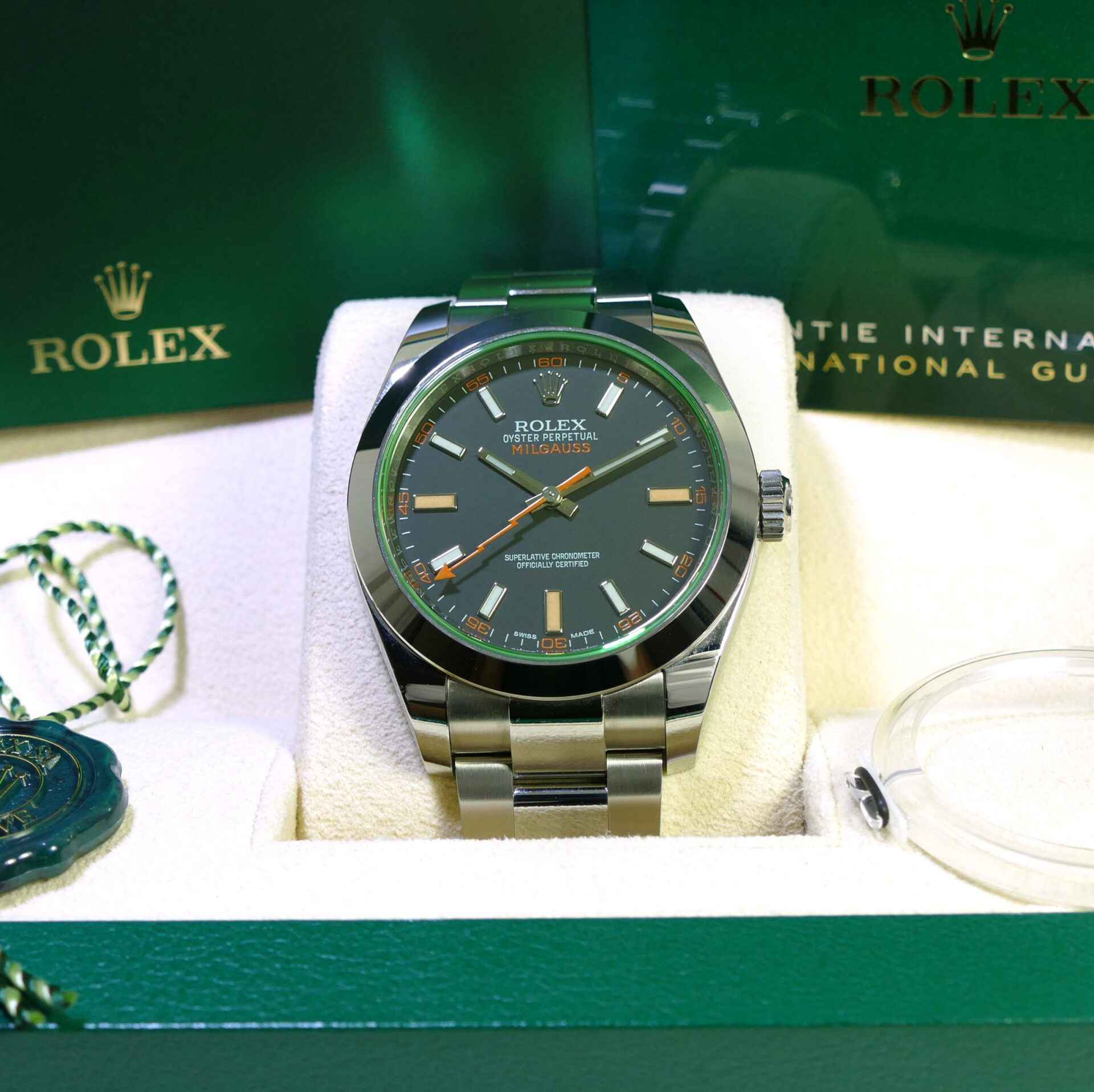 this rolex milgauss is in excellent condition and comes with its original box, papers, hang tag, and warranty card.