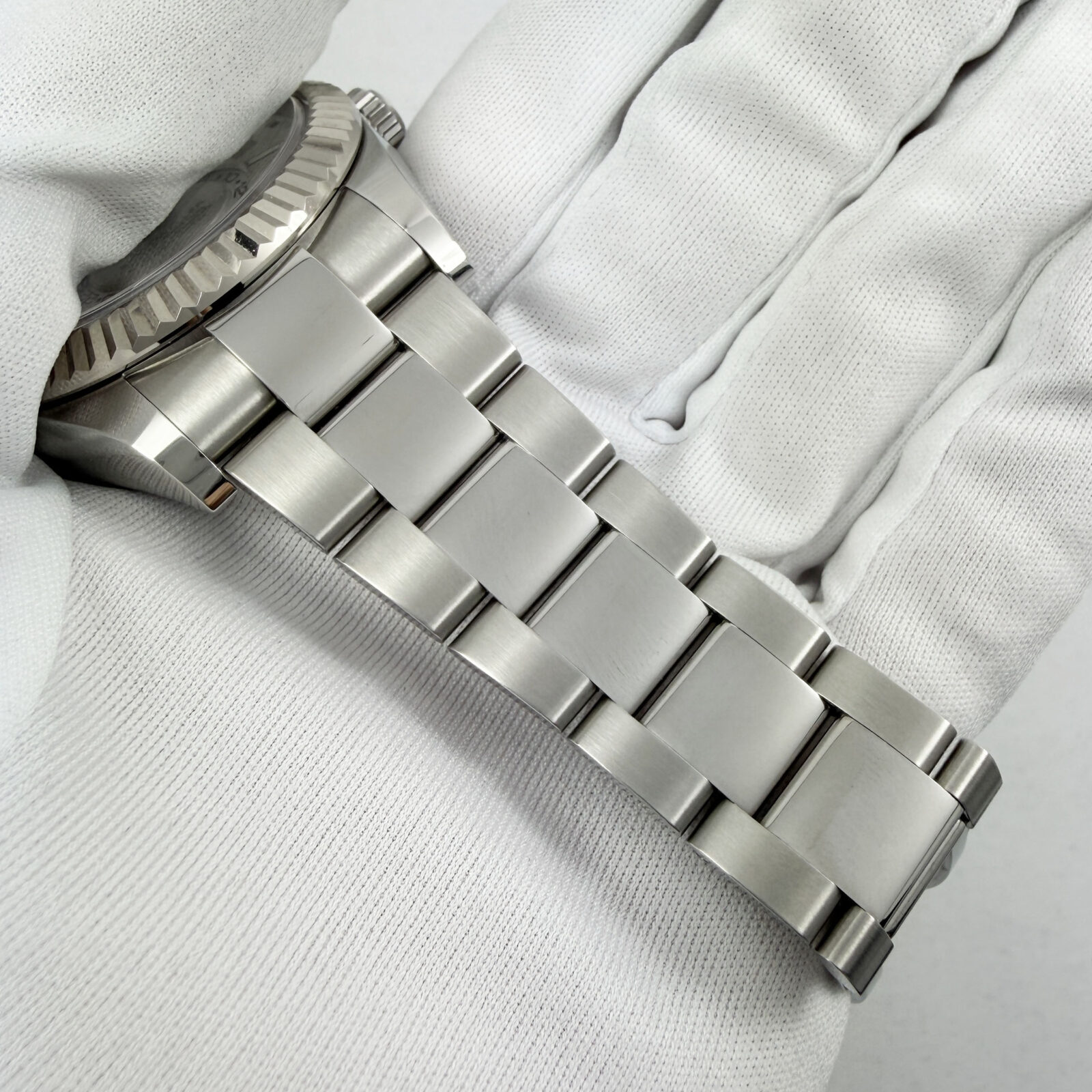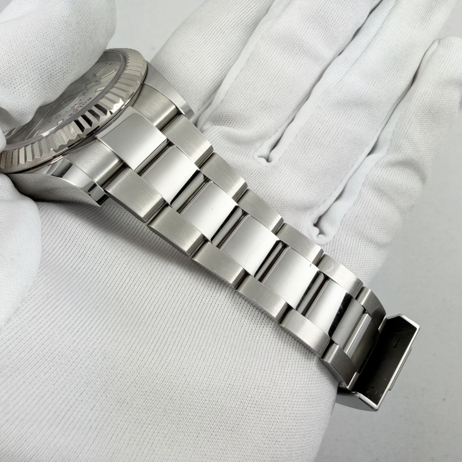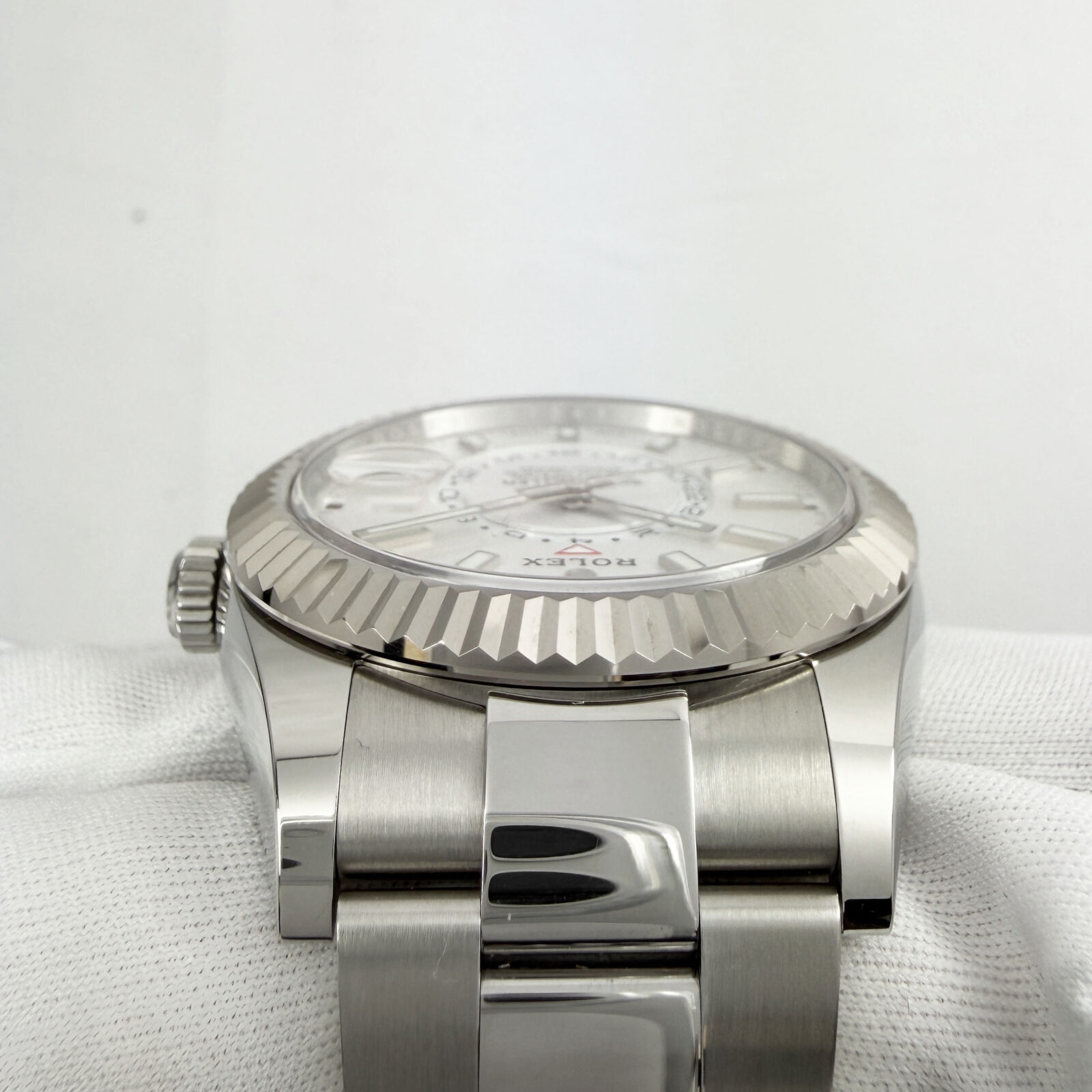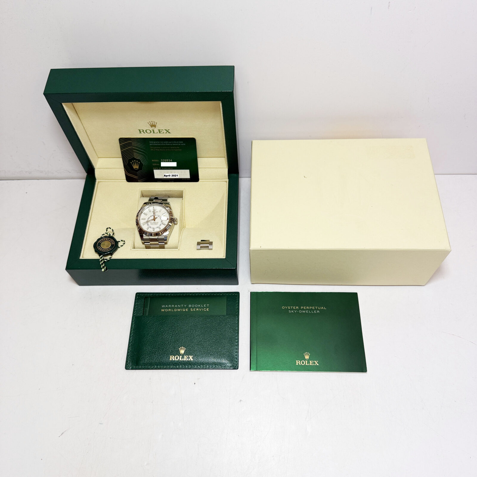 this rolex sky-dweller watch comes with its box, hangtag, extra link, booklets, and warranty card dated april, 2021. The photos shown are of the exact watch being sold and accurately represent its condition. This watch is in stock and ready to ship immediately!
