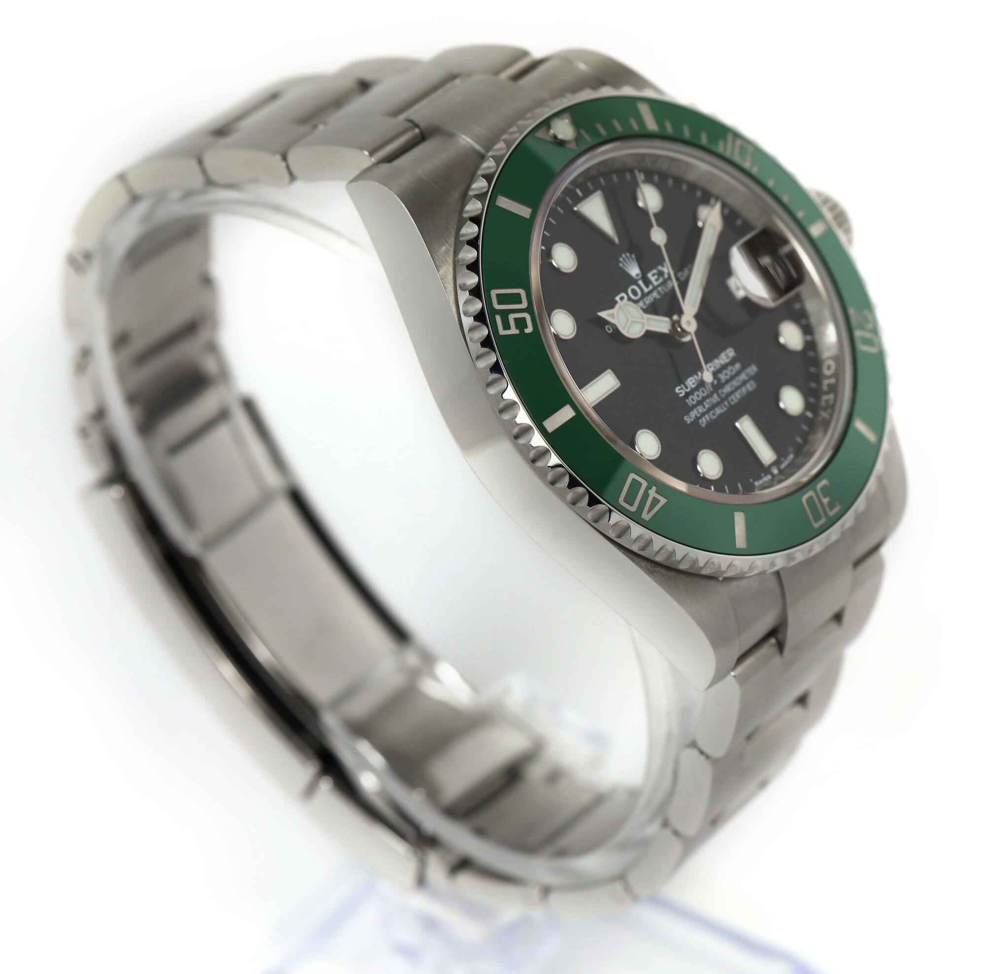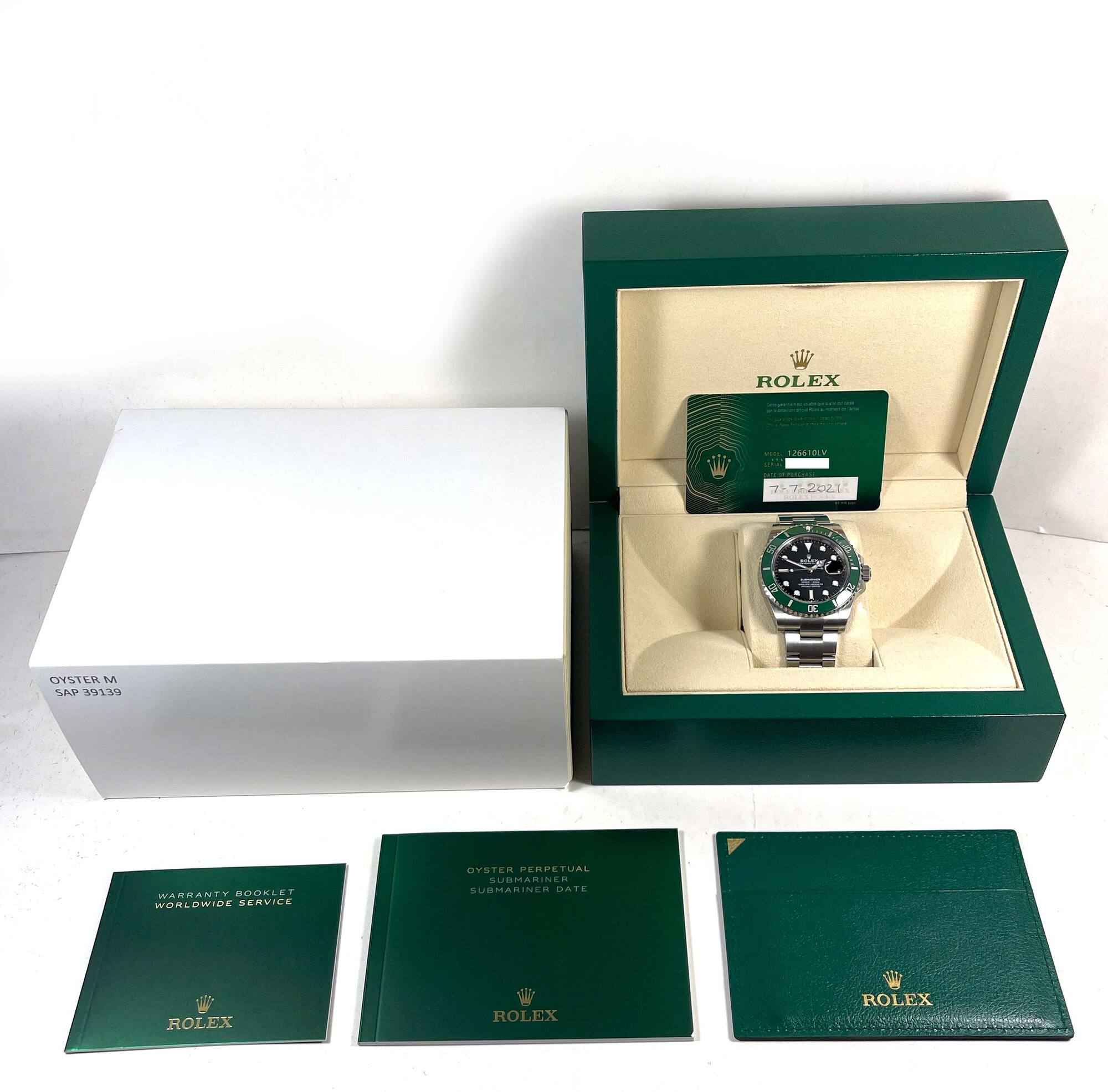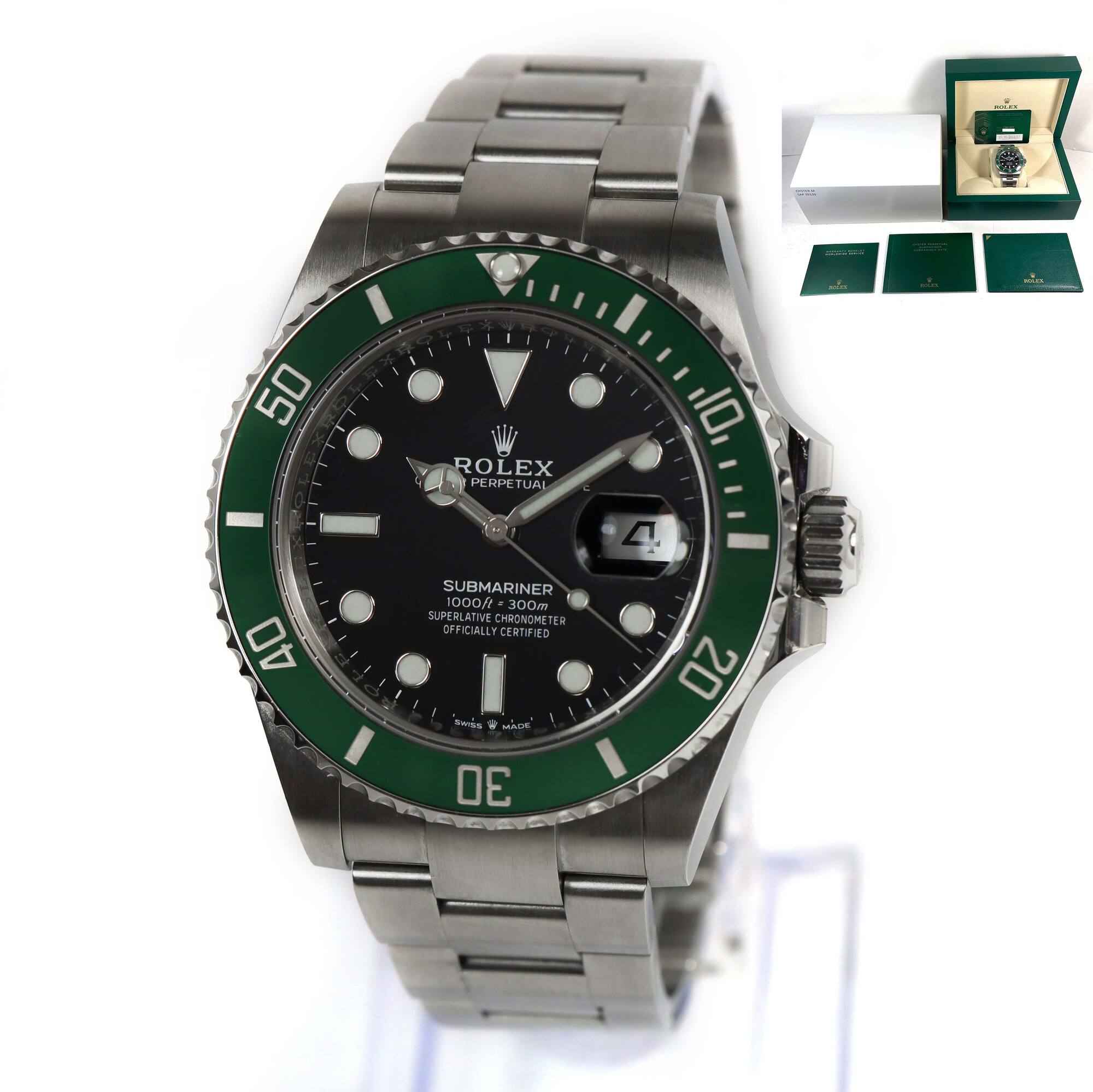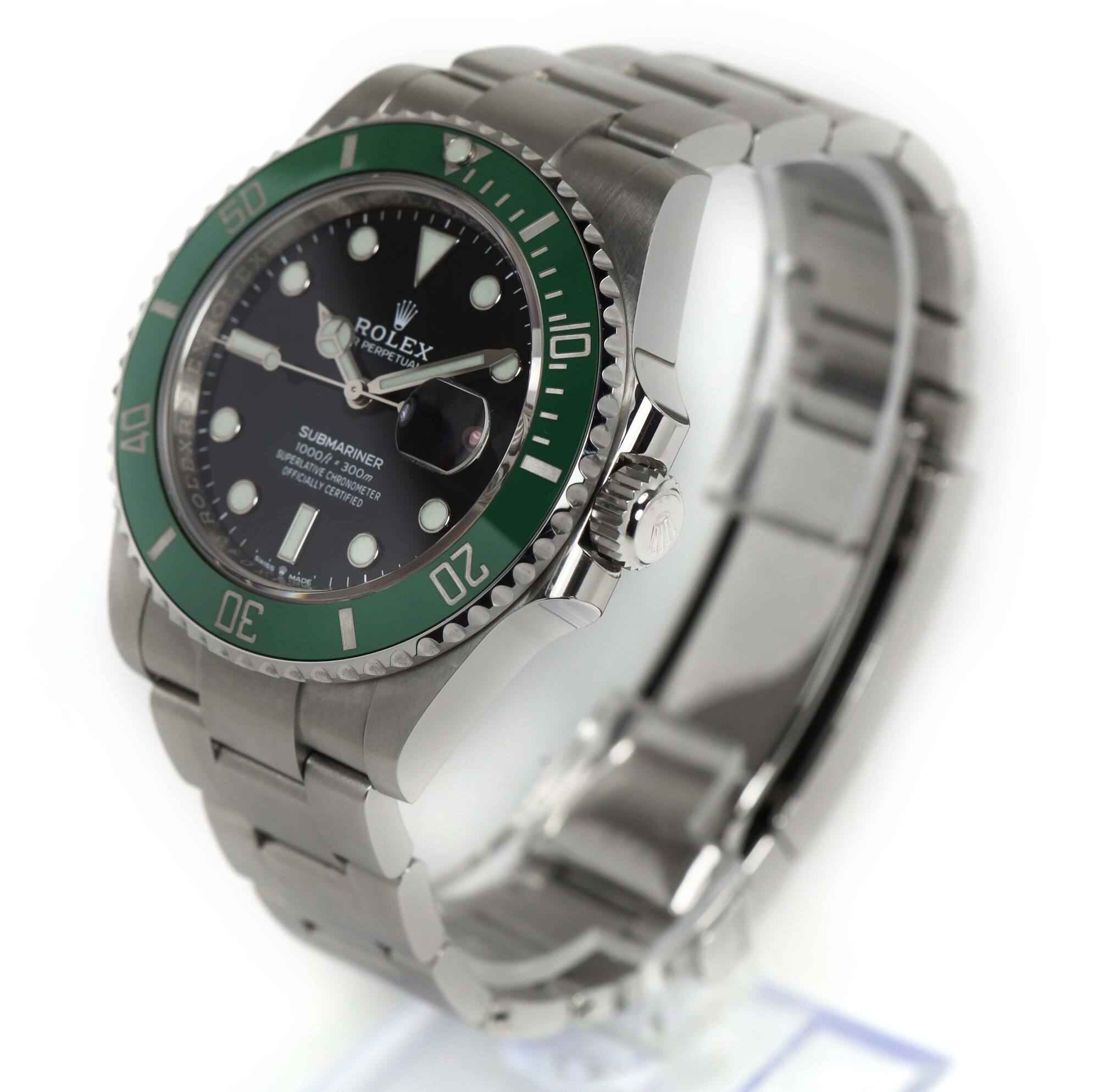 this rolex is in excellent condition with the green caseback sticker still attached and comes with its box, booklets, and warranty card dated july 7th, 2021 as shown in the pictures attached. This watch is in stock and available to ship immediately!