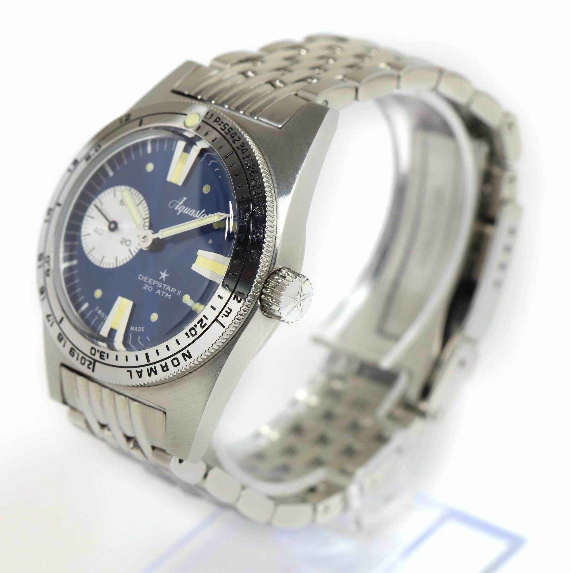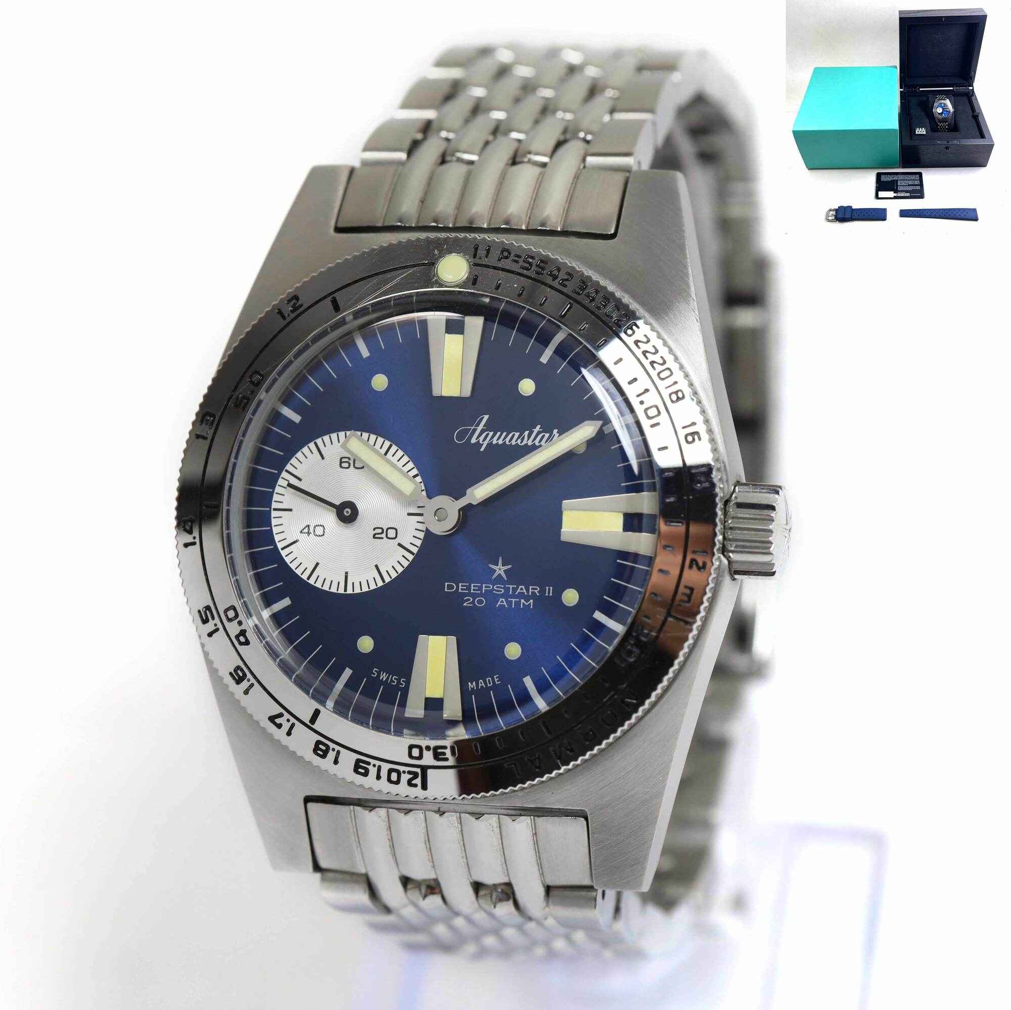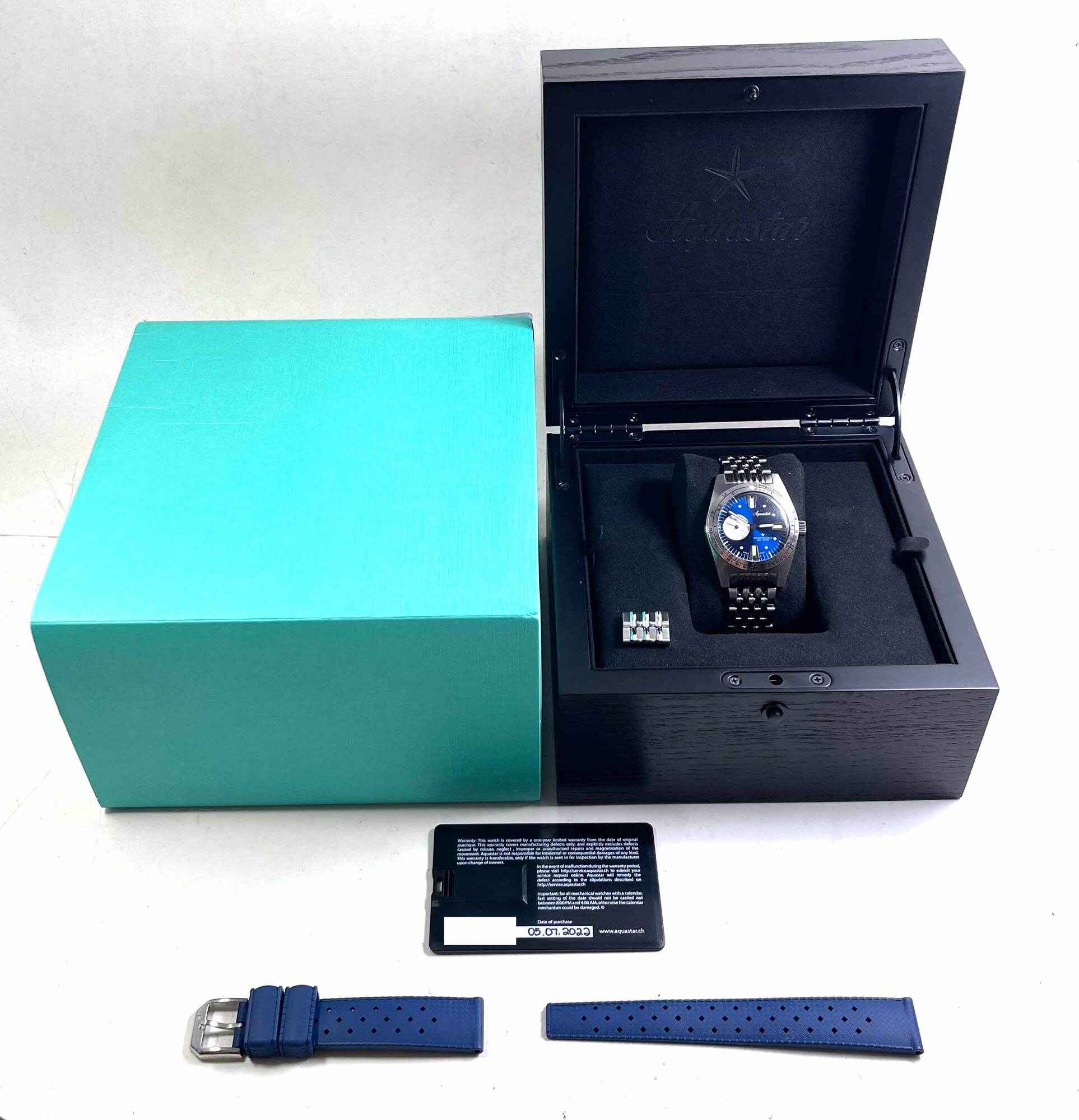 THIS AQUASTAR WATCH IS IN GREAT CONDITION SHOWING SOME SIGNS OF WEAR ON CASE, BEZEL, AND BRACELET CONSISTENT WITH PREOWNED WATCHES. THIS COMES WITH ITS BOX, SPARE LINKS, ONE SPARE BLUE RUBBER STRAP, AND WARRANTY CARD DATED MAY 7TH, 2022. THIS WATCH IS IN ST...