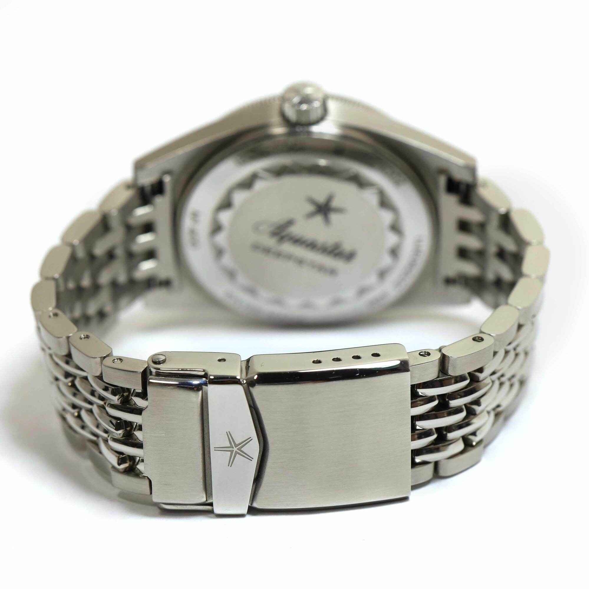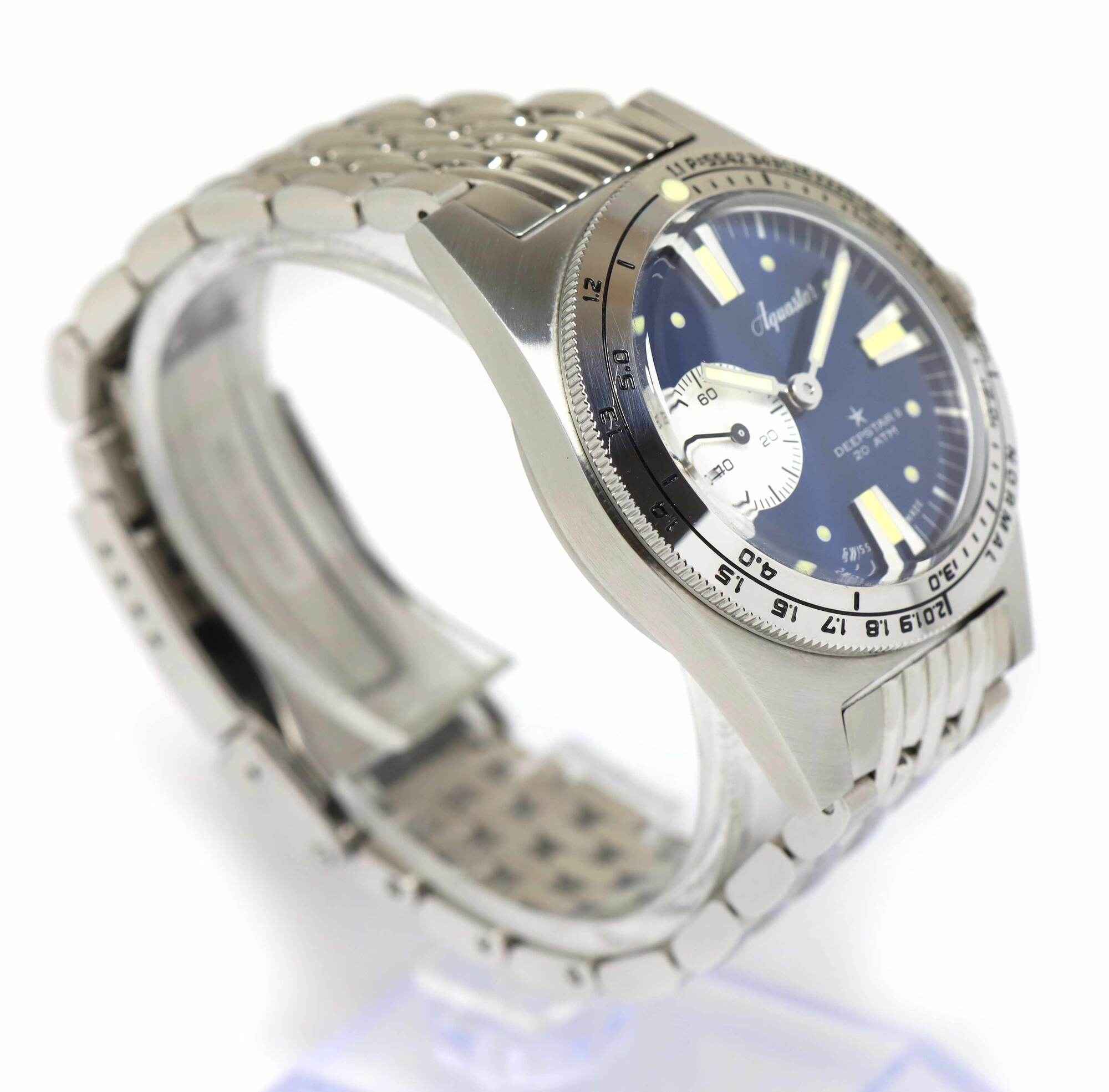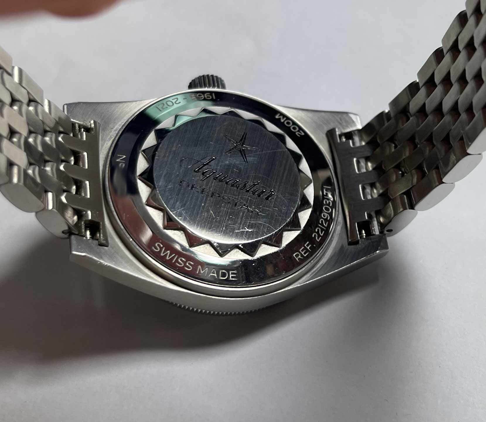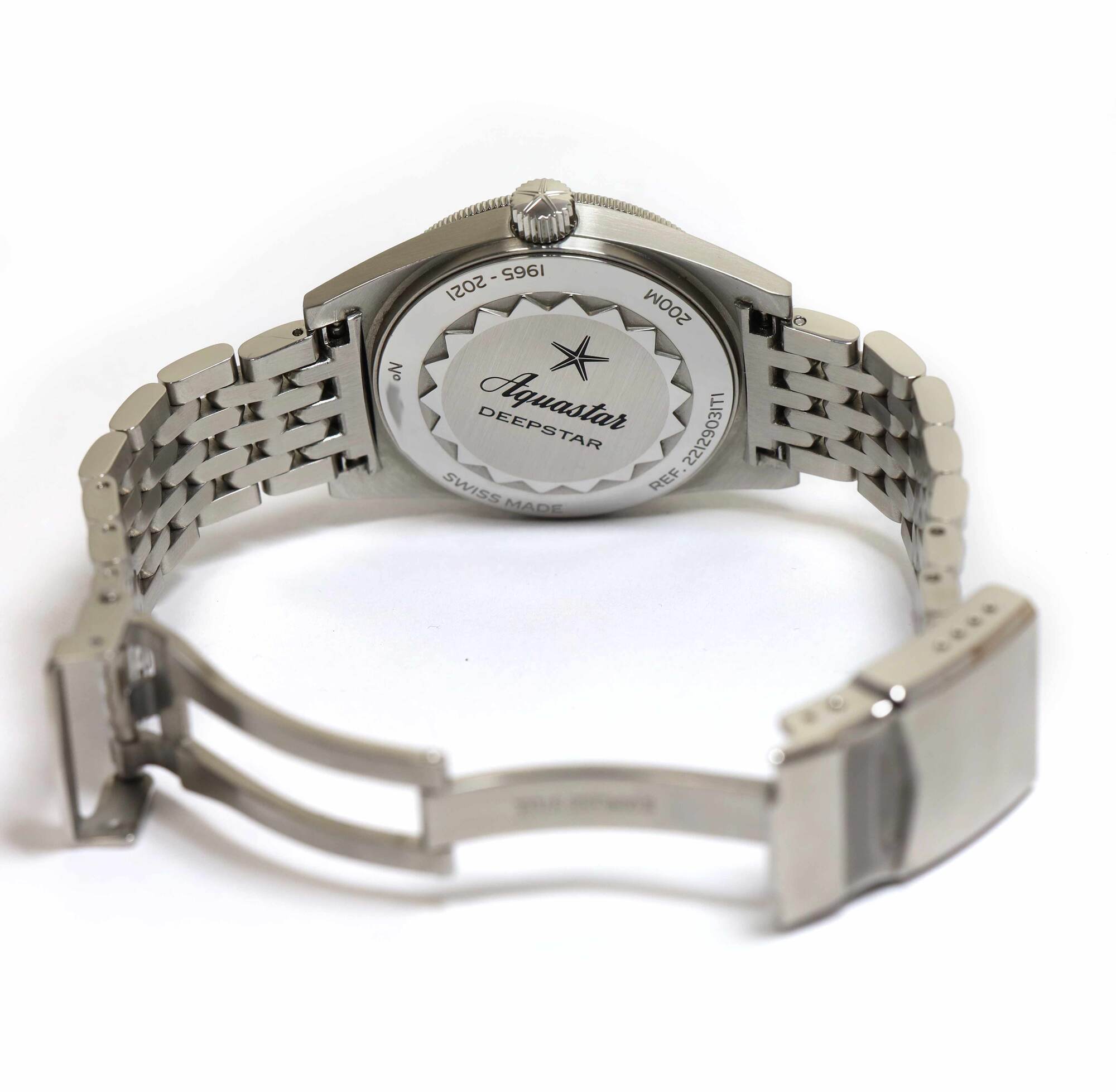 THIS AQUASTAR WATCH IS IN GREAT CONDITION SHOWING SOME SIGNS OF WEAR ON CASE, BEZEL, AND BRACELET CONSISTENT WITH PREOWNED WATCHES. THIS COMES WITH ITS BOX, SPARE LINKS, ONE SPARE BLUE RUBBER STRAP, AND WARRANTY CARD DATED MAY 7TH, 2022. THIS WATCH IS IN ST...