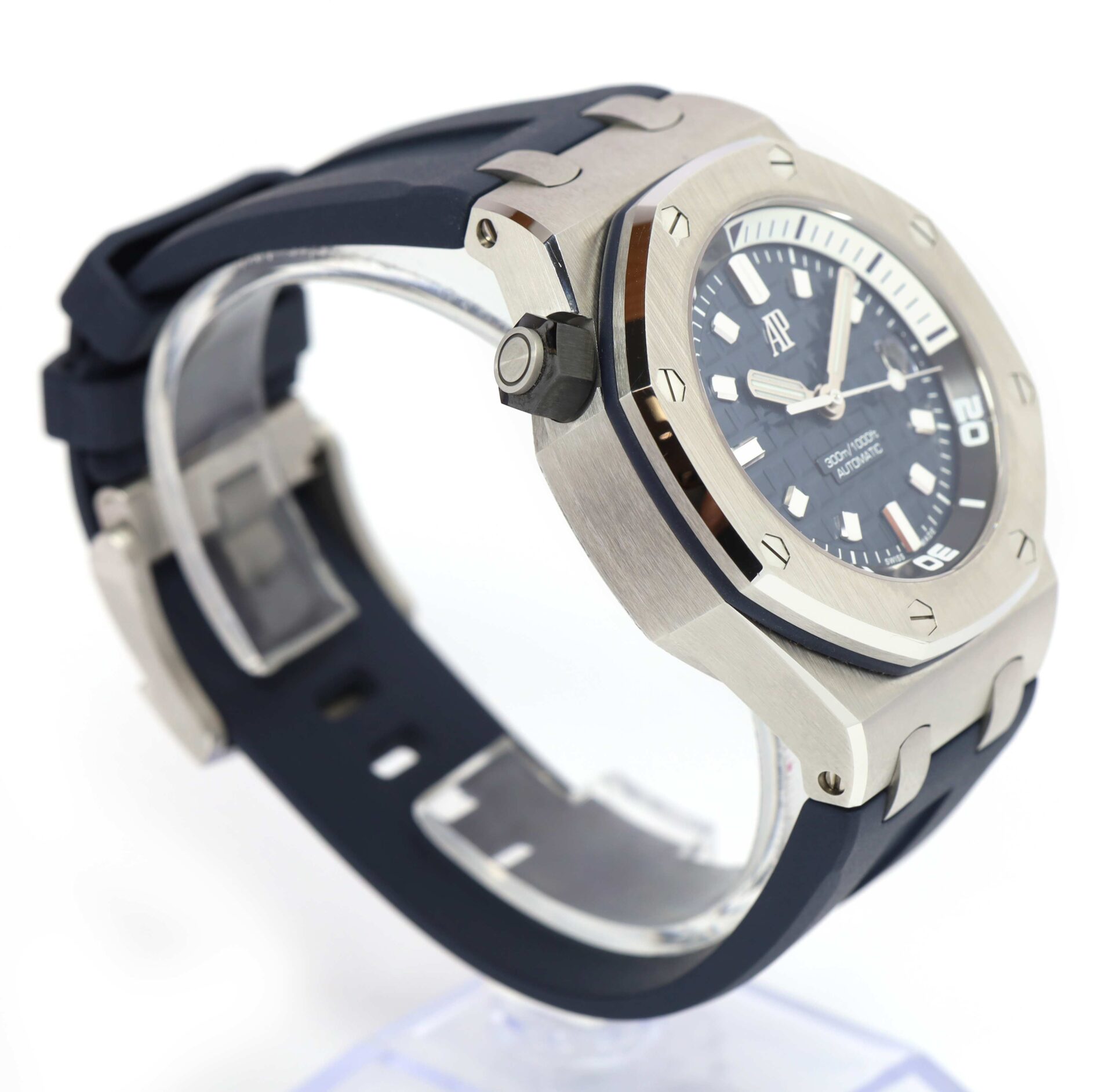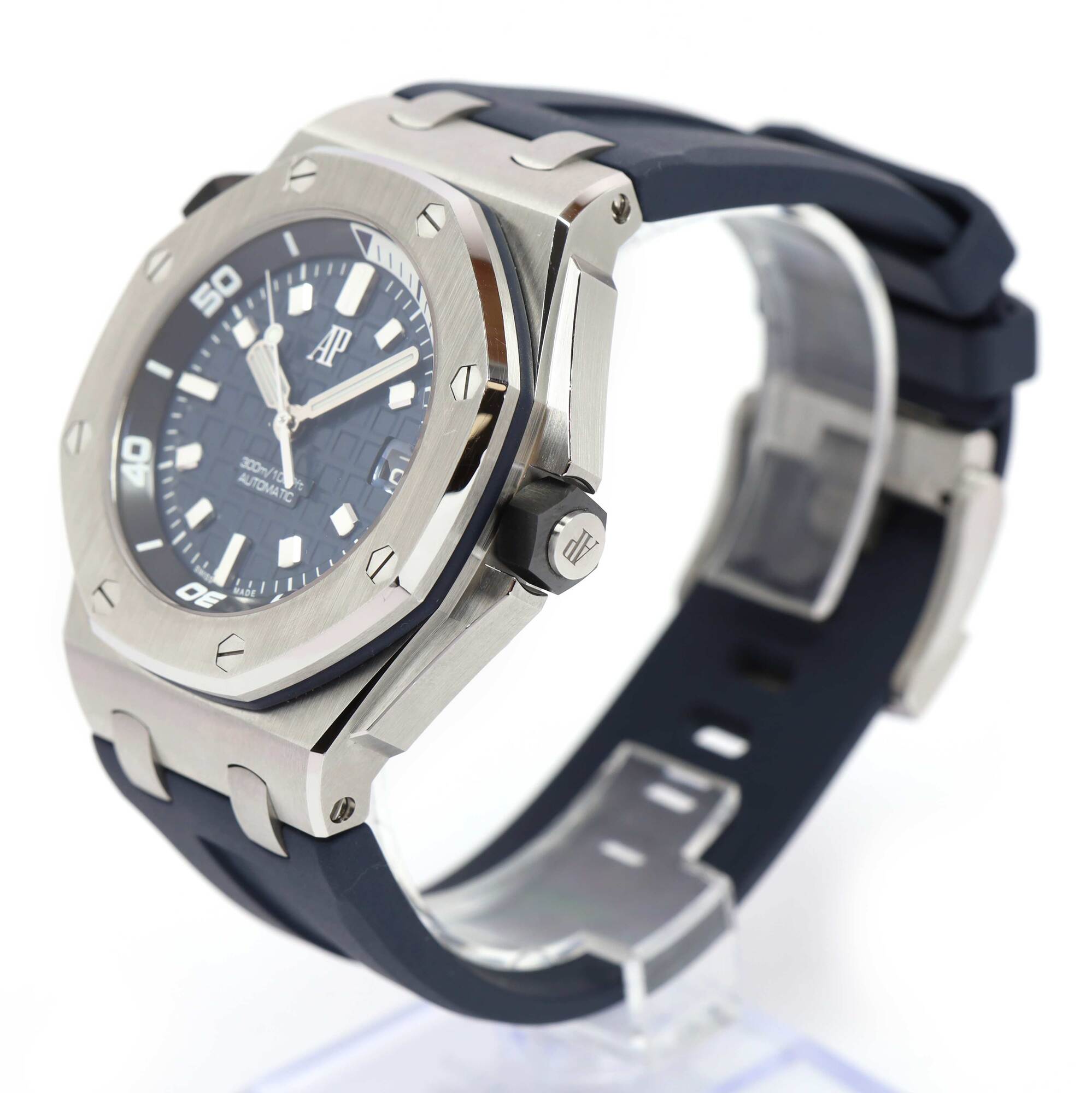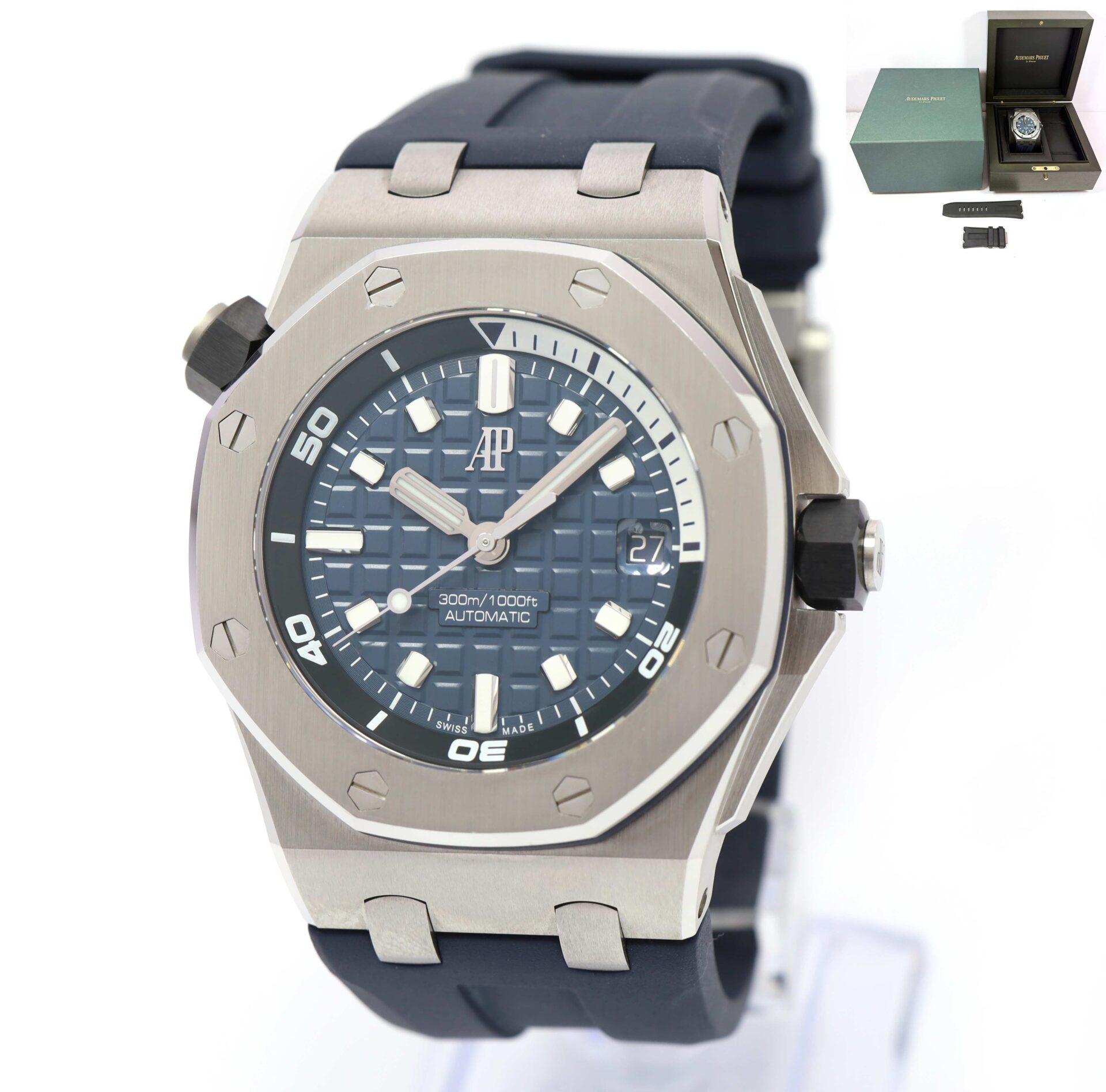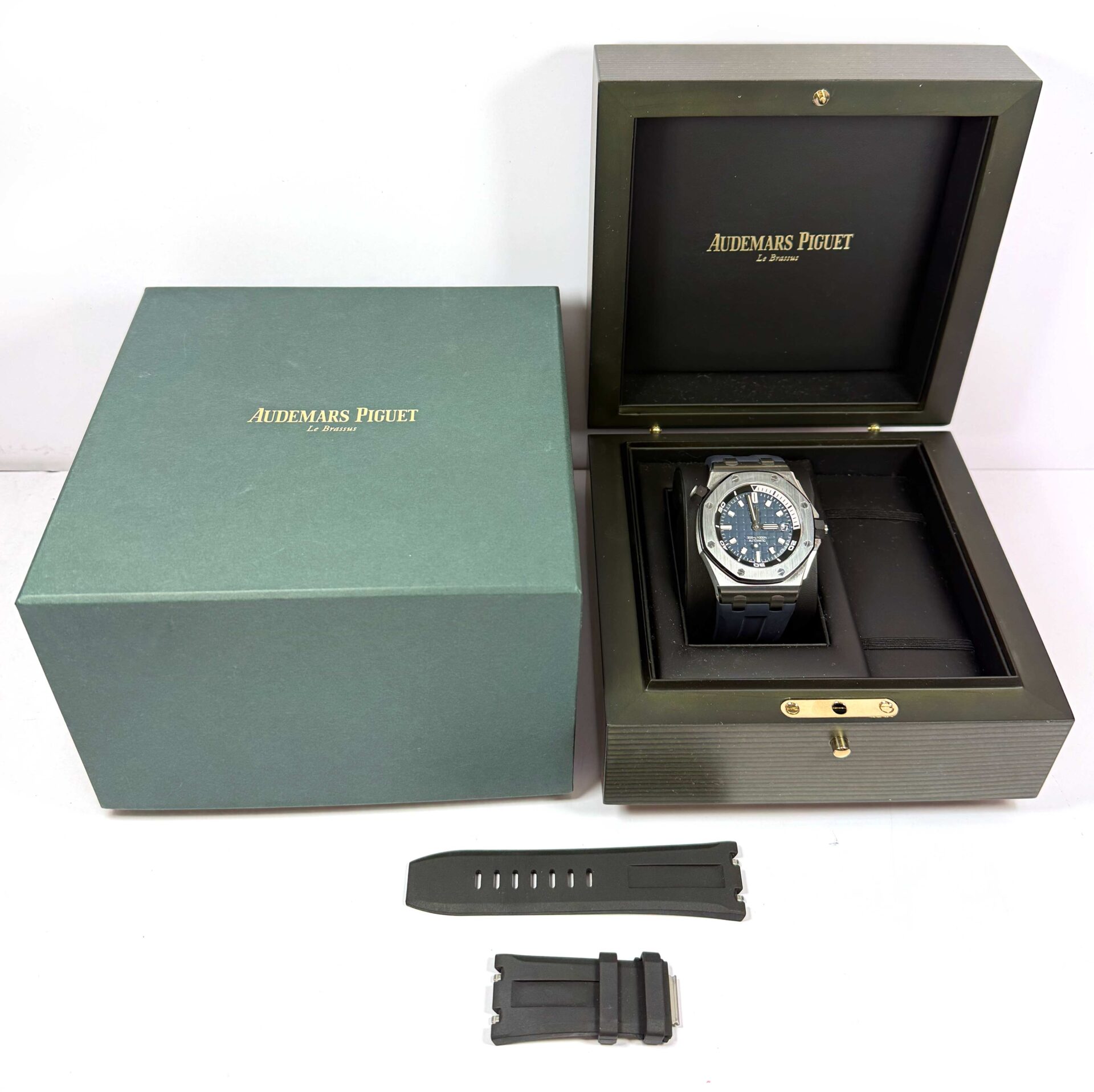 THIS AUDEMARS PIGUET IS IN EXCELLENT CONDITION AND COMES WITH ITS BOX AND ONE ADDITIONAL BLACK RUBBER STRAP AS SHOWN IN THE PICTURES ATTACHED. THIS WATCH IS IN STOCK AND AVAILABLE TO SHIP IMMEDIATELY!