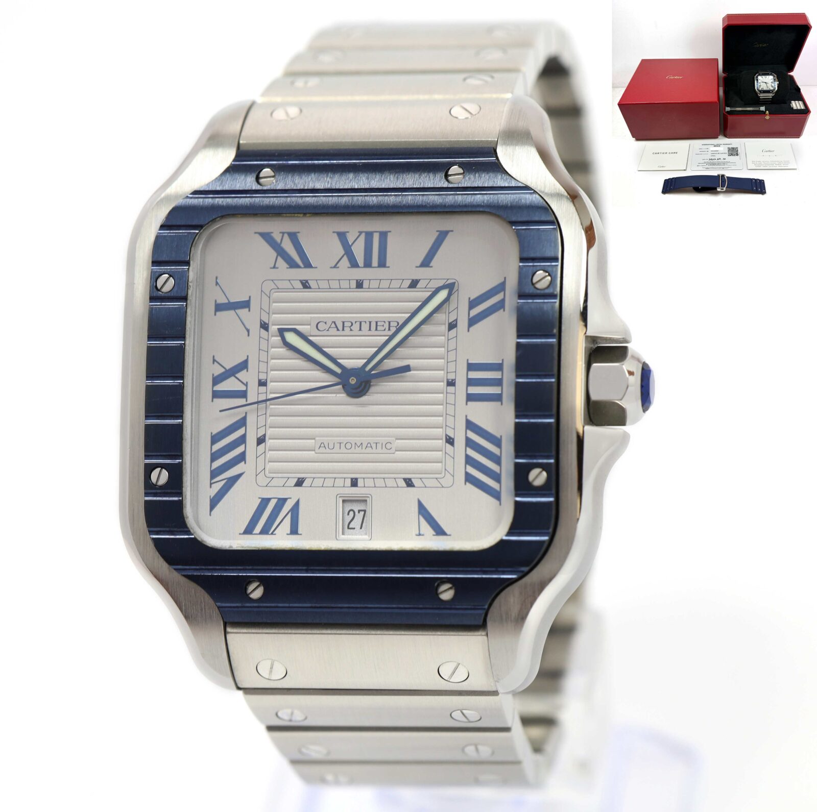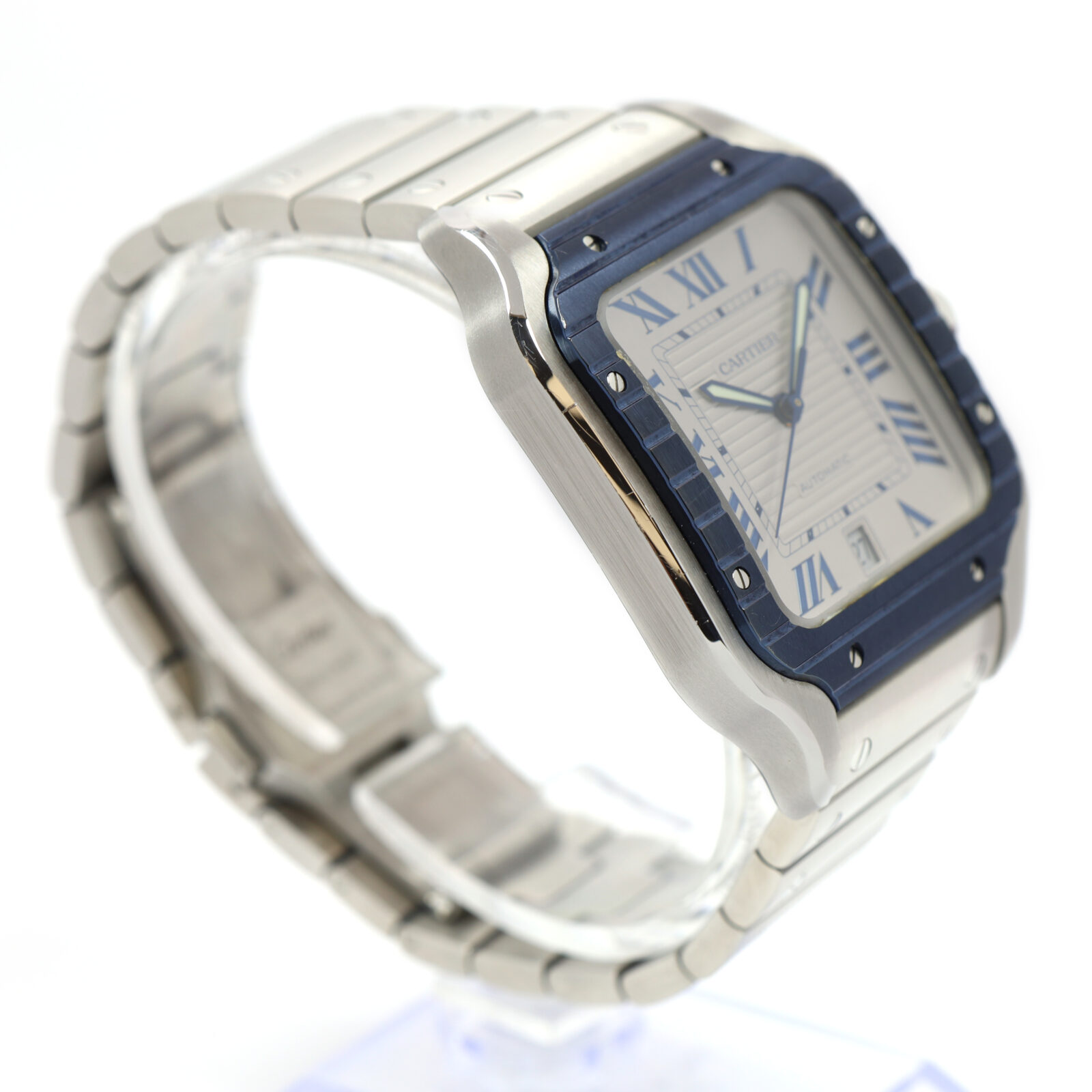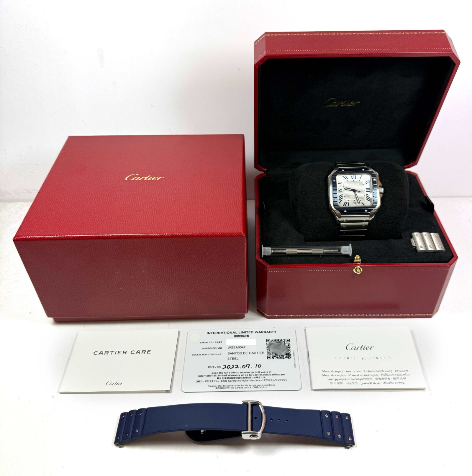 this cartier watch is in great overall condition showing some signs of surface wear consistent with preowned watches. This comes with its box, booklets, cartier tool, one additional blue rubber strap, spare links, and warranty card dated july 10th, 2022 as shown in the pictures attached. This watch is in stock and available to ship immediately!
