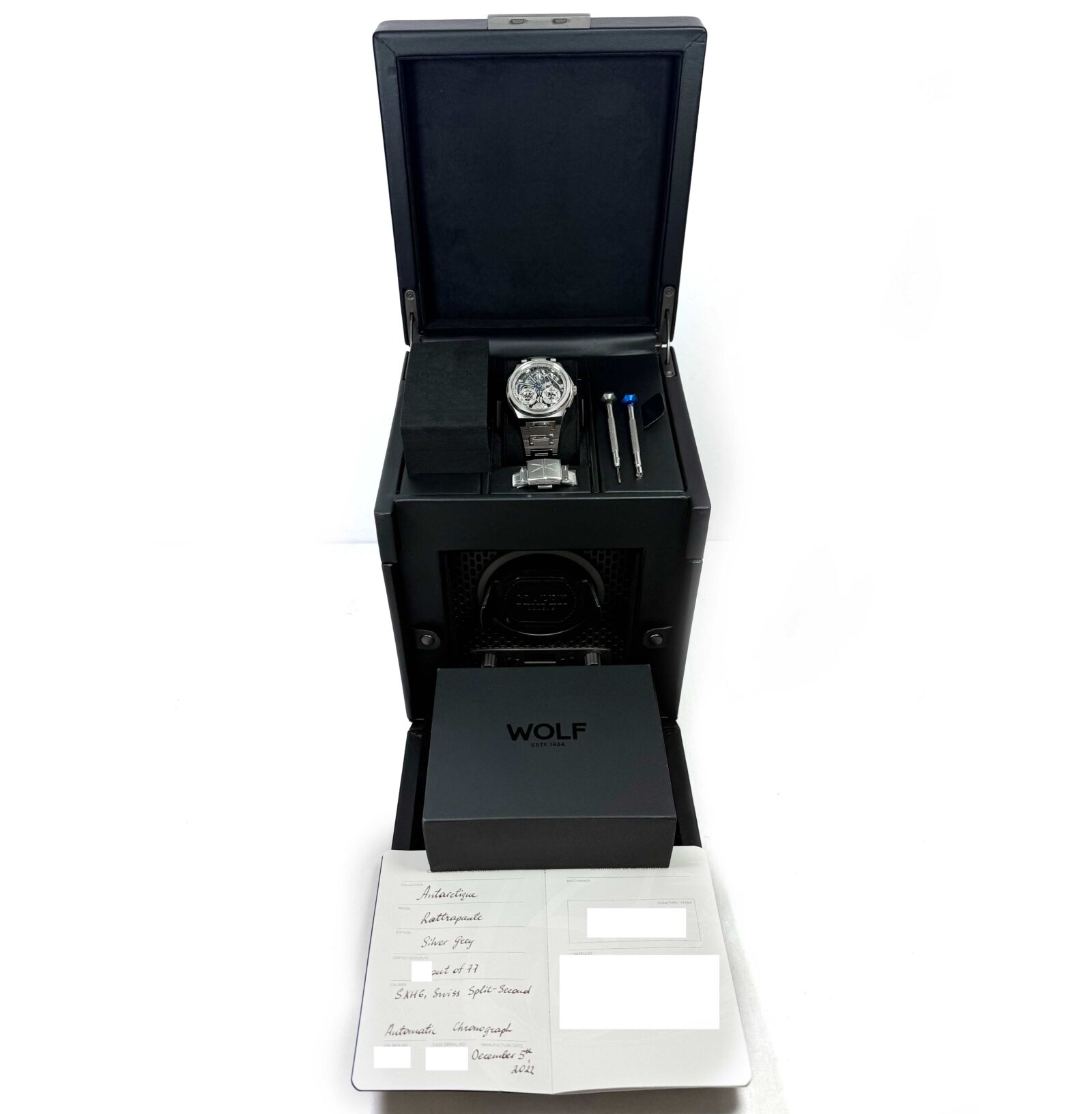 this czapek watch is in excellent overall condition and comes with its box, booklets, czapek tools, one additional clasp, watch winder, and warranty paper dated december 5th, 2022 as shown in the pictures attached. This watch is in stock and available to ship immediately!