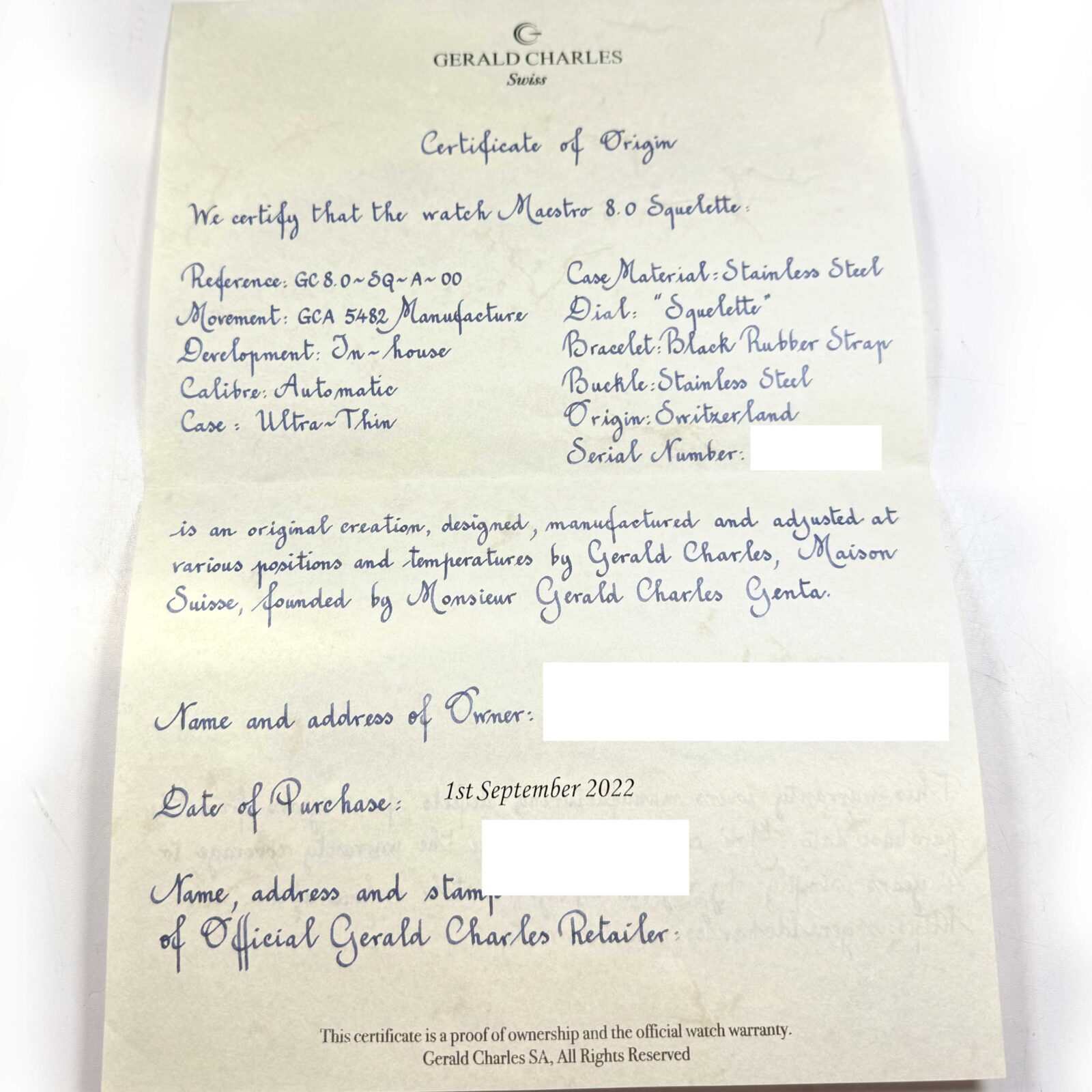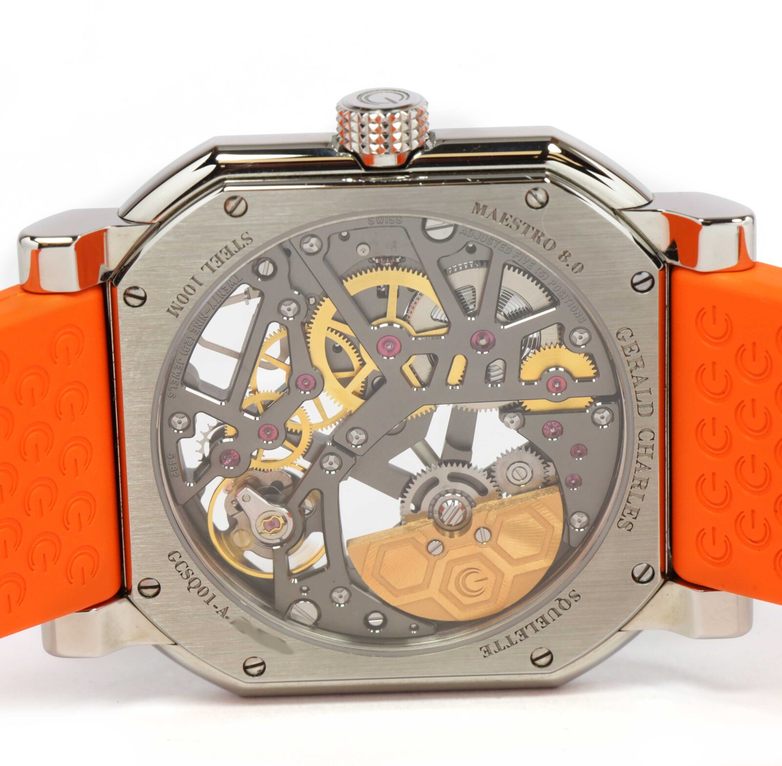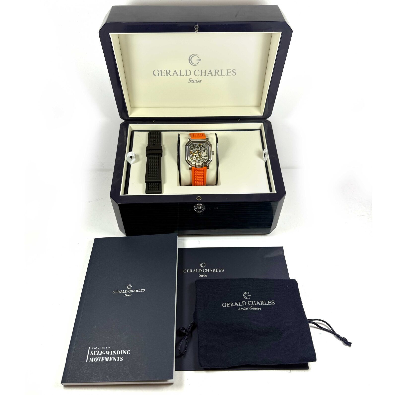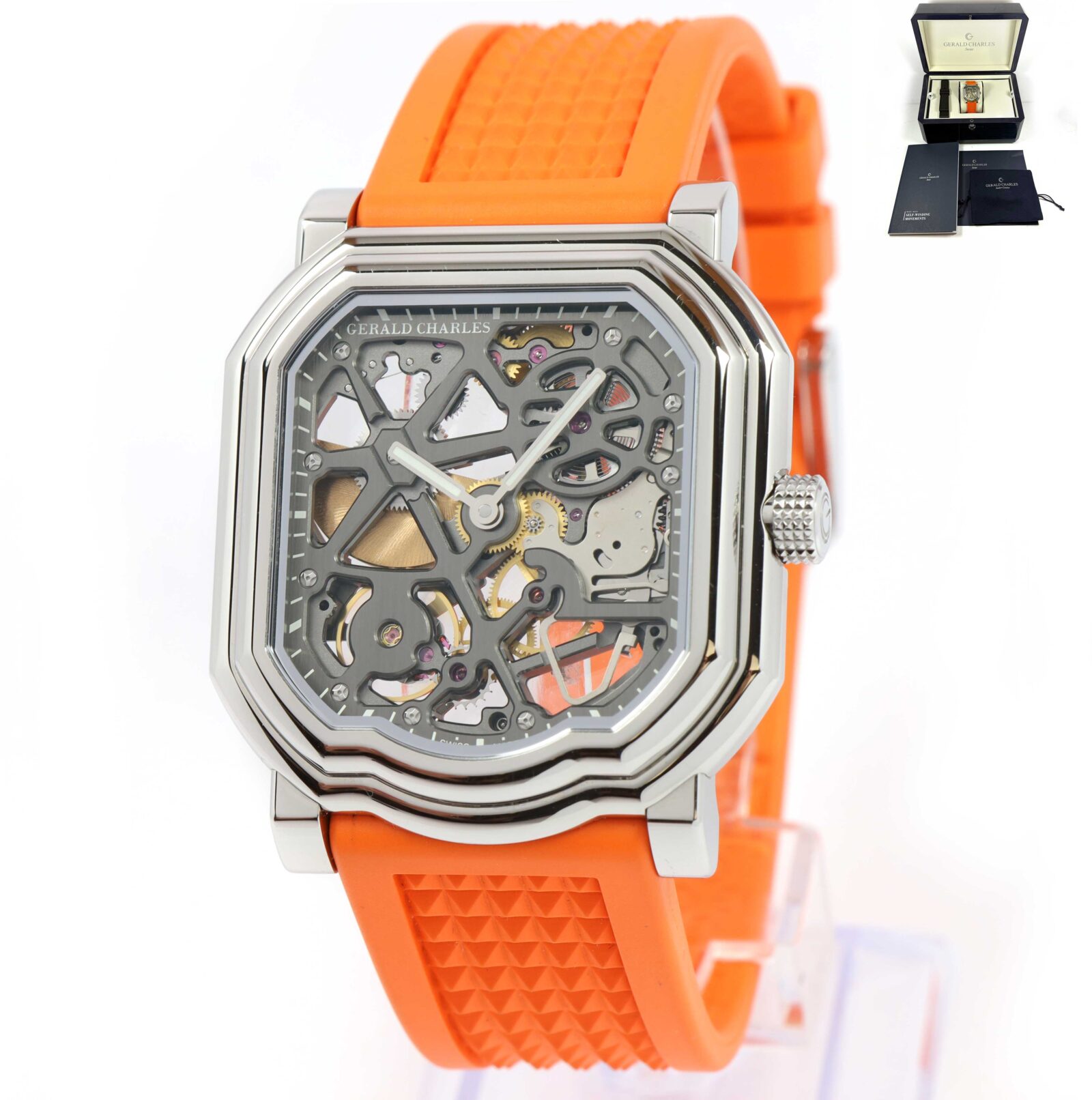 Read Morethis gerald charles watch is in amazing condition and comes with its box, booklets, one additional black rubber strap, and warranty paper dated september 1st, 2022 as shown in the pictures attached. This watch is in stock and available to ship immediately!