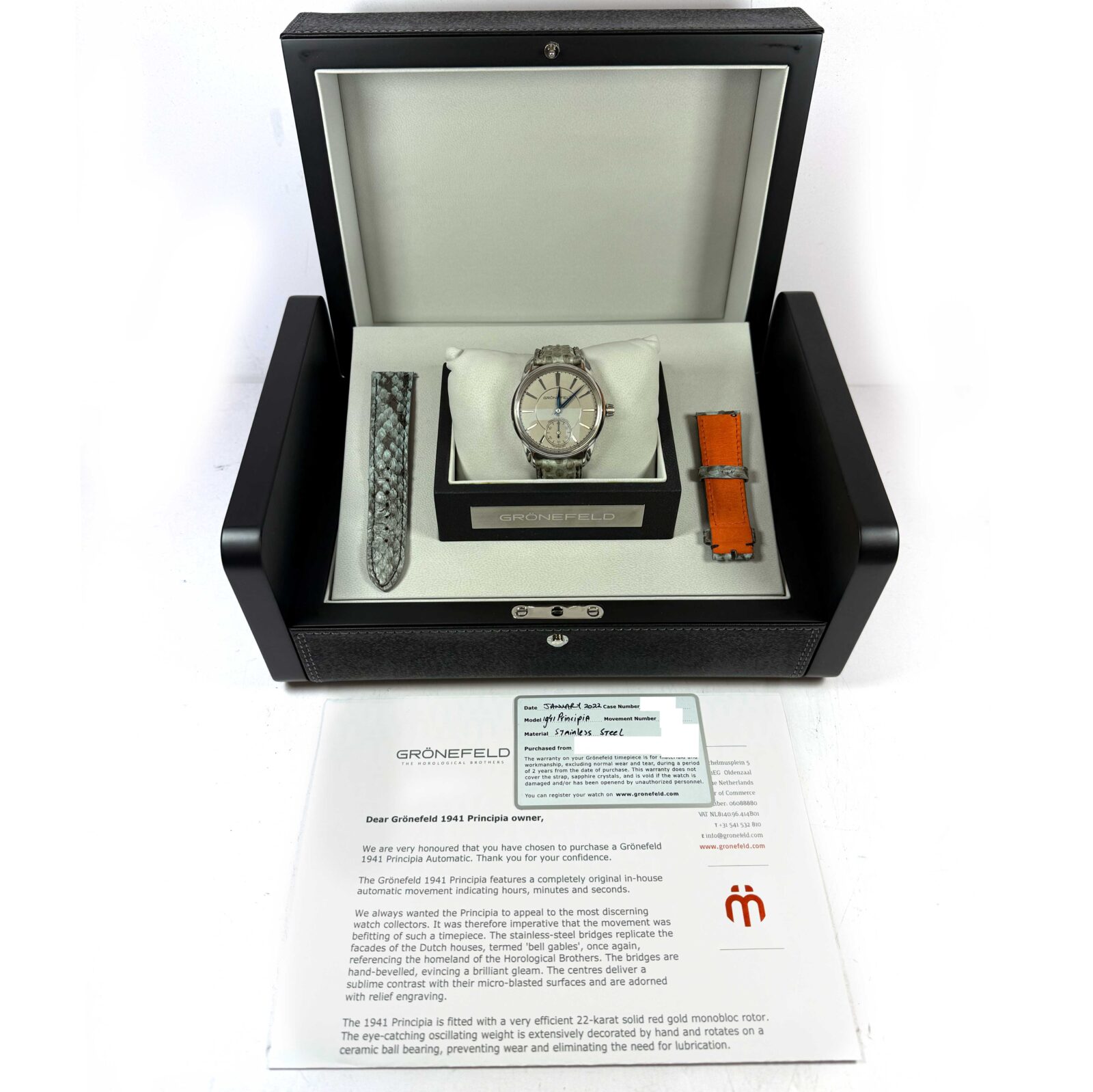 this grönefeld watch is in excellent condition and comes with its box, one additional strap, and warranty card dated january 2022 as shown in the pictures attached. This watch is in stock and available to ship immediately!