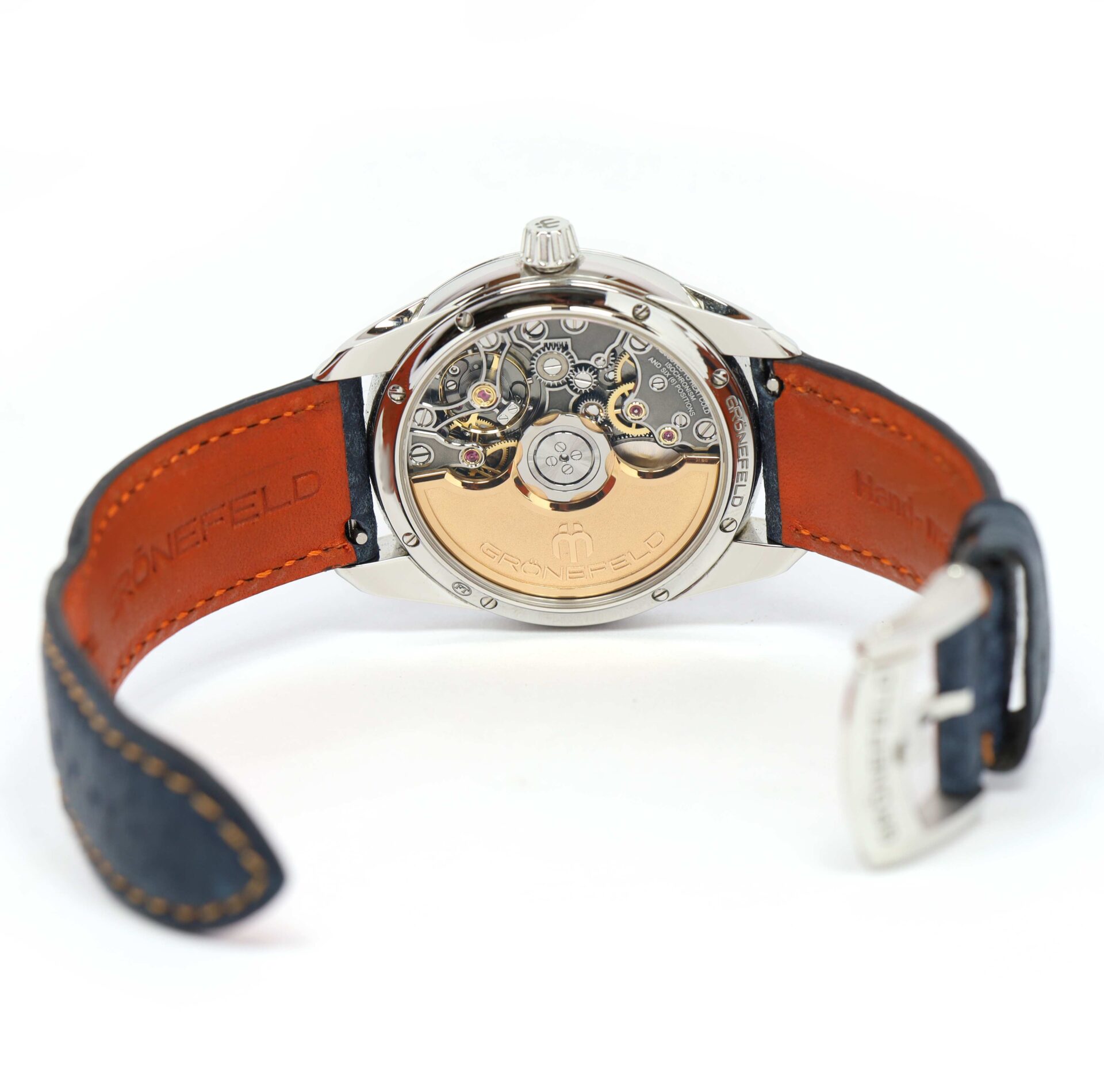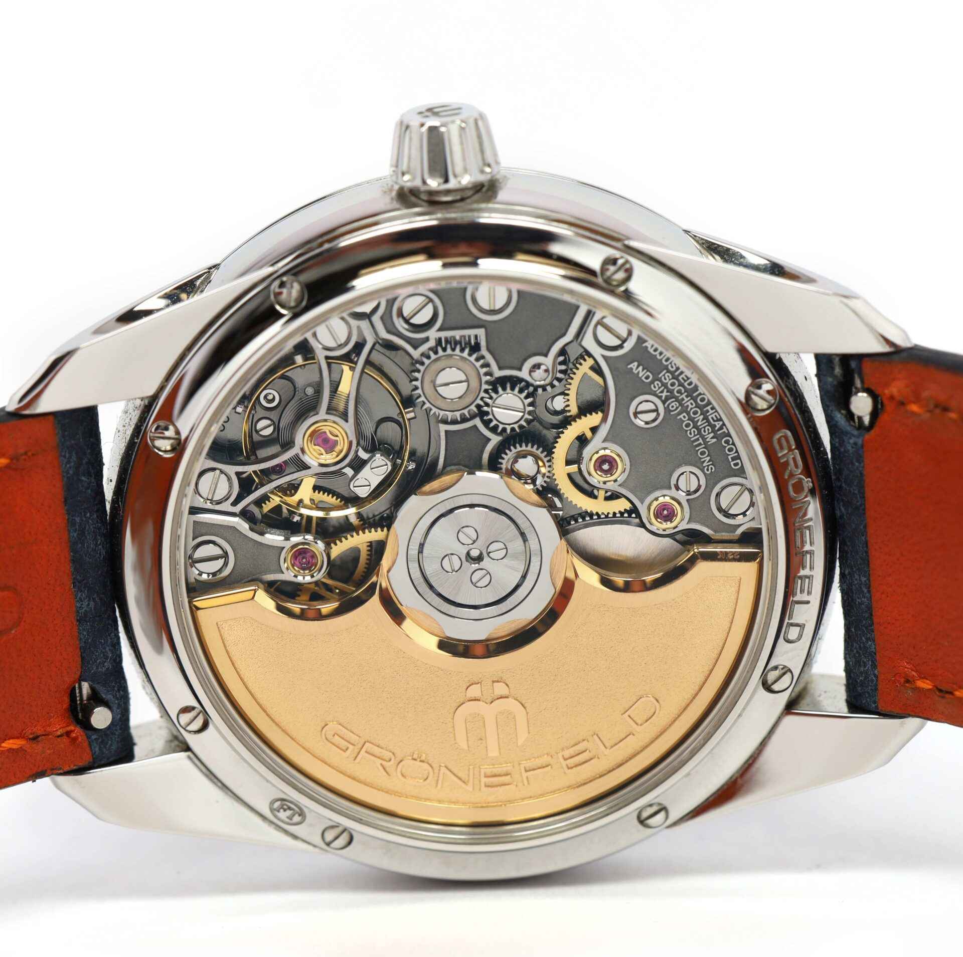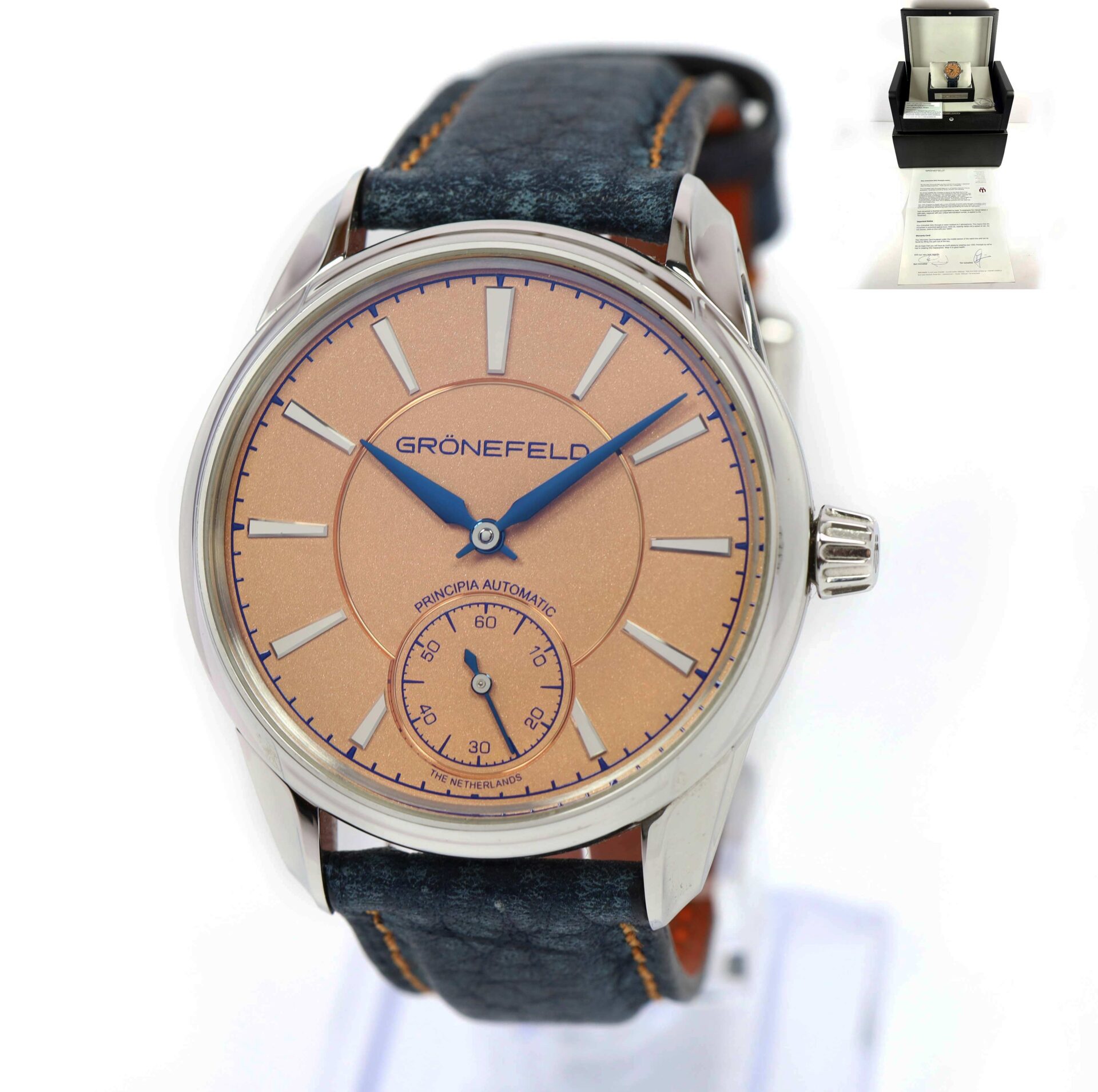 THIS GRONEFELD WATCH IS IN EXCELLENT OVERALL CONDITION SHOWING SOME LIGHT SIGNS OF WEAR ON THE CASE CONSISTENT WITH PREOWNED WATCHES. THIS COMES WITH ITS BOX, BOOKLETS, HANG TAG, AND WARRANTY CARD DATED APRIL 7TH, 2022 AS SHOWN IN THE PICTURES ATTACHED. THI...