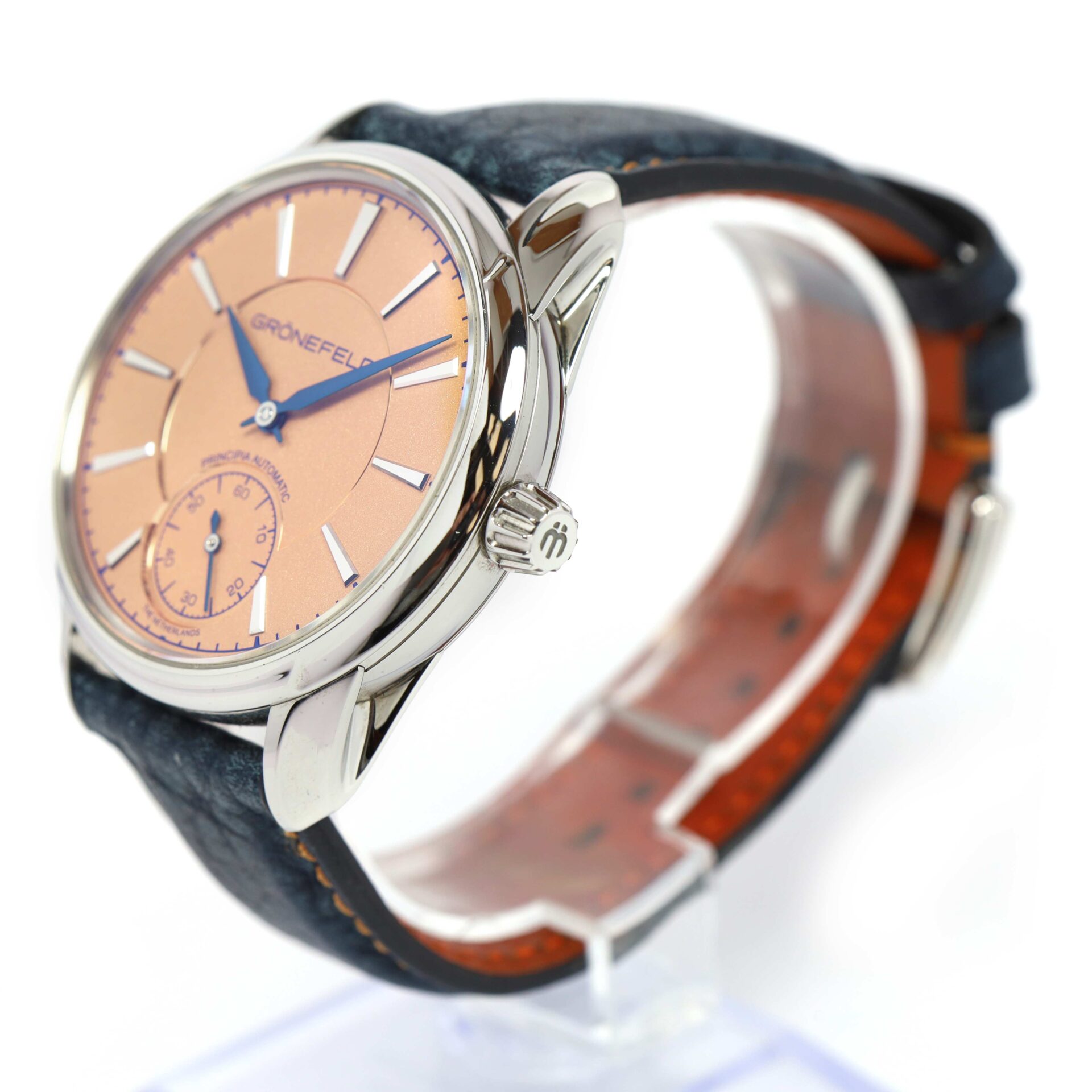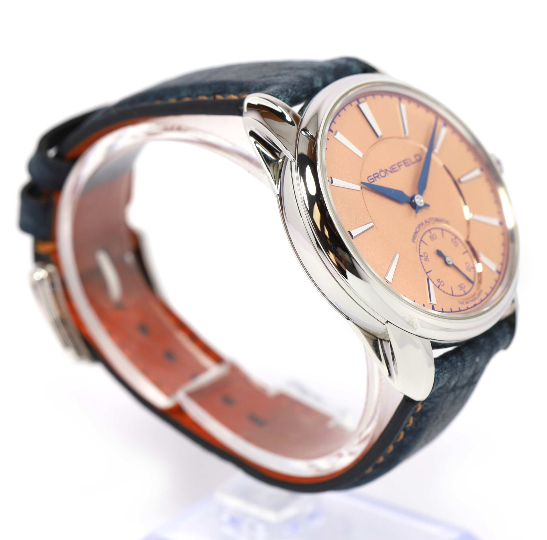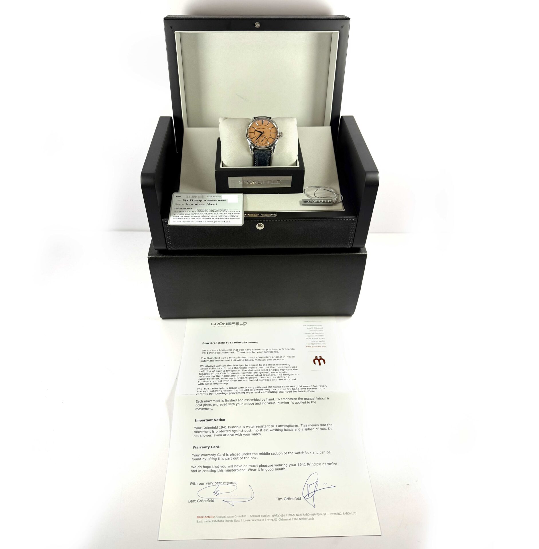 THIS GRONEFELD WATCH IS IN EXCELLENT OVERALL CONDITION SHOWING SOME LIGHT SIGNS OF WEAR ON THE CASE CONSISTENT WITH PREOWNED WATCHES. THIS COMES WITH ITS BOX, BOOKLETS, HANG TAG, AND WARRANTY CARD DATED APRIL 7TH, 2022 AS SHOWN IN THE PICTURES ATTACHED. THI...