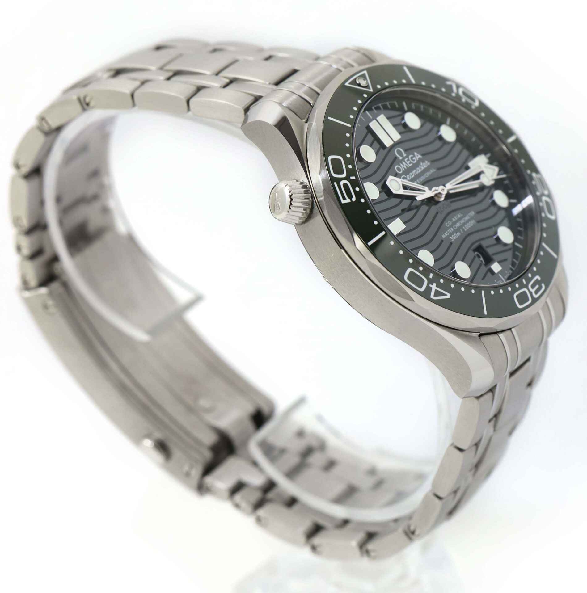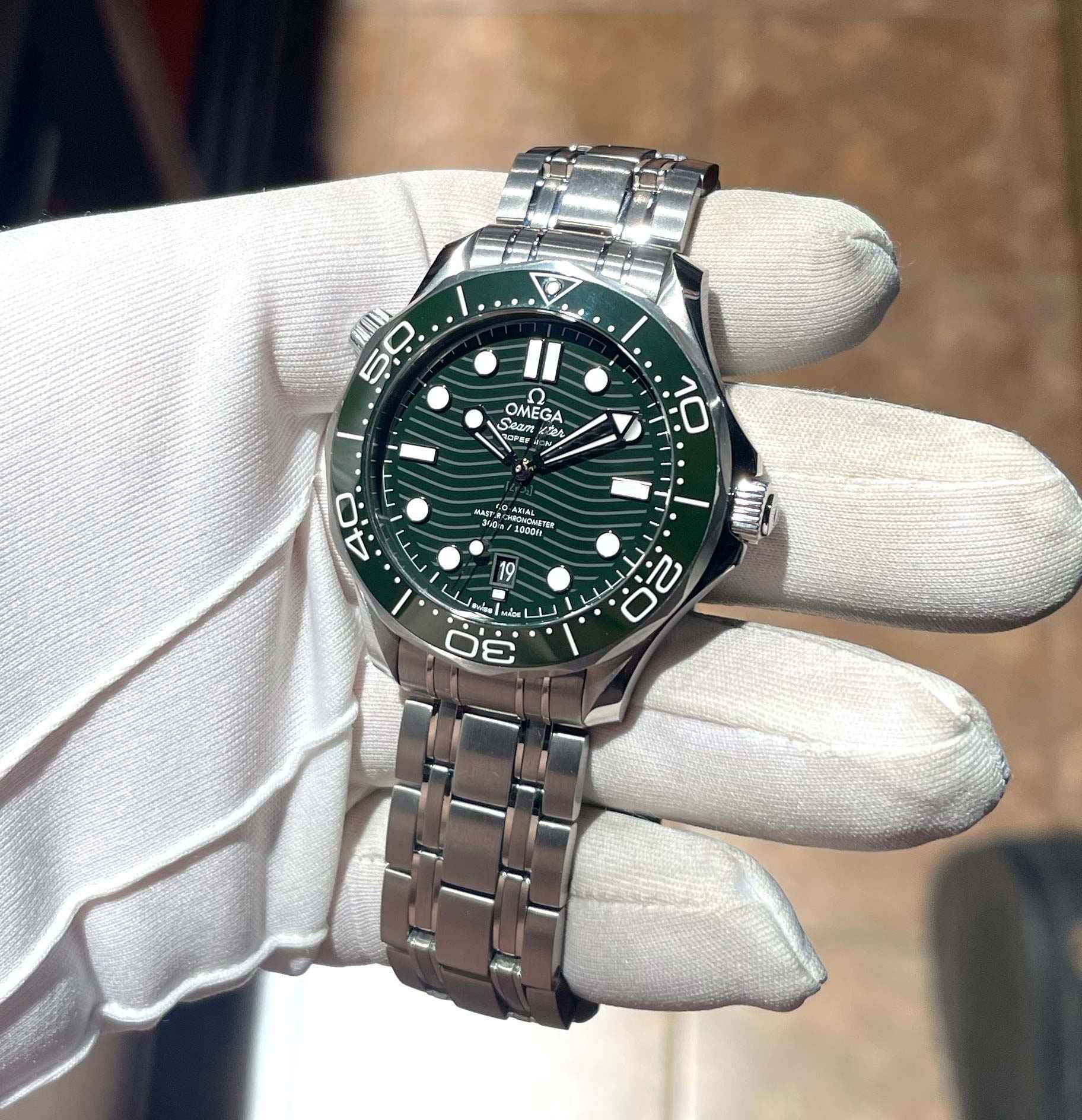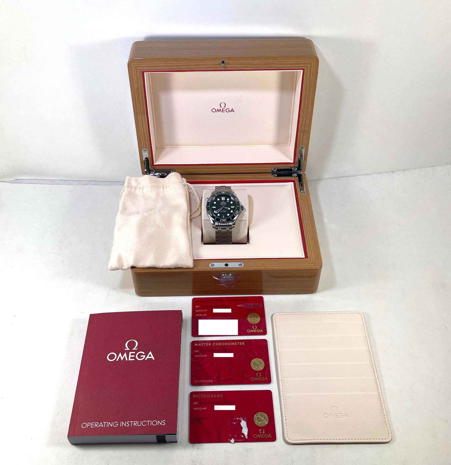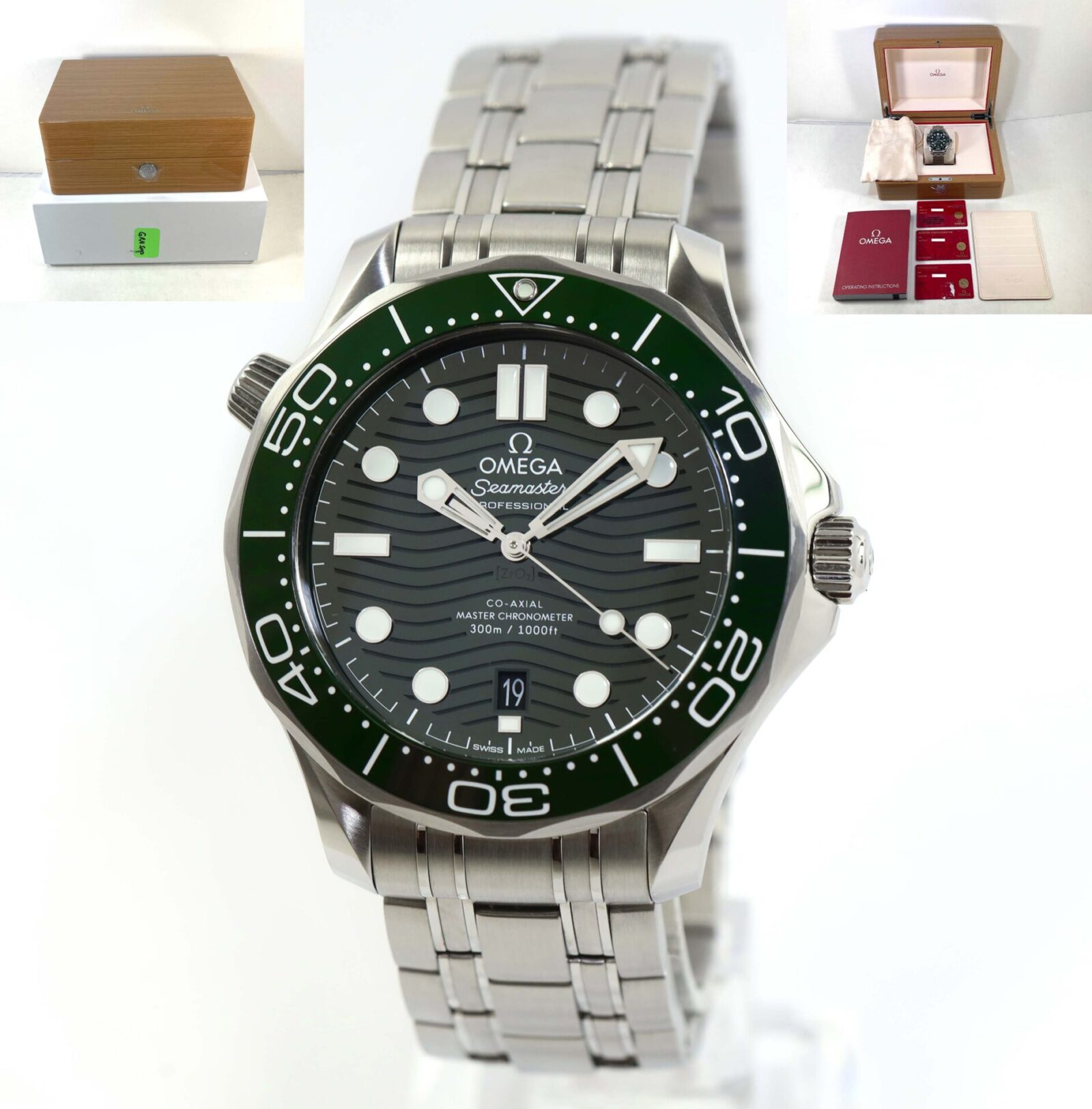 Read Morethis omega seamaster is in excellent condition and comes with its box, booklets, hang tag, and warranty cards dated june 7th, 2022. This watch features a stainless steel case and bracelet with a green bezel and green dial. This dial was difficult to capture the true color so i added one additional picture in there to show. This watch is in stock and available to ship immediately!