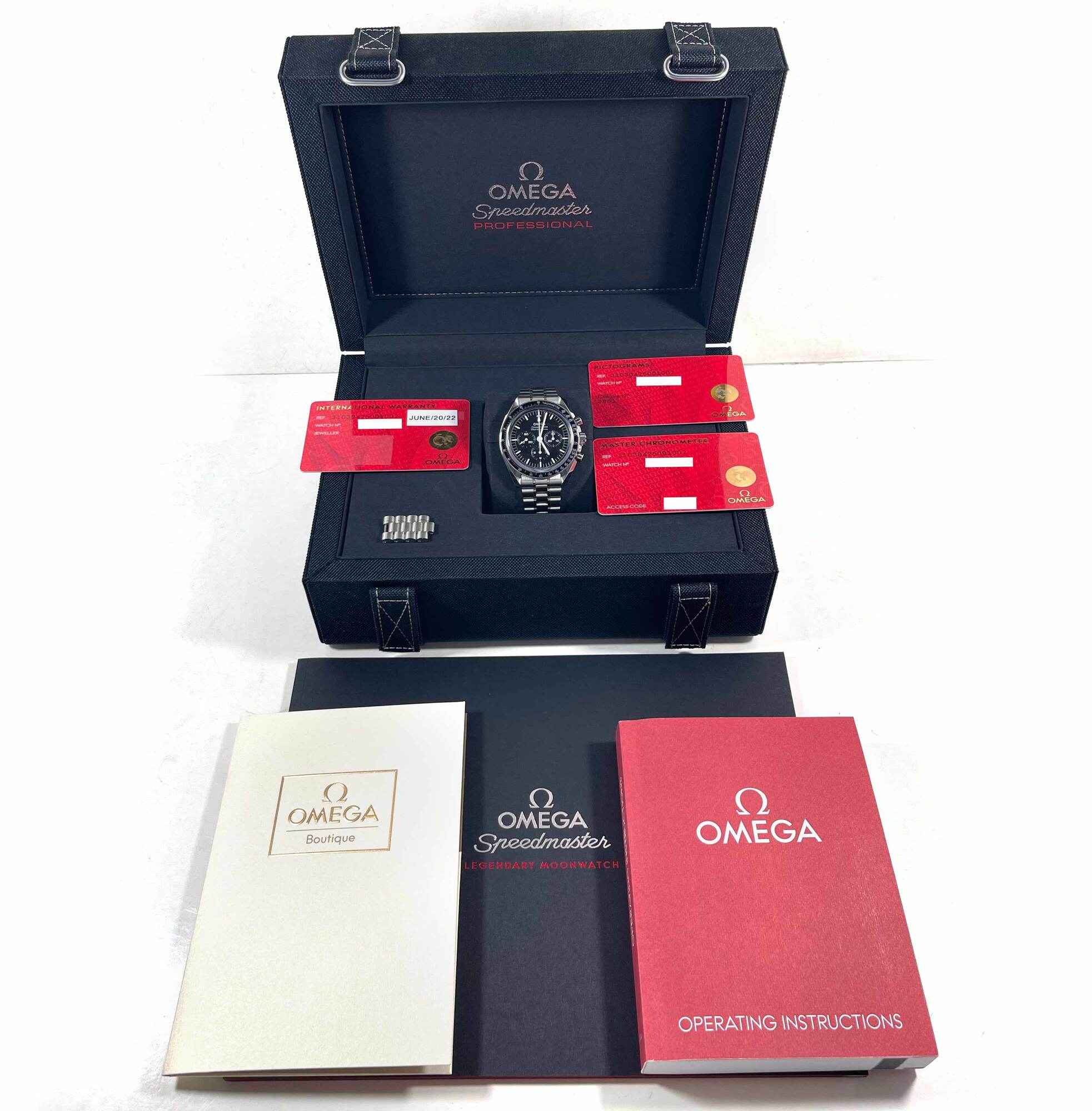this omega is in excellent condition and comes with its box, booklets, spare links, and warranty cards dated june 20th, 2022 as shown in the pictures attached. This watch is in stock and available to ship immediately!