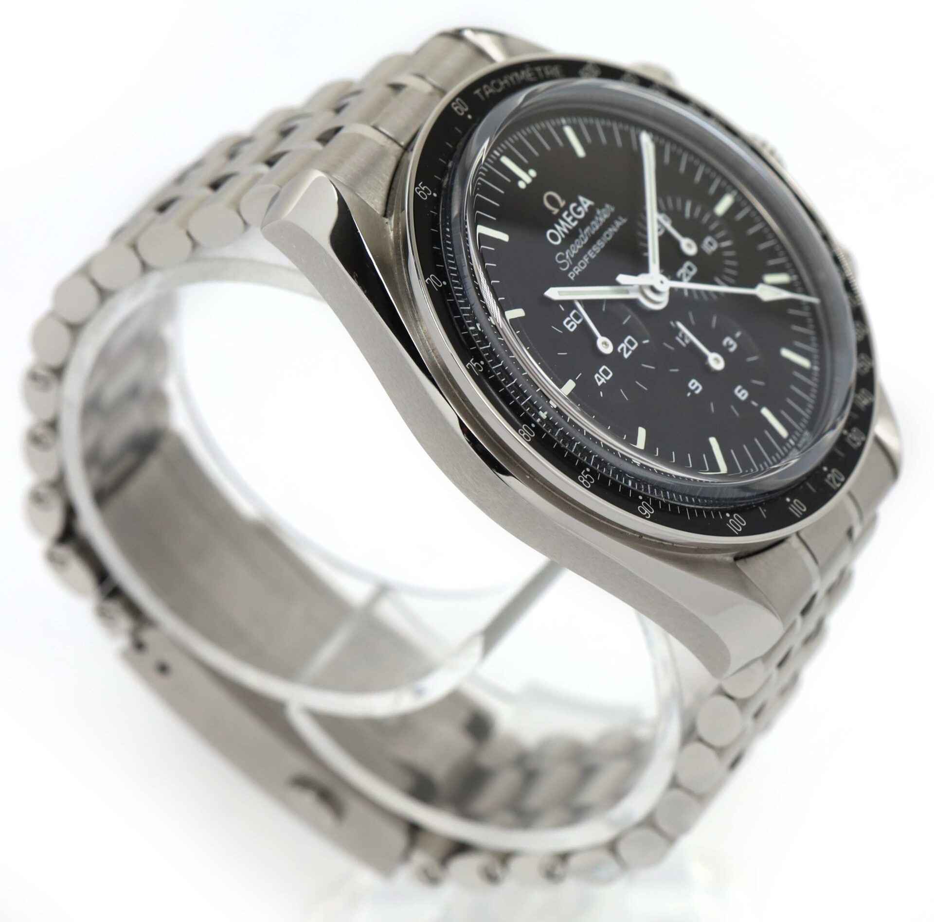 This Omega watch is in excellent condition and comes with its box, booklets, spare links, and warranty cards dated October 19th, 2021. This speedmaster features a stainless steel case and bracelet that surround a black d...