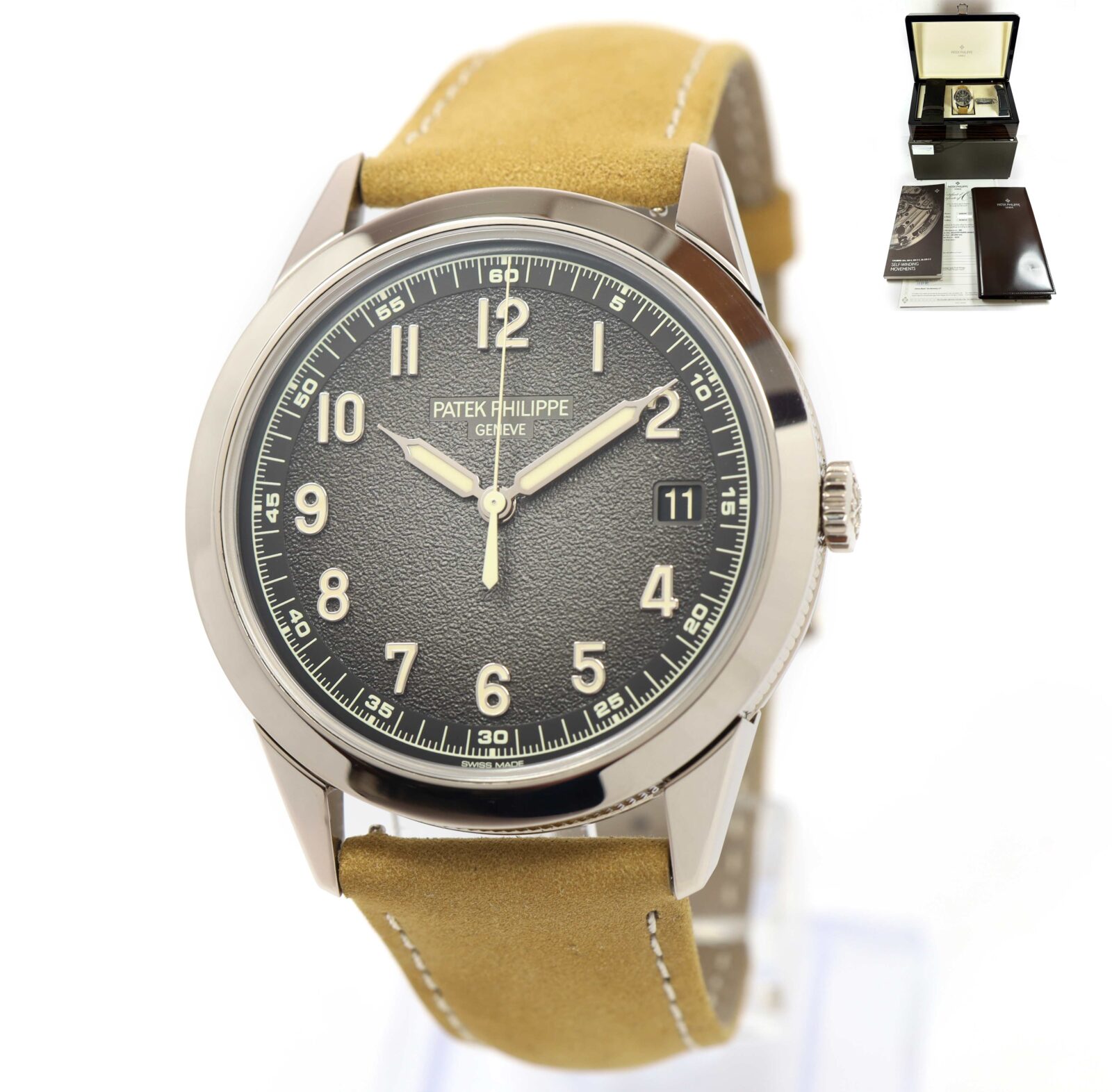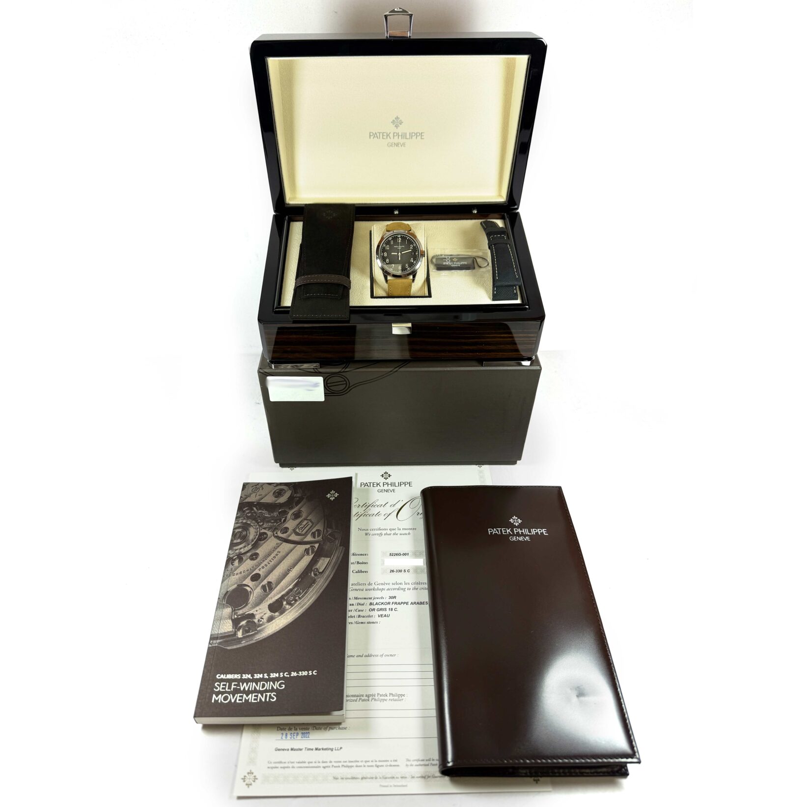 this patek philippe watch is in excellent overall condition and comes with its box, booklets, hang tag, one additional strap, and warranty paper dated september 28th, 2022 as shown in the pictures attached. This watch is in stock and available to ship immediately!