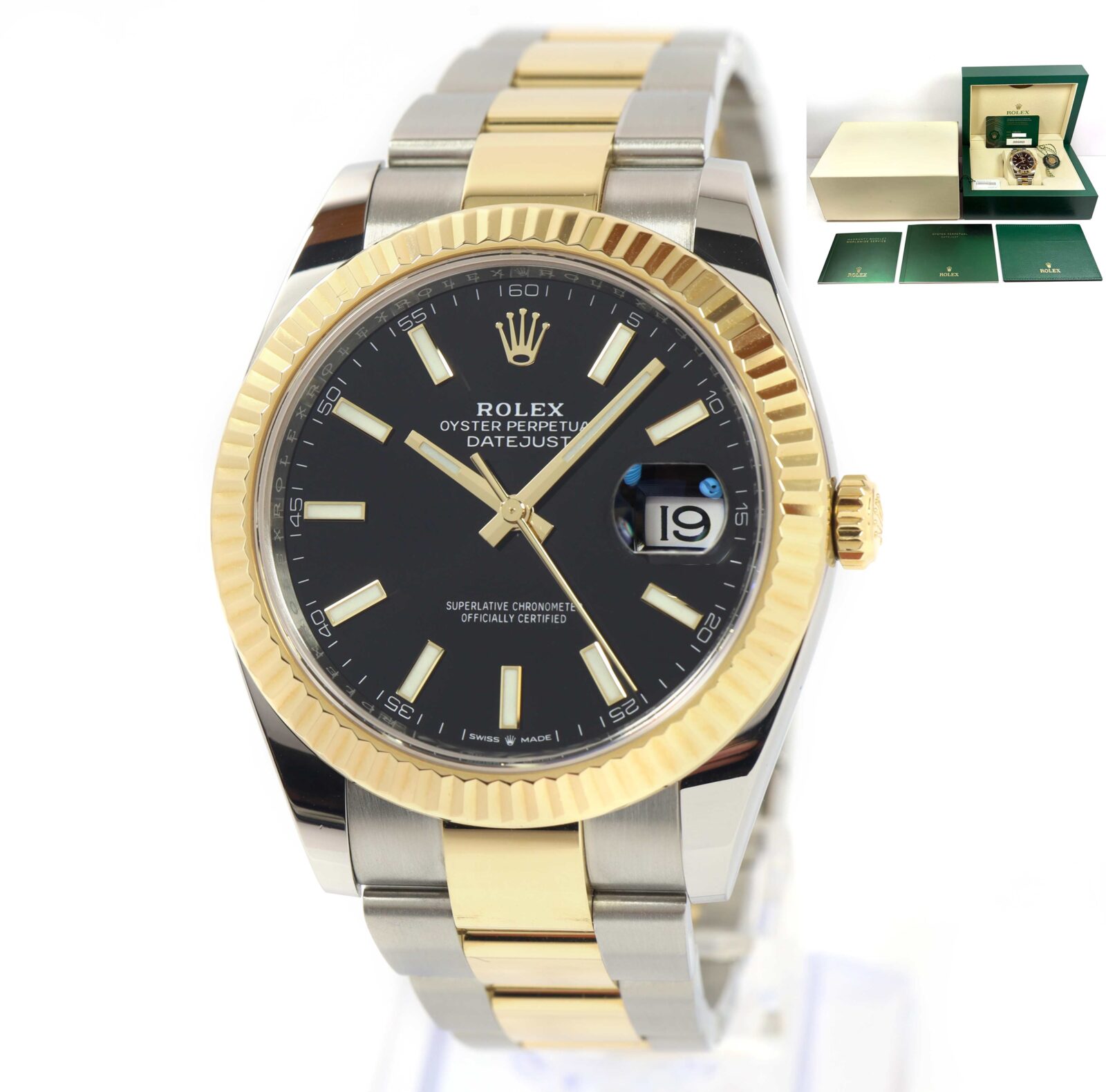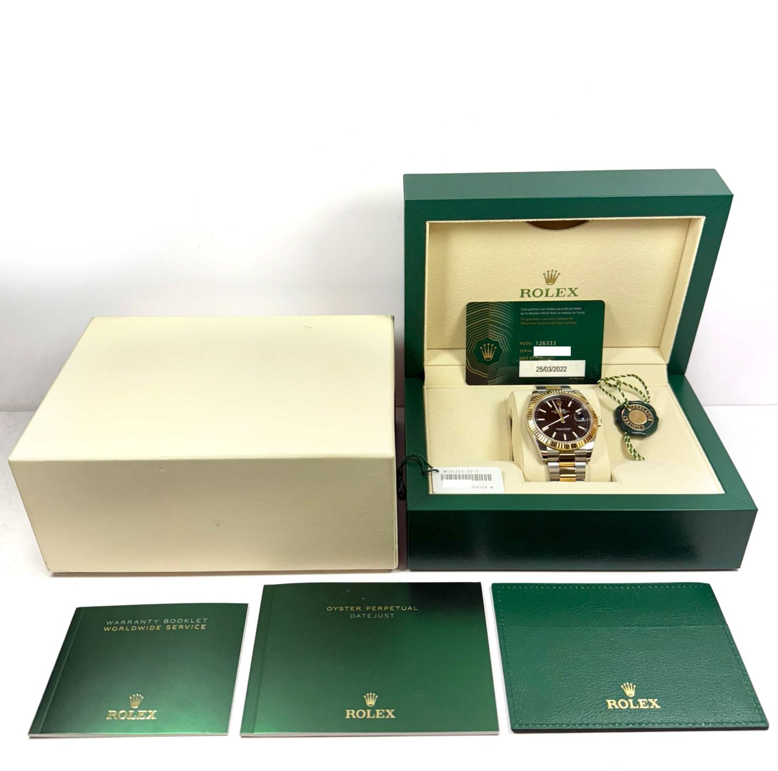 this rolex is in excellent overall condition showing some light signs of surface wear consistent with preowned watches. This comes with its box, booklets, hang tags, and warranty card dated march 25th, 2022 as shown in the pictures attached. This watch is in stock and available to ship immediately!
