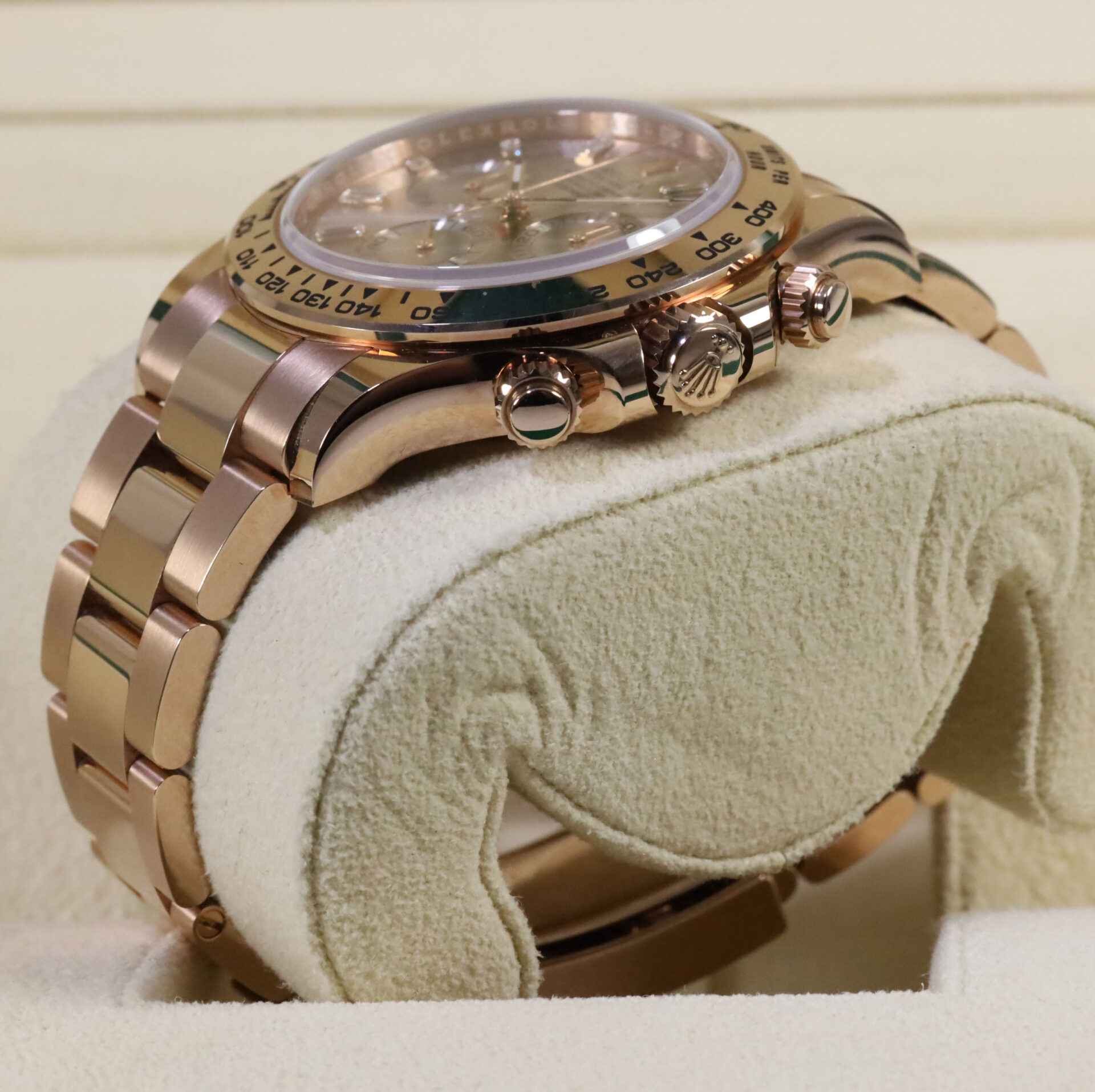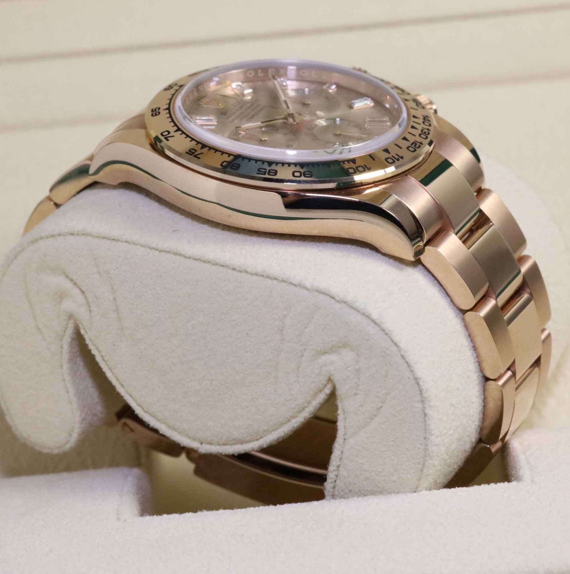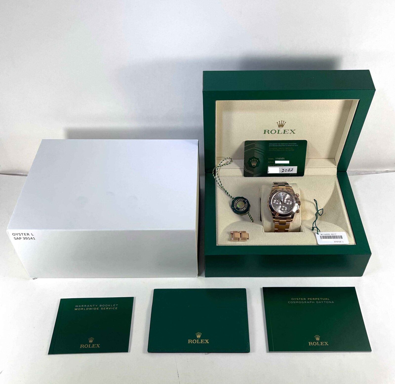 Read Morethis rolex is in excellent condition and comes with box, papers, hang tags, spare links, and warranty card dated 2022. This watch features a rose gold case that surrounds a factory set baguette diamond dial. This watch is in stock and available to ship immediately!