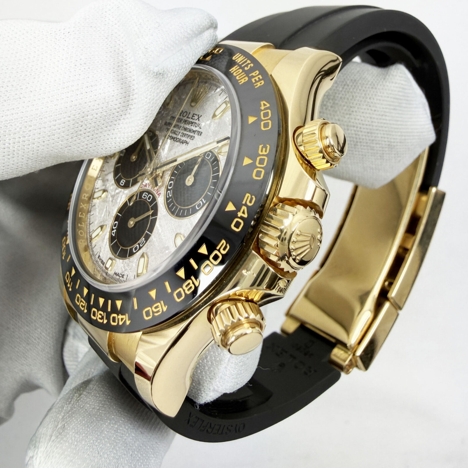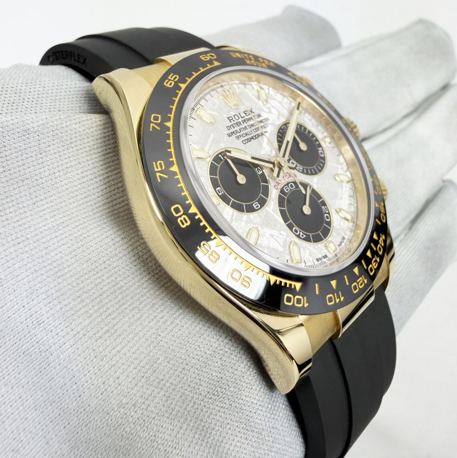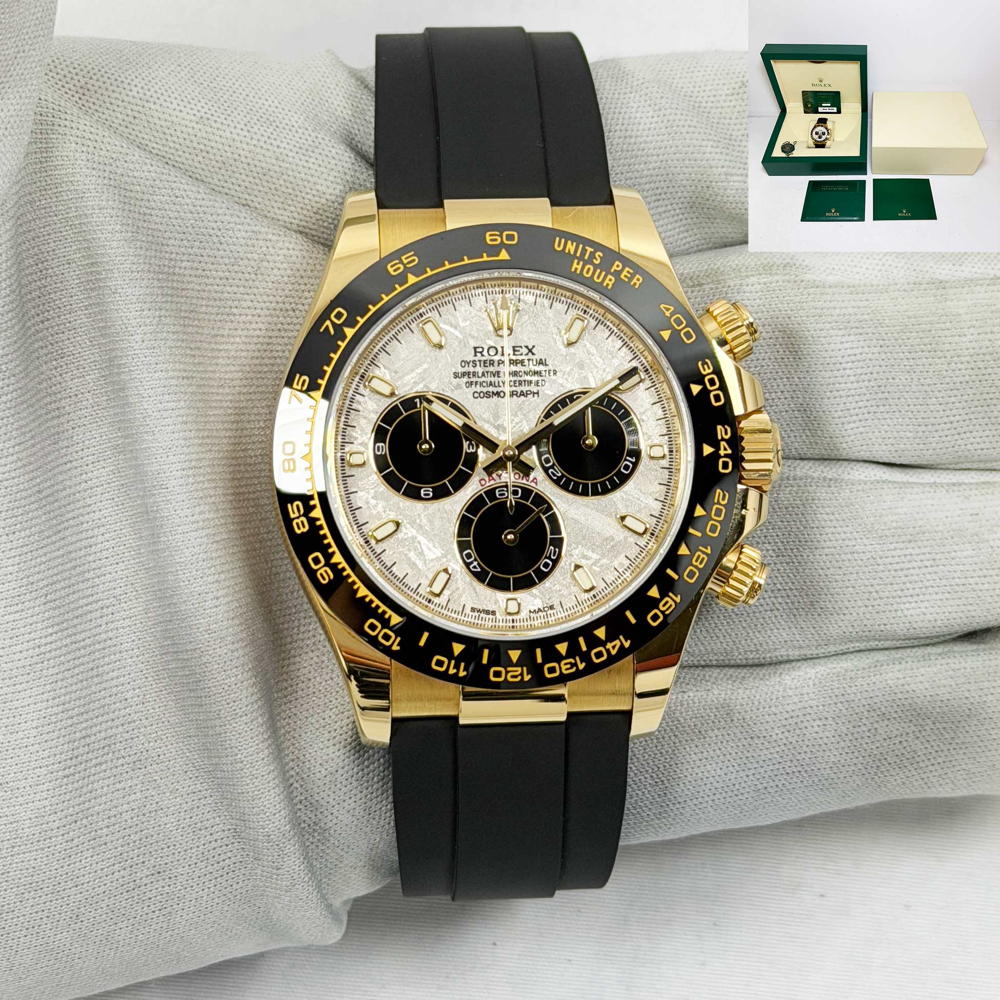 This Rolex Daytona watch comes with its box, hangtag, booklets, and warranty card dated December, 2022. This watch comes with its original receipt that indicates the meteorite dial is original to the watch. The oysterflex band on this watch is a size D/F. The ...