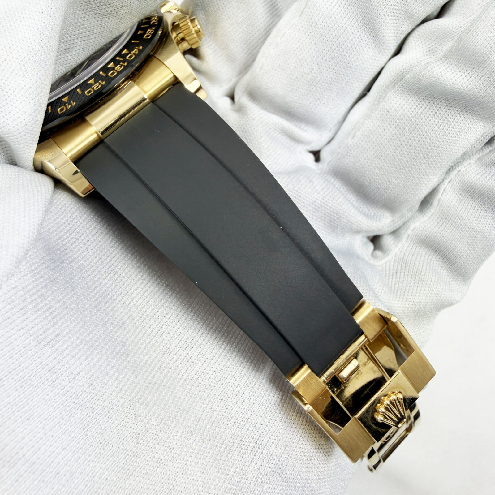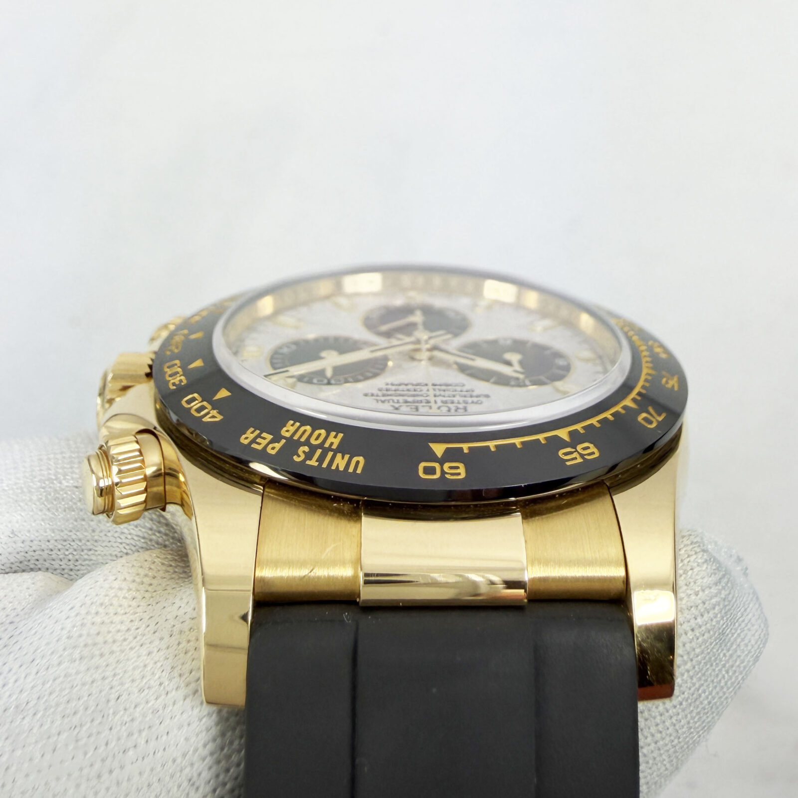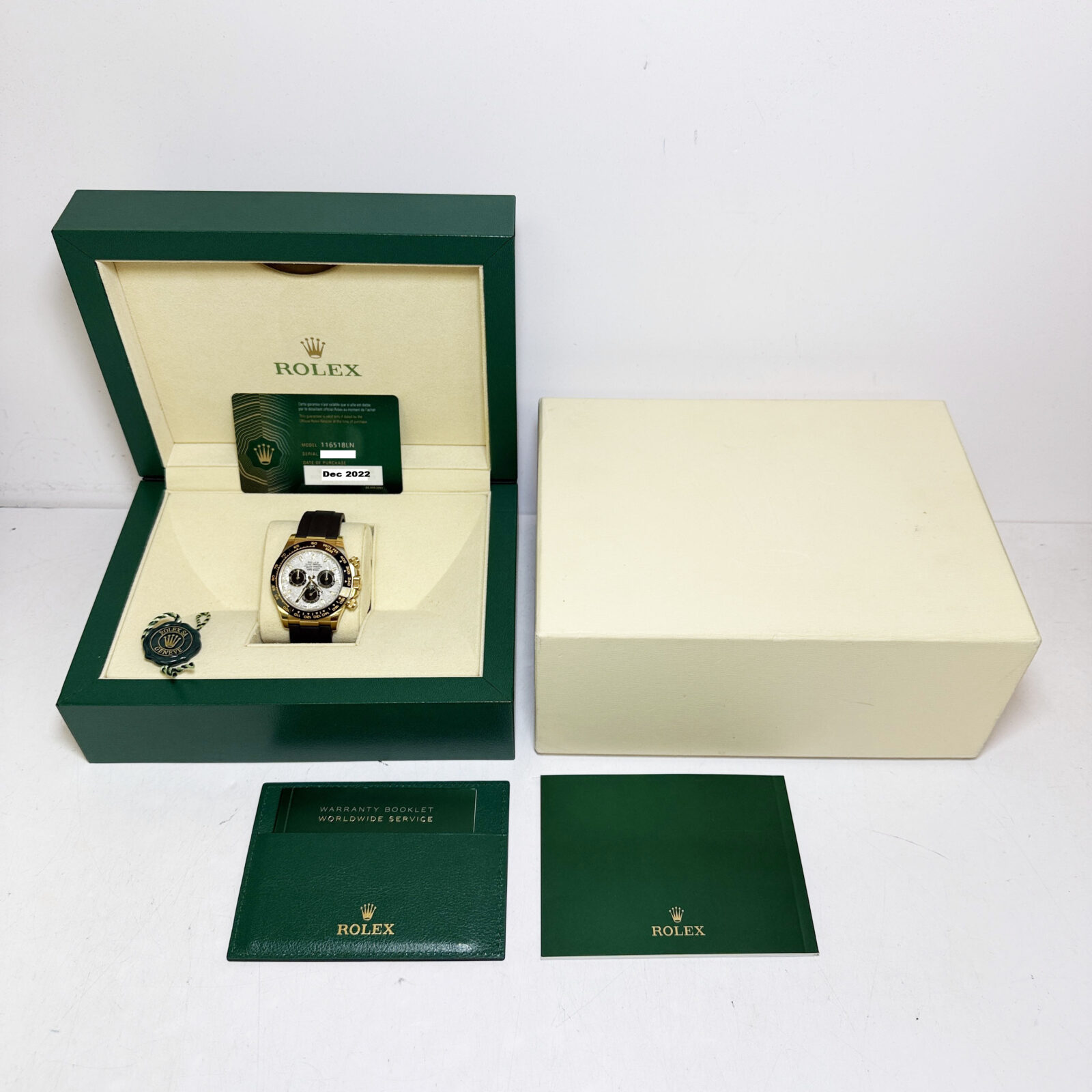 This Rolex Daytona watch comes with its box, hangtag, booklets, and warranty card dated December, 2022. This watch comes with its original receipt that indicates the meteorite dial is original to the watch. The oysterflex band on this watch is a size D/F. The ...
